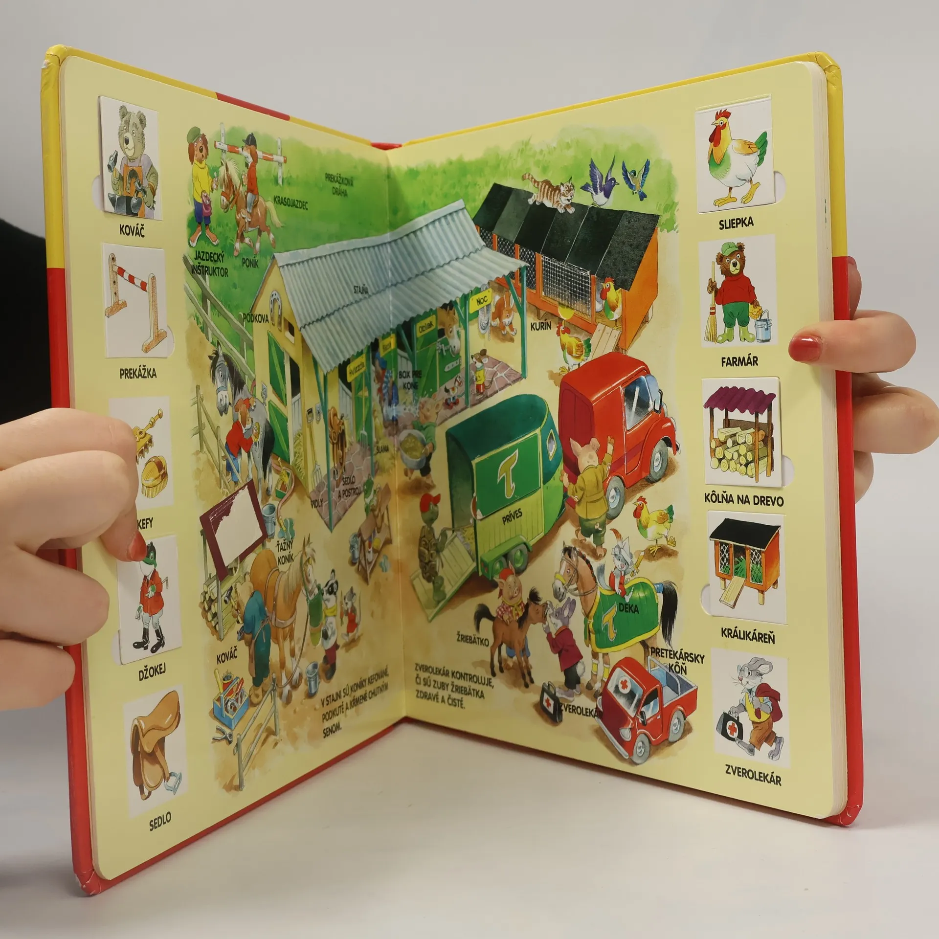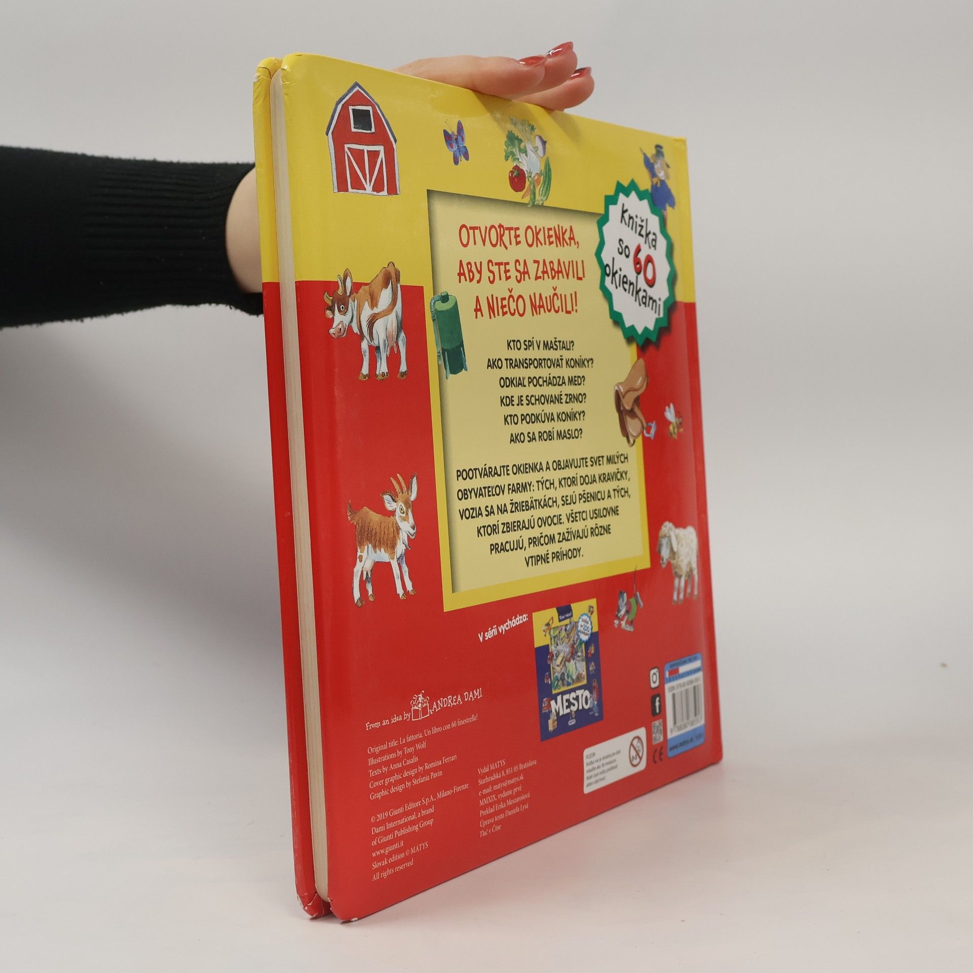 Kto spí v maštali? Ako transportovať koníky? Odkiaľ pochádza med? Kde je schované zrno? Kto podkúva koníky? Ako sa robí maslo? Pootvárajte okienka a objavujte svet milých obyvateľov farmy: tých, ktorí doja kravičky, vozia sa na žriebätkách, sejú pšenicu a tých, ktorí zbierajú ovocie. Všetci usilovne pracujú, pričom zažívajú rôzne vtipné príhody. Preklad Erika Meszarošová