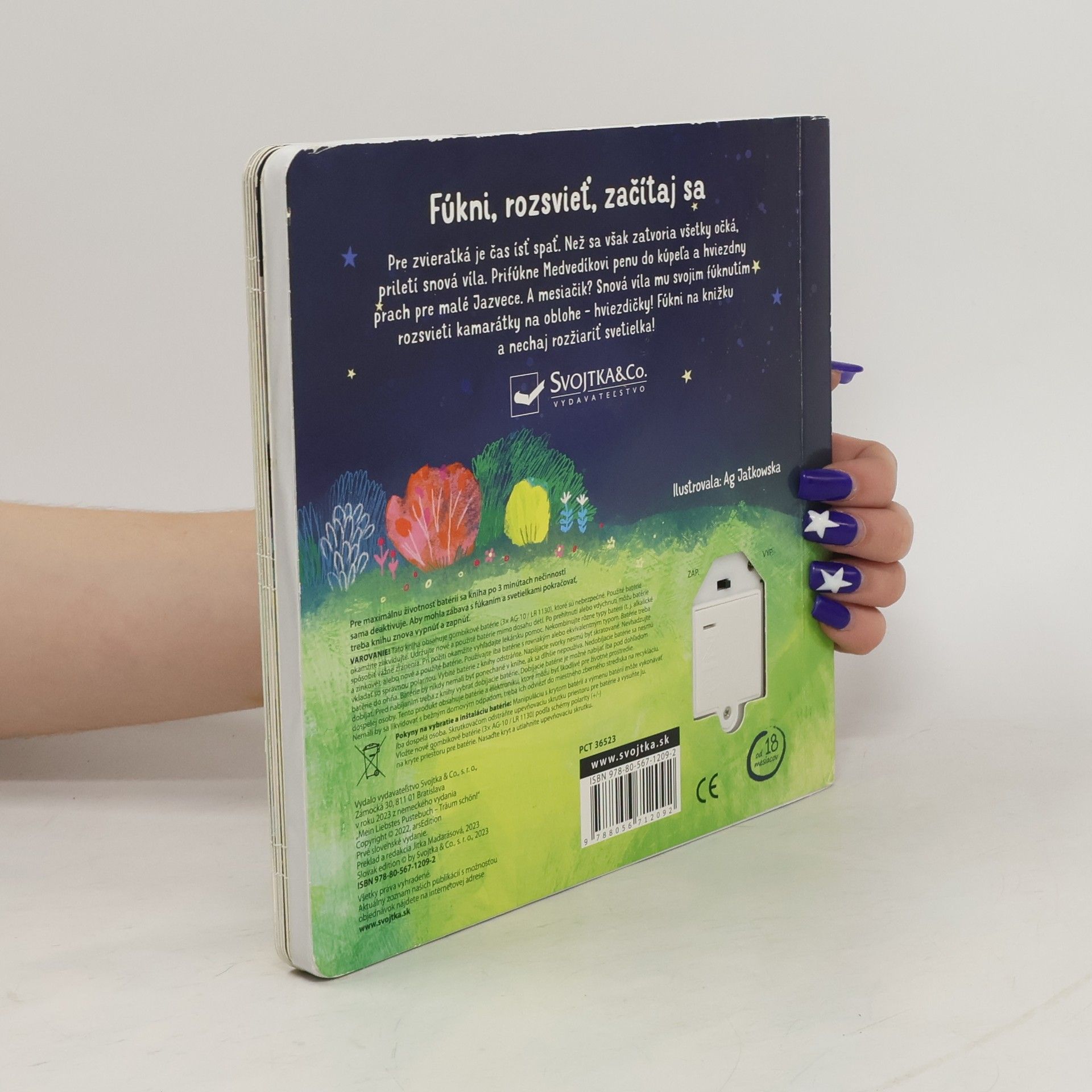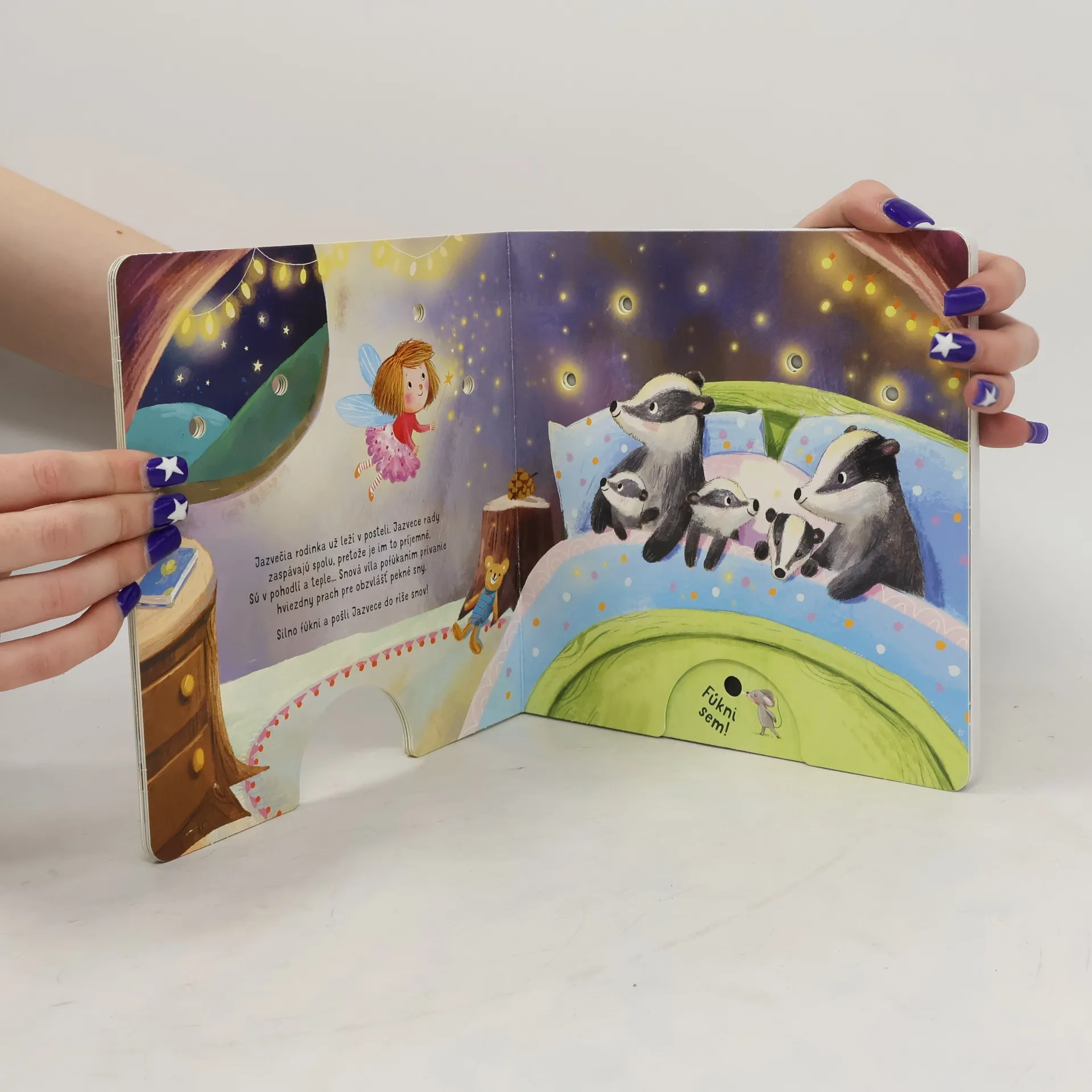 Fúkni, rozsvieť, začítaj sa - fúknutím rozsvieť svetielka. Pre zvieratká je čas ísť spať. Ale než sa zatvoria všetky očká, priletí snová víla. Prifúkne Medvedíkovi penu do kúpeľa a hviezdny prach pre malé Jazvece. A mesiačik? Snová víla mu svojím fúknutím rozsvieti kamarátky na oblohe - hviezdičky! Fúkni na knižku a nechaj aj ty rozžiariť svetielka!