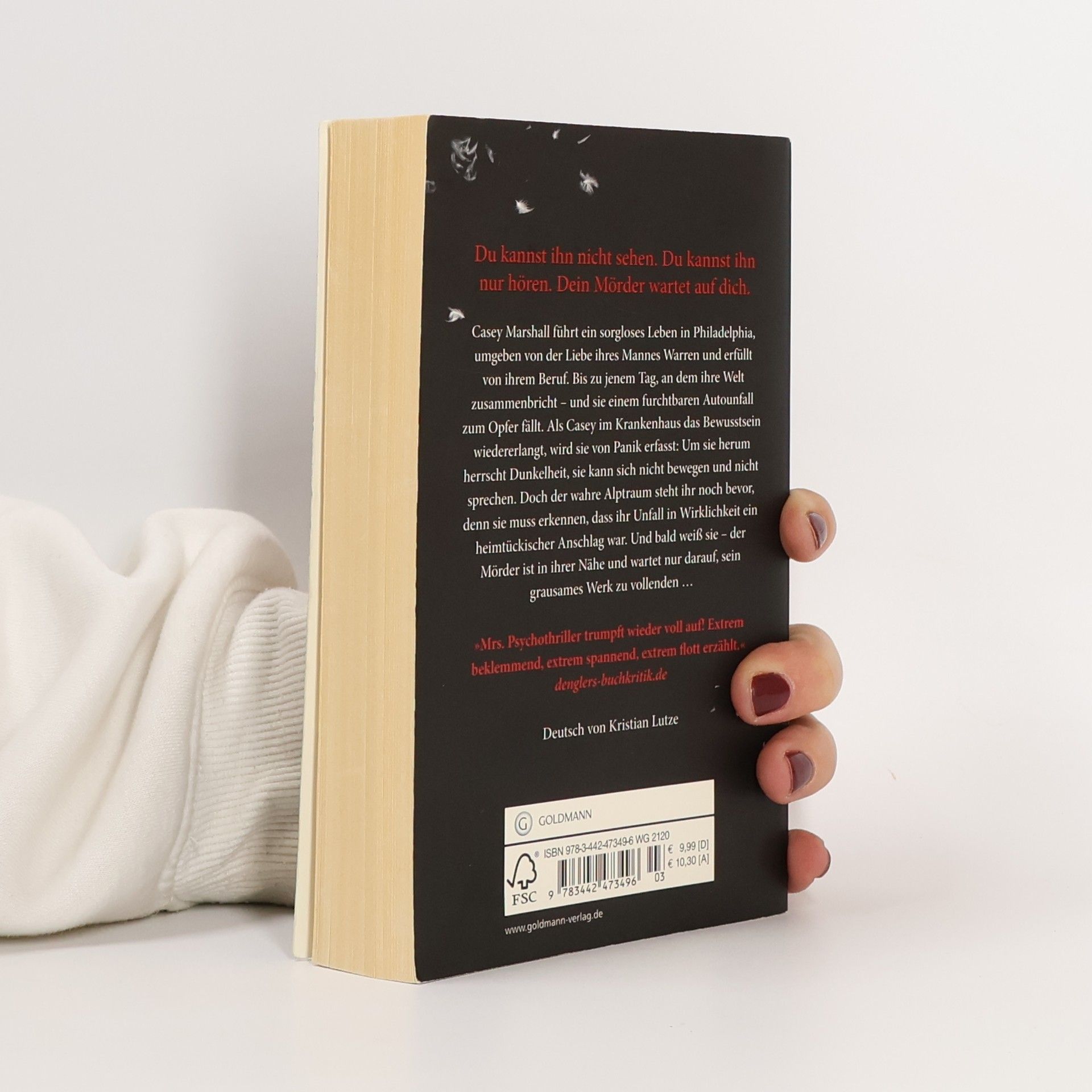 Du kannst ihn nicht sehen. Du kannst ihn nur hören. Dein Mörder wartet auf dich ... Casey Marshall führt ein sorgloses Leben in Philadelphia, umgeben von der Liebe ihres Mannes Warren und erfüllt von ihrem Beruf. Bis zu jenem Tag, an dem ihre Welt zusammenbricht – und sie einem furchtbaren Autounfall zum Opfer fällt. Als Casey im Krankenhaus das Bewusstsein wiedererlangt, wird sie von Panik erfasst: Um sie herum herrscht Dunkelheit, sie kann sich nicht bewegen und nicht sprechen. Doch der wahre Alptraum steht ihr noch bevor, denn sie muss erkennen, dass ihr Unfall in Wirklichkeit ein heimtückischer Anschlag war. Und bald weiß sie – der Mörder ist in ihrer Nähe und wartet nur darauf, sein grausames Werk zu vollenden …