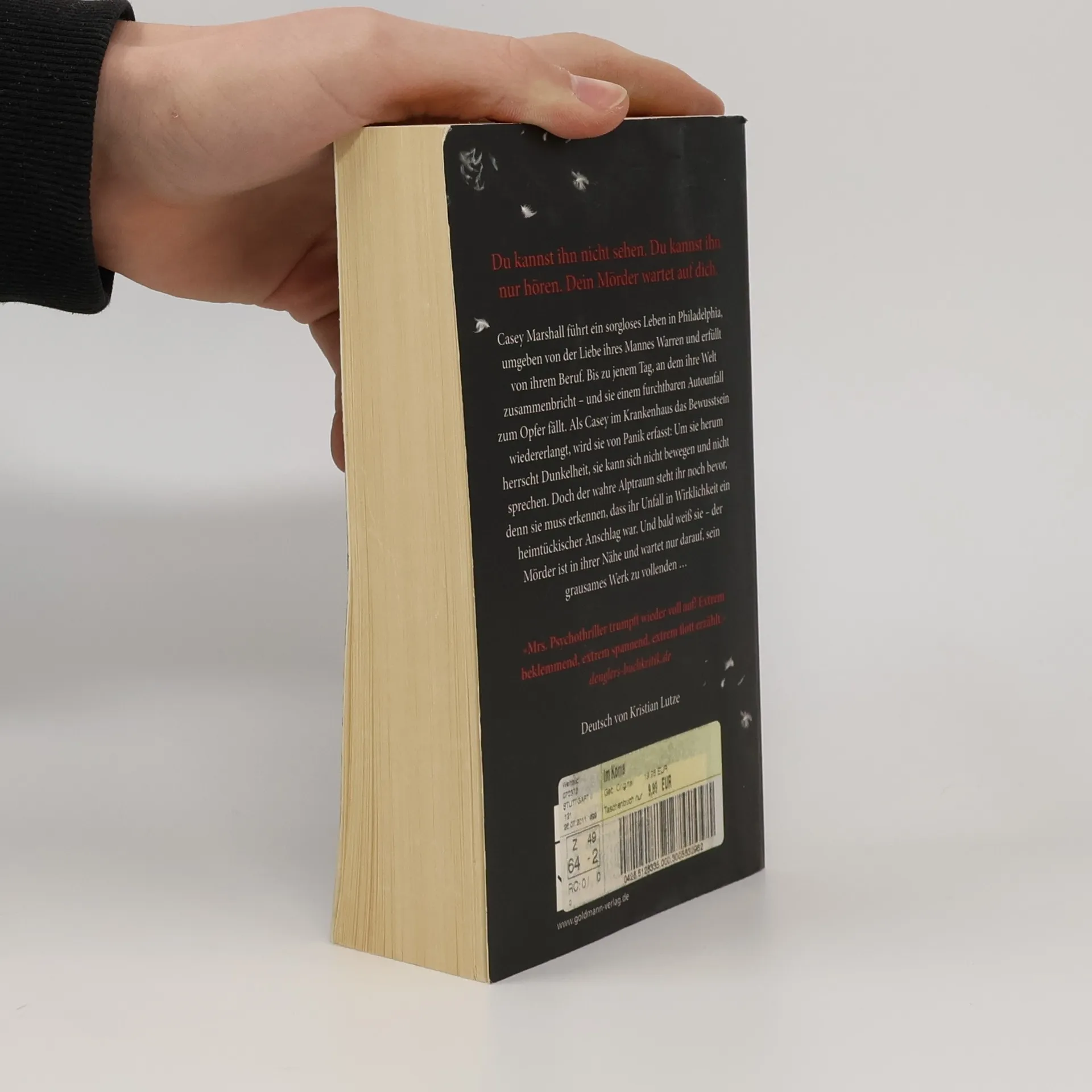 Du kannst ihn nicht sehen. Du kannst ihn nur hören. Dein Mörder wartet auf dich ... Casey Marshall führt ein sorgloses Leben in Philadelphia, umgeben von der Liebe ihres Mannes Warren und erfüllt von ihrem Beruf. Bis zu jenem Tag, an dem ihre Welt zusammenbricht – und sie einem furchtbaren Autounfall zum Opfer fällt. Als Casey im Krankenhaus das Bewusstsein wiedererlangt, wird sie von Panik erfasst: Um sie herum herrscht Dunkelheit, sie kann sich nicht bewegen und nicht sprechen. Doch der wahre Alptraum steht ihr noch bevor, denn sie muss erkennen, dass ihr Unfall in Wirklichkeit ein heimtückischer Anschlag war. Und bald weiß sie – der Mörder ist in ihrer Nähe und wartet nur darauf, sein grausames Werk zu vollenden …