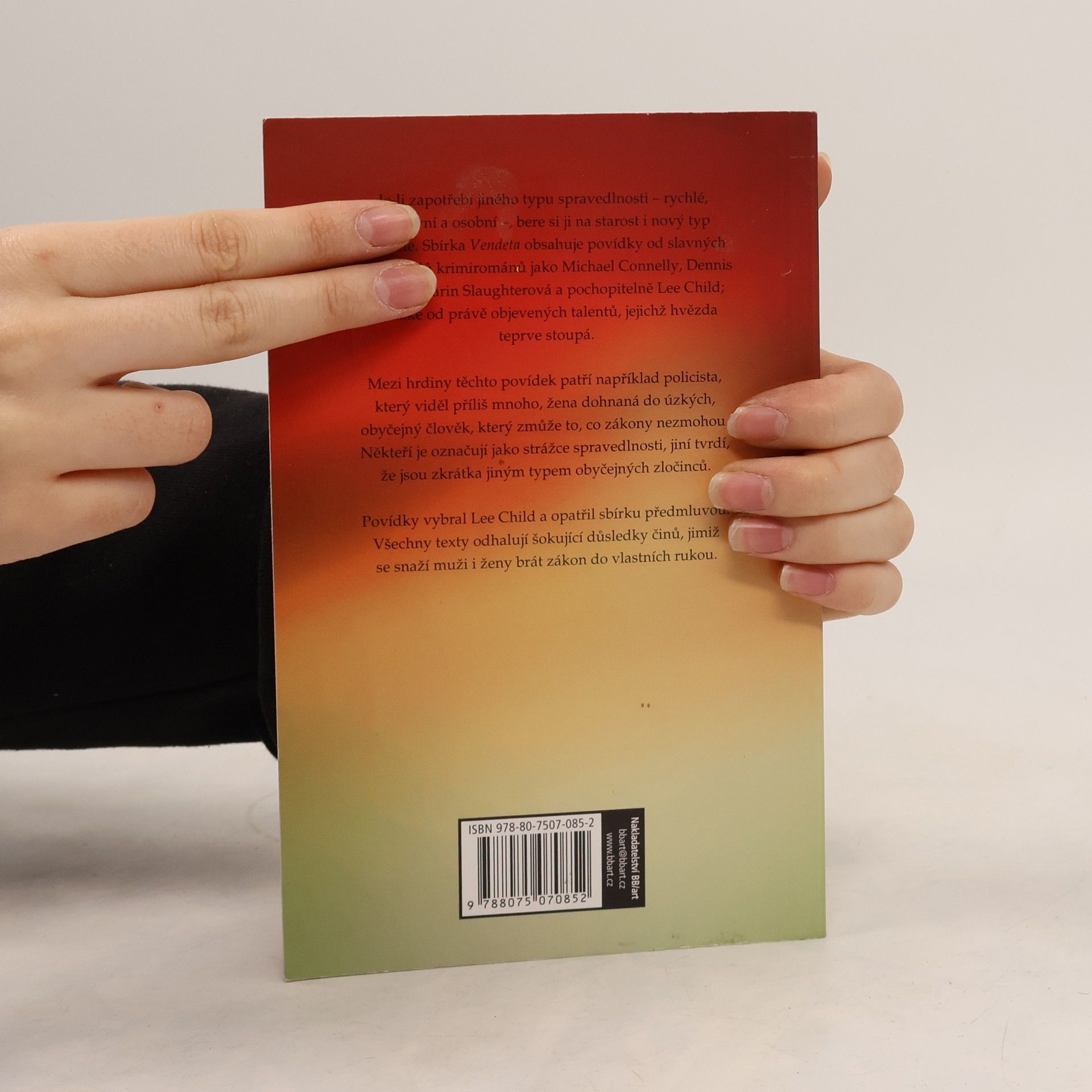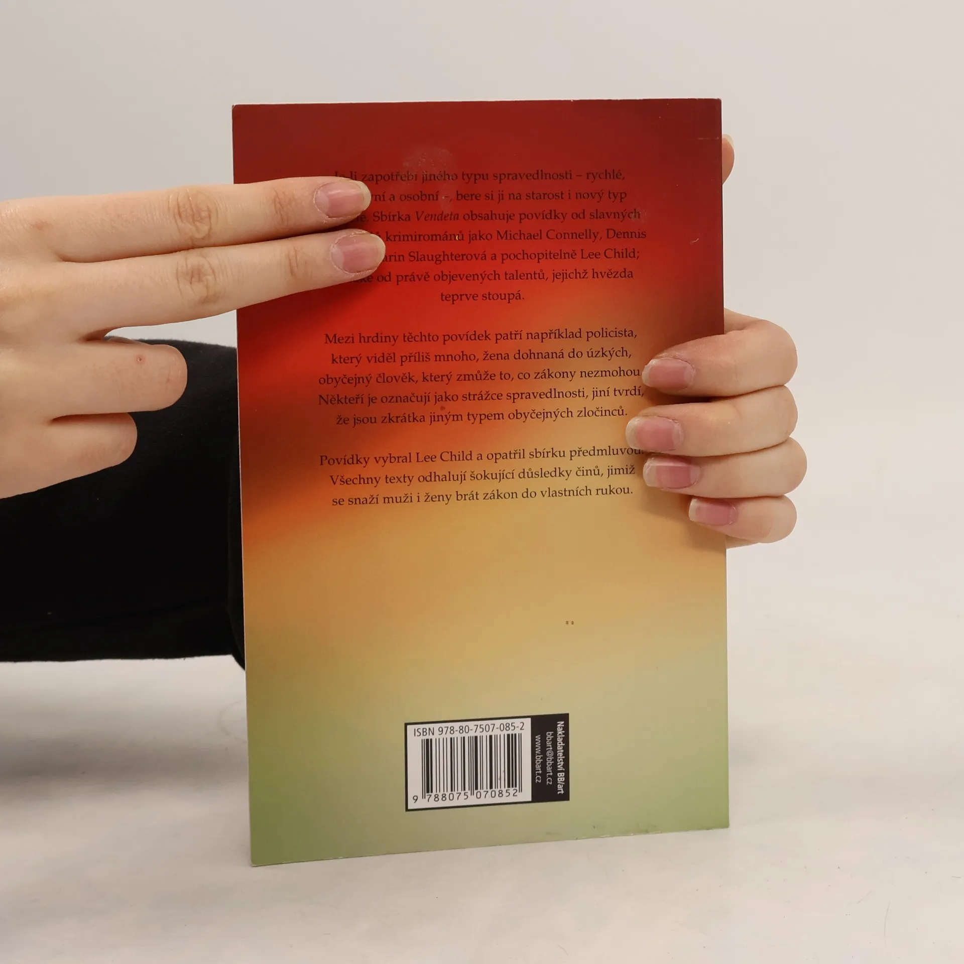 Je-li zapotřebí jiného typu spravedlnosti – rychlé, efektivní a osobní –, bere si ji na starost i nový typ mstitele. Sbírka Vendeta obsahuje nové povídky od slavných spisovatelů krimirománů jako Michael Connelly, Dennis Lehane, Karin Slaughterová a pochopitelně Lee Child; ale také od právě objevených talentů, jejichž hvězda teprve stoupá. Mezi hrdiny těchto povídek patří například policista, který viděl příliš mnoho, žena dohnaná do úzkých, obyčejný člověk, který zmůže to, co zákony nezmohou. Někteří je označují jako strážce spravedlnosti, jiní tvrdí, že jsou zkrátka jiným typem obyčejných zločinců. Povídky vybral Lee Child a opatřil sbírku předmluvou. Všechny texty odhalují šokující důsledky činů, jimiž se snaží muži i ženy brát zákon do vlastních rukou. 2. vydání.
