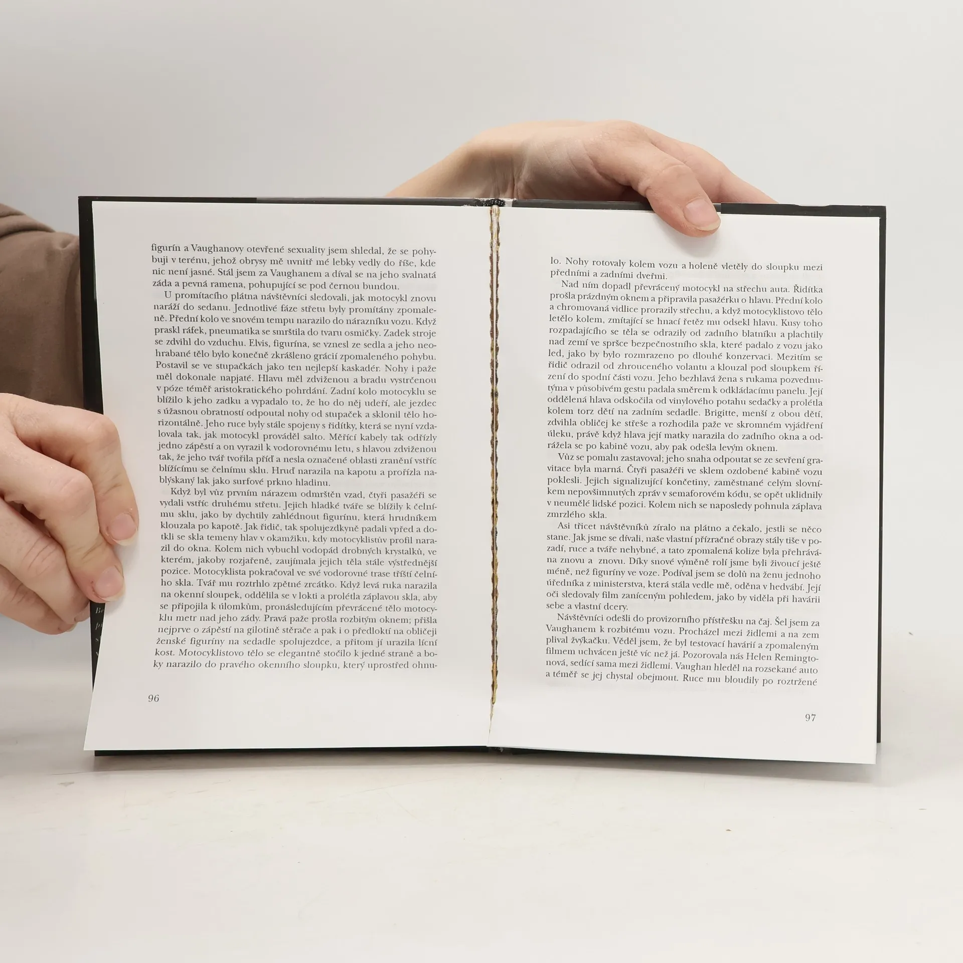 Halucinativní román o fascinaci automobily, rychlostí, dálničními nehodami a jejich spojení s erotickým životem hlavních hrdinů. Vypravěč se po své autonehodě opakovaně setkává s mužem, který je přímo posedlý a sexuálně motivovaný obětmi nehod a nabouranými vozy. Posléze všechny postavy románu spojuje posedlost sexem v rychlých vozech a sugestivní představy šílených autonehod a zdeformovaných těl. Po literární stránce je román velmi působivý a bývá považován za kultovní knihu undergroundu.