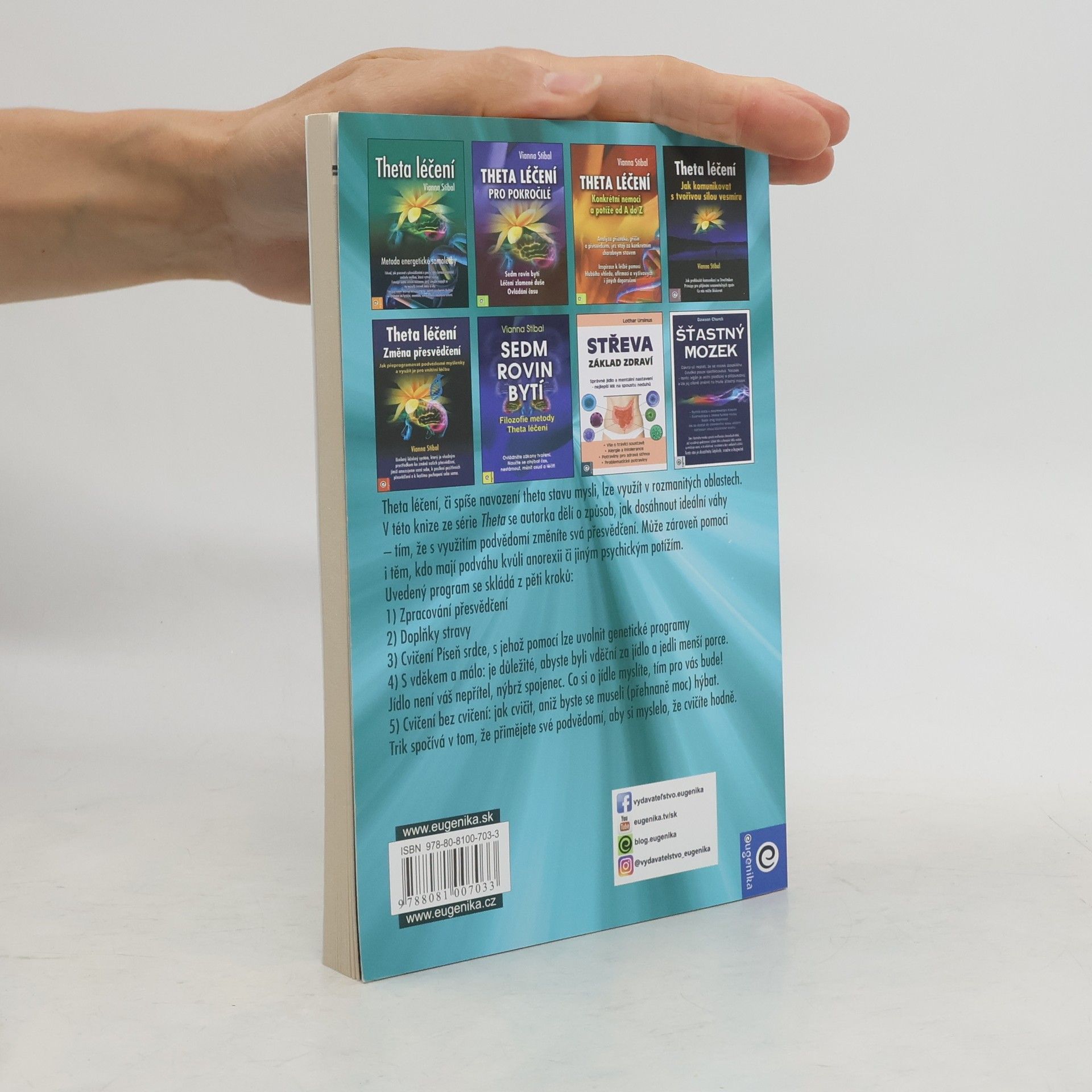Nechte mysl, aby pracovala za vás! Theta léčení, či spíše navození theta stavu mysli, lze využít v rozmanitých oblastech. V této knize ze série Theta se autorka dělí o způsob, jak dosáhnout ideální váhy – tím, že s využitím podvědomí změníte svá přesvědčení. Může zároveň pomoci i těm, kdo mají podváhu kvůli anorexii či jiným psychickým potížím. Uvedený program se skládá z pěti kroků: 1) Zpracování přesvědčení 2) Doplňky stravy 3) Cvičení Píseň srdce, s jehož pomocí lze uvolnit genetické programy 4) S vděkem a málo: je důležité, abyste byli vděční za jídlo a jedli menší porce. Jídlo není váš nepřítel, nýbrž spojenec. Co si o jídle myslíte, tím pro vás bude! 5) Cvičení bez cvičení: jak cvičit, aniž byste se museli (přehnaně moc) hýbat. Trik spočívá v tom, že přimějete své podvědomí, aby si myslelo, že cvičíte hodně.