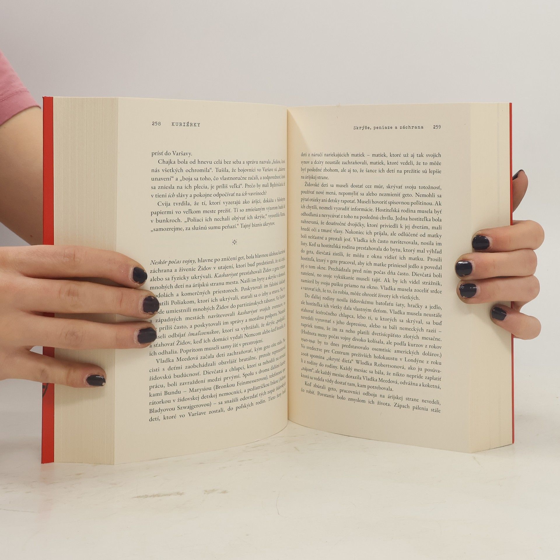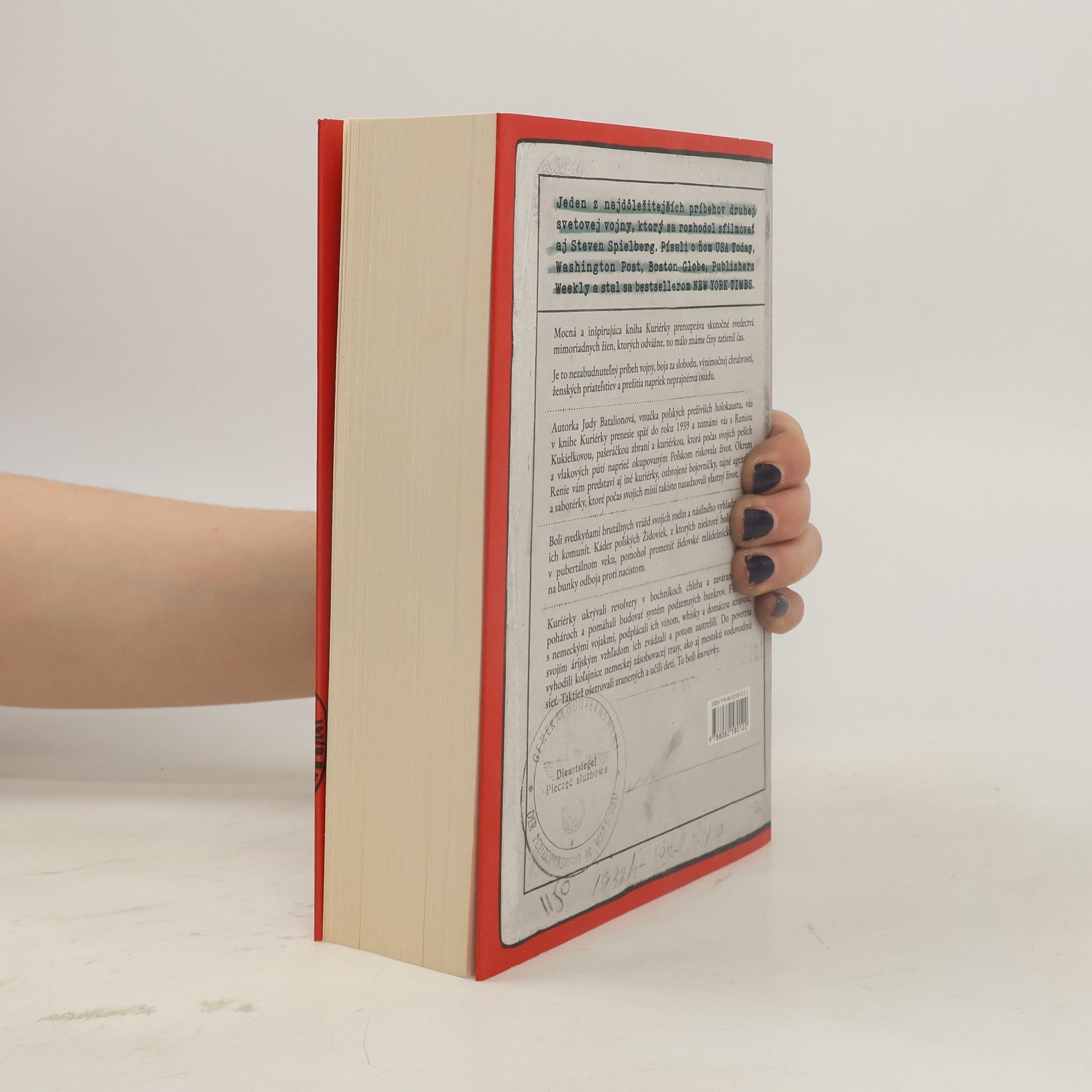 Odvážne „dievčatá z geta” s nervami z ocele podplácali gestapo, flirtovali s nemeckými vojakmi a pašovali ľudí, hotovosť, dokumenty, informácie a zbrane. Šírili pravdu o krutostiach páchaných na Židoch. Tento významný príbeh druhej svetovej vojny, ktorý sa rozhodol sfilmovať aj Steven Spielberg, sa stal bestsellerom NEW YORK TIMES a bol predmetom záujmu médií ako USA Today či Washington Post. Mocná a inšpirujúca kniha prerozpráva skutočné svedectvá mimoriadnych žien, ktorých odvážne, no málo známe činy zatienil čas. Autorka Judy Batalionová, vnučka poľských preživších holokaustu, prenáša čitateľov do roku 1939 a predstavuje Reniu Kukiełkovú, pašeráčku zbraní a kuriérku, ktorá riskovala život počas svojich misií naprieč okupovaným Poľskom. Okrem Renie sú tu aj iné kuriérky, ozbrojené bojovníčky a tajné agentky, ktoré sa odvážne postavili proti okupantom. Kuriérky ukrývali revolvery v bochníkoch chleba, podplácali vojakov a sabotovali nemecké zásobovacie trasy. Ošetrovali zranených a učili deti, pričom ich činy ostávajú nezabudnuteľné. Judy Batalionová, autorka a novinárka, žije v New Yorku so svojou rodinou.