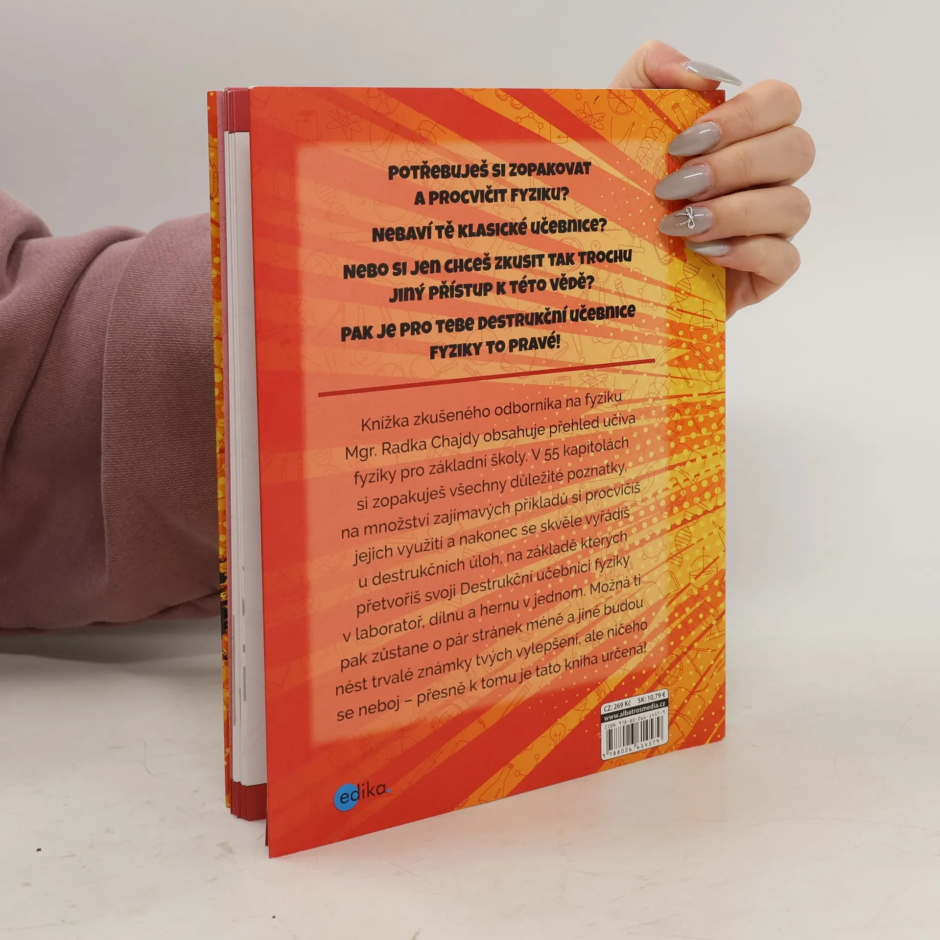 Knížka zkušeného odborníka na fyziku Mgr. Radka Chajdy obsahuje přehled učiva fyziky pro základní školy. V 55 kapitolách si zopakuješ všechny důležité poznatky, na množství zajímavých příkladů si procvičíš jejich využití a nakonec se skvěle vyřádíš u destrukčních úloh, na základě kterých přetvoříš svoji Destrukční učebnici fyziky v laboratoř, dílnu a hernu v jednom. Možná ti pak zůstane o pár stránek méně a jiné budou nést trvalé známky tvých vylepšení, ale ničeho se neboj – přesně k tomu je tato kniha určená!