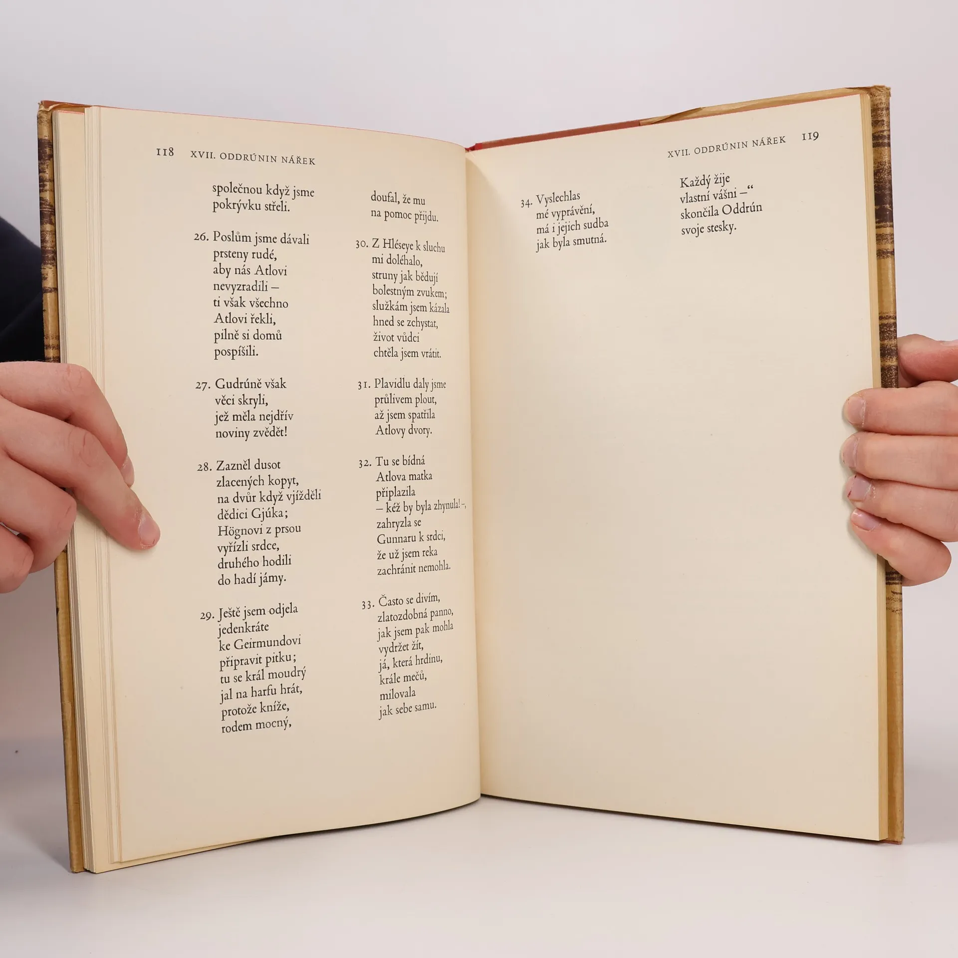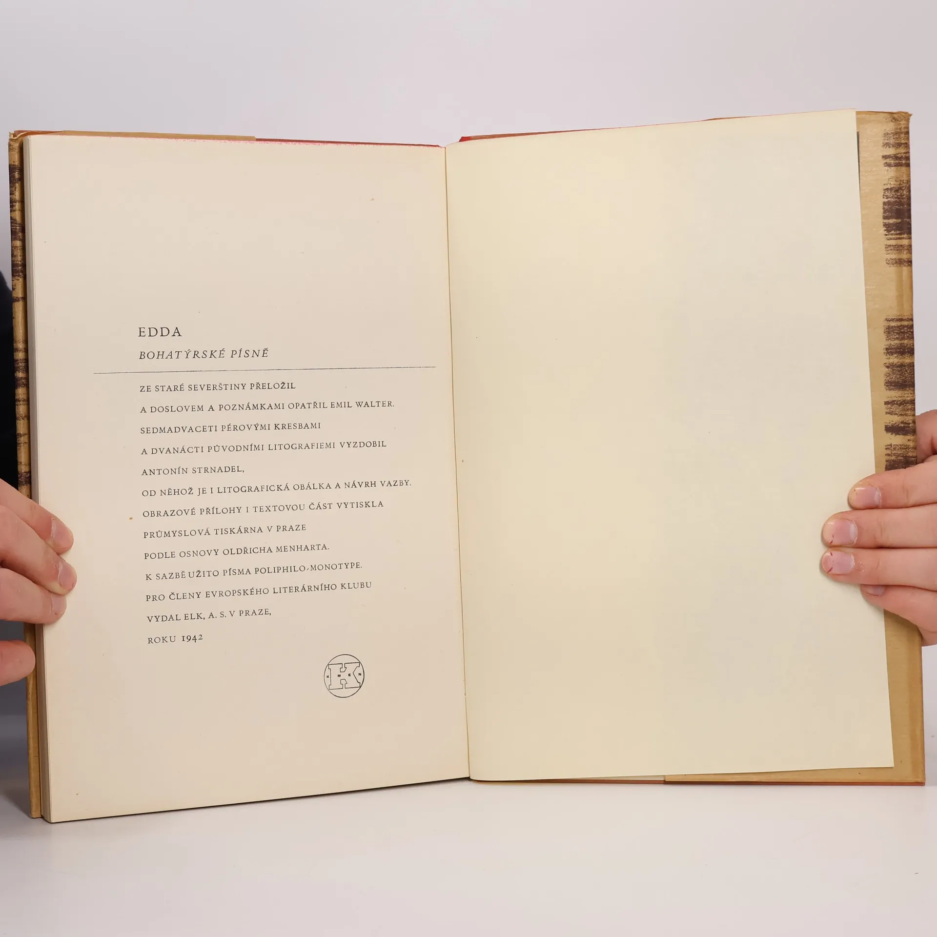 Ze staré severštiny přeložil a doslovem a poznámkami opatřil Emil Walter. Sedmadvaceti pérovými kresbami a dvanácti původními litografiemi vyzdobil Antonín Strnadel. Sbírka eddických islandských epických mytologických a hrdinských písní. Edda znamená islandsky prababička a toto slovo mohlobýt použito s významem prazáklad skaldské poesie. Obsah: - Píseň o Völundovi (Völundarkviða) - Píseň o Helgovi, synu Hjörvardovu (Helgakviða Hjörvarðssonar) - První píseň o Helgovi, Hundingobijci (Helgakviða Hundingsbana I) - Druhá píseň o Helgovi, Hundingobijci (Helgakviða Hundingsbana II) - O smrti Sinfjötlově - Grípova věštba (Grípisspá) - Píseň o Reginovi (Reginsmál) - Píseň o Fáfnovi (Fáfnismál) - Píseň o Sigrdrífě (Sigrdrífumál) - Zlomek písně o Sigurdovi (Brot af Sigurðarkviðu) - První píseň o Gudrúně (Guðrúnarkviða I) - Krátší píseň o Sigurdovi (Sigurðarkviða inn skamma) - Brynhildina cesta do pekel (Helreið Brynhildar) - Zánik Niflungů - Druhá neboli stará píseň o Gudrúně (Guðrúnarkviða II) - Třetí píseň o Gudrúně (Guðrúnarkviða III) - Oddrúnin nářek (Oddrúnargrátr) - Píseň o Atlovi (Atlakviða) - Grónská píseň o Atlovi (Atlamál in grænlensku) - Gudrúnino popouzení (Guðrúnarhvöt) - Píseň o Hamdirovi (Hamdismál) - Píseň o Grottu (Grottasöngr)