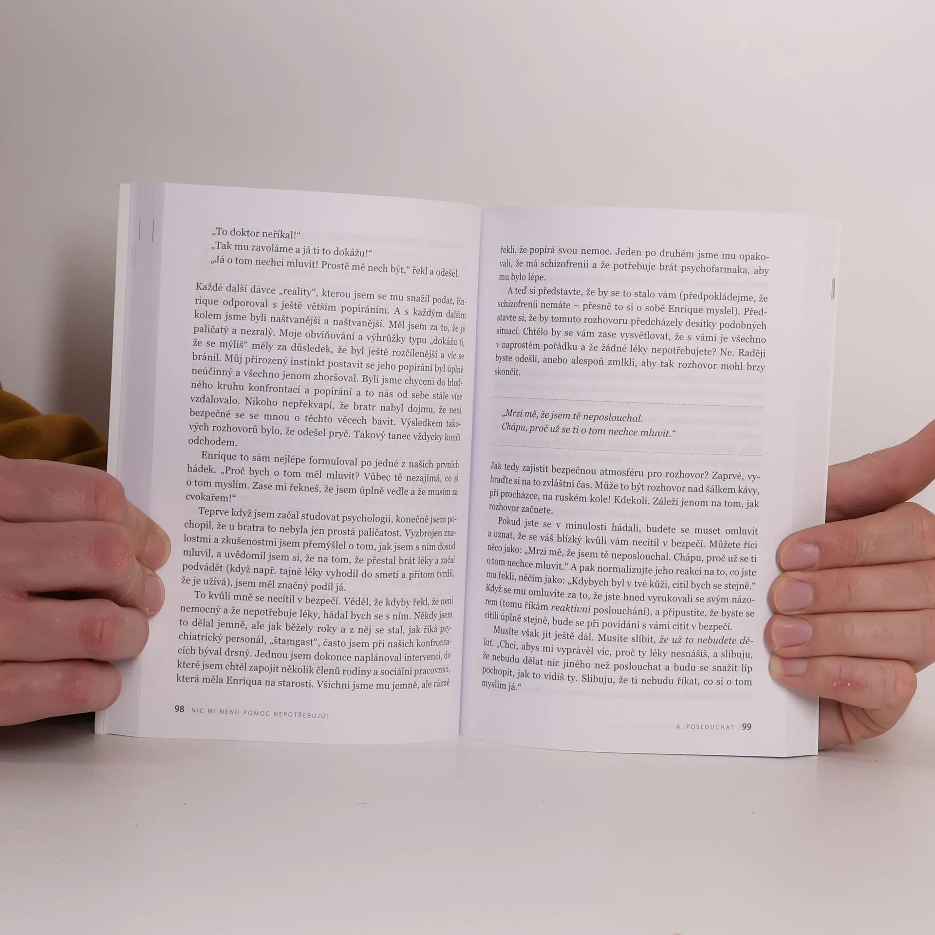 Mnozí lidé, kteří trpí duševní poruchou, si myslí, že jim nic není a že nepotřebují pomoc. U lidí se schizofrenií a bipolární afektivní poruchou se jedná o zhruba polovinu, podobně jsou na tom lidé se závislostí či poruchou příjmu potravy, a svůj stav často podcení i lidé s depresí nebo úzkostnou poruchou. Také lidé, u nichž se rozvíjí demence, mají často problém nahlédnout, že se jejich stav zhoršuje. Autor se ve své práci inspiroval životním příběhem svého bratra, který onemocněl schizofrenií, a na řadě příkladů z jejich společného života a ze své praxe ilustruje, jak složité je přimět člověka s duševní nemocí akceptovat léčbu. Knihu uvítají psychiatři, psychologové, blízcí lidí s duševní nemocí.