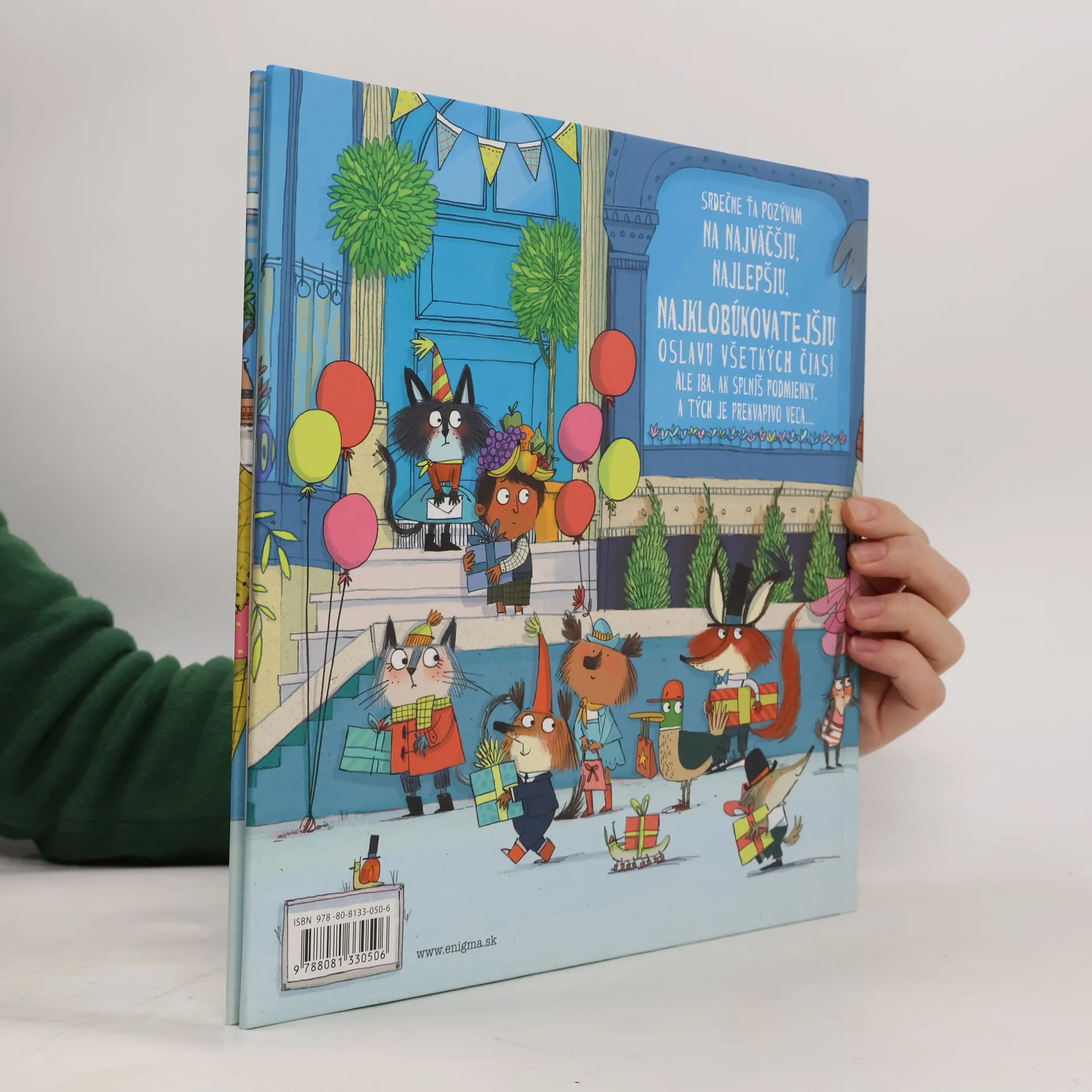 Srdečne ťa pozývam na najväčšiu, najlepšiu, najklobúkovatejšiu oslavu všetkých čias! Ale iba, ak splníš podmienky, a tých je prekvapivo veľa... Picture book s prekrásnymi obrázkami a dejom plnom humoru pre čitateľov 4 - 8 rokov. Ideálny prostriedok pre komunikáciu rodičov s deťmi, spoločnú zábavu a rozvíjanie obrazotvornosti detí. Málo textu a celostránkové plnofarebné obrázky posúvajúce dej dopredu. Využite túto príležitosť - keď vám deti podrastú, už nebude.
