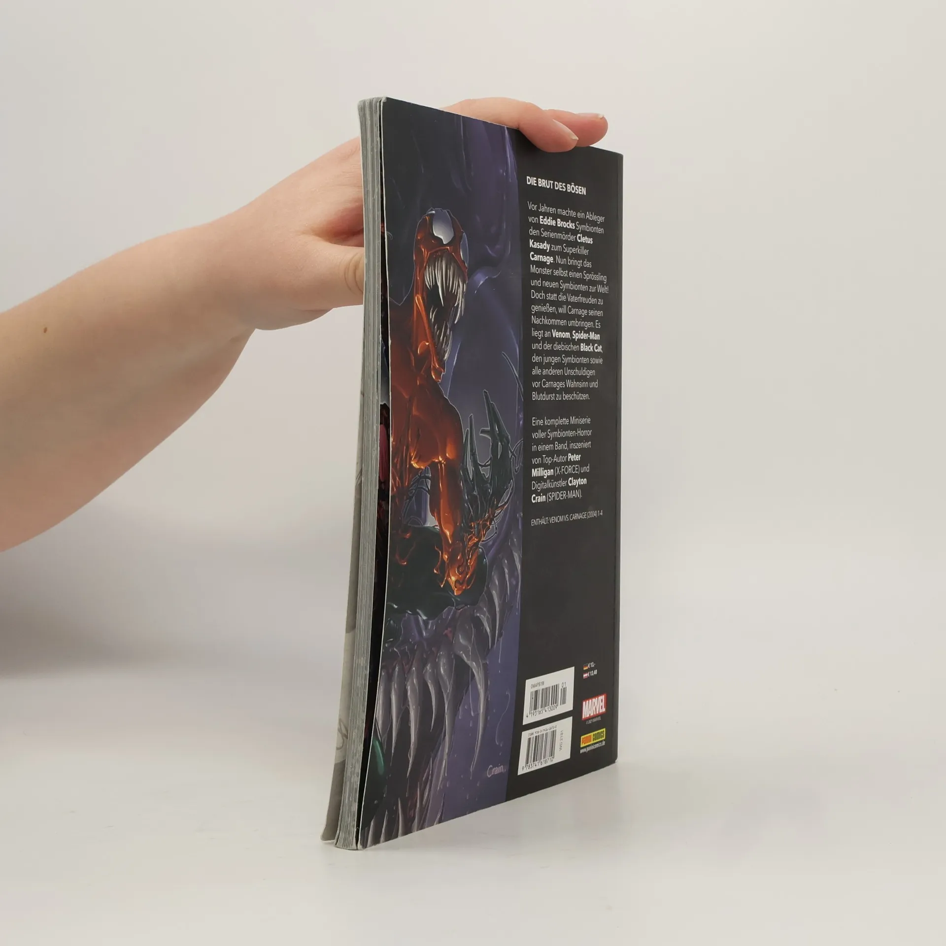 DIE BRUT DES BÖSEN Vor Jahren machte ein Ableger von Eddie Brocks Symbionten den Serienmörder Cletus Kasady zum Superkiller Carnage. Nun bringt das Monster selbst einen Sprössling und neuen Symbionten zur Welt! Doch statt die Vaterfreuden zu genießen, will Carnage seinen Nachkommen umbringen. Es liegt an Venom, Spider-Man und der diebischen Black Cat, den jungen Symbionten sowie alle anderen Unschuldigen vor Carnages Wahnsinn und Blutdurst zu beschützen. Eine komplette Miniserie voller Symbionten-Horror in einem Band, inszeniert von Top-Autor Peter Milligan (X-FORCE) und Digitalkünstler Clayton Crain (SPIDER-MAN). ENTHÄLT: VENOM VS. CARNAGE (2004) 1-4