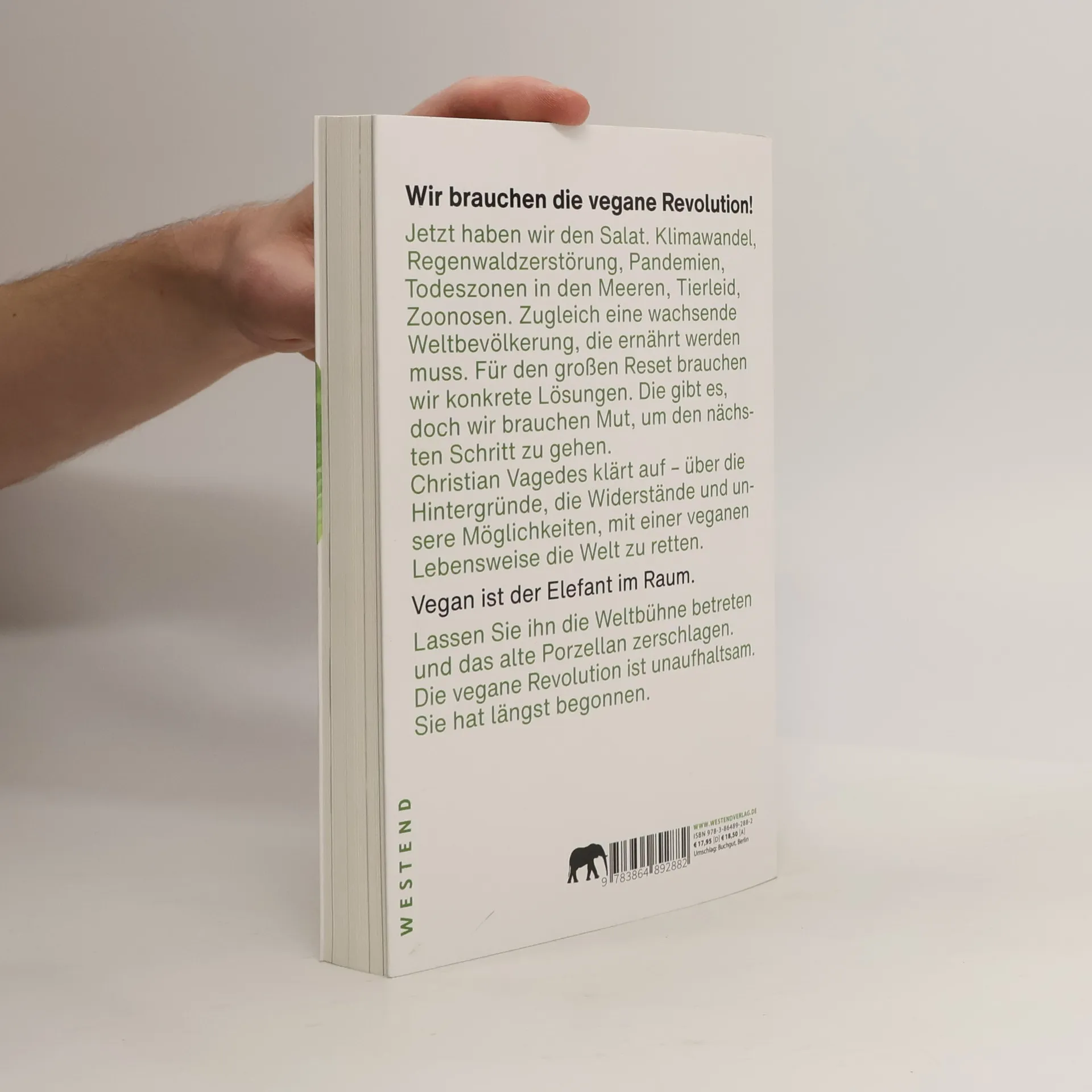 Wir brauchen die vegane Revolution! Jetzt haben wir den Salat. Klimawandel, Regenwaldzerstörung, Pandemien, Todeszonen in den Meeren, Tierleid, Zoonosen. Zugleich eine wachsende Weltbevölkerung, die ernährt werden muss. Für den großen Reset brauchen wir konkrete Lösungen. Die gibt es, doch wir brauchen Mut, um den nächsten Schritt zu gehen. Christian Vagedes klärt auf - über die Hintergründe, die Widerstände und unsere Möglichkeiten, mit einer veganen Lebensweise die Welt zu retten. Vegan ist der Elefant im Raum. Lassen Sie ihn die Weltbühne betreten und das alte Porzellan zerschlagen. Die vegane Revolution ist unaufhaltsam. Sie hat längst begonnen.