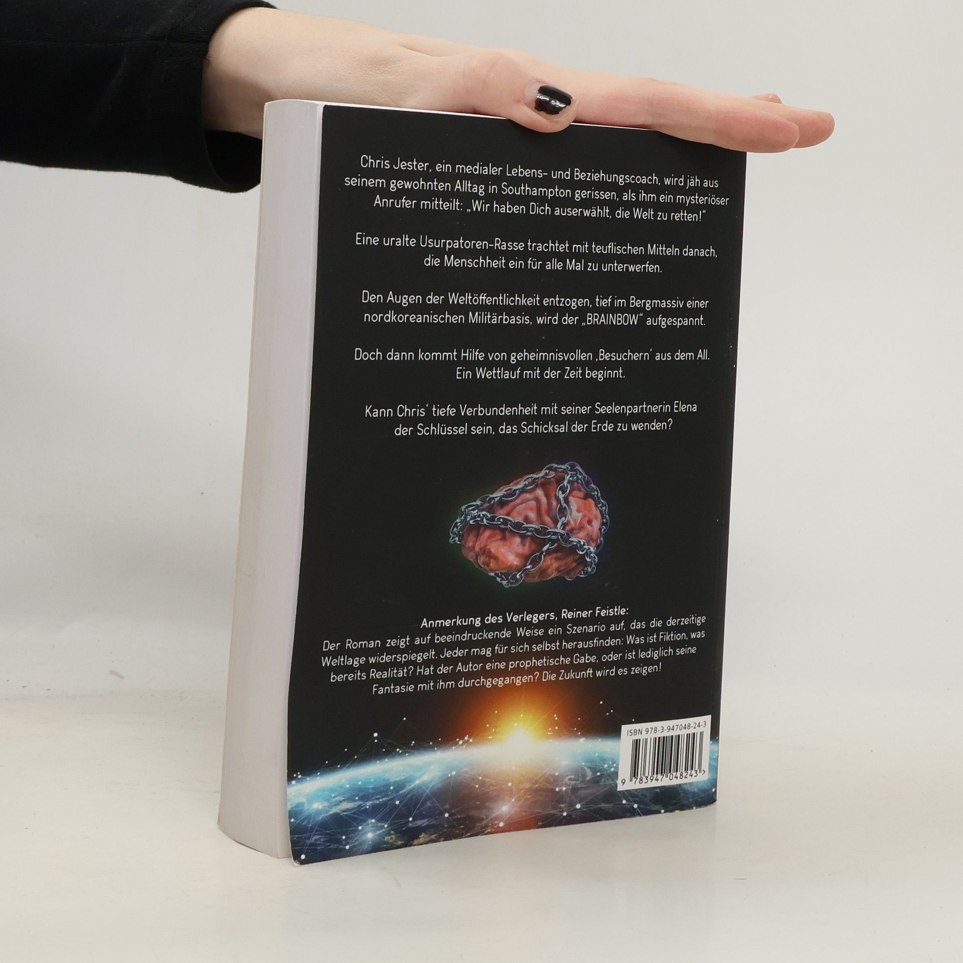 Chris Jester, ein medialer Lebens-und Beziehungscoach, wird jäh aus seinem gewohnten Alltag in Southampton gerissen, als ihm ein mysteriöser Anrufer mitteilt: „Wir haben Dich auserwählt, die Welt zu retten!“ Eine uralte Usurpatoren-Rasse trachtet, mit teuflischen Mitteln danach, die Menschheit, ein für alle Mal, zu unterwerfen. Den Augen der Weltöffentlichkeit entzogen, tief im Bergmassiv einer nordkoreanischen Militärbasis, wird der „BRAINBOW“ aufgespannt. Doch dann kommt Hilfe von geheimnisvollen ‚Besuchern‘ aus dem All. Ein Wettlauf mit der Zeit beginnt. Kann Chris‘ tiefe Verbundenheit mit seiner Seelenpartnerin Elena der Schlüssel sein, das Schicksal der Erde zu wenden? Anmerkung des Verlegers, Reiner Feistle: Der Roman zeigt, auf beeindruckende Weise, ein Szenario auf, das die derzeitige Weltlage widerspiegelt. Jeder mag für sich selbst herausfinden: Was ist Fiction, was bereits Realität? Hat der Autor eine prophetische Gabe, oder ist lediglich seine Fantasie mit ihm durchgegangen? Die Zukunft wird es zeigen!