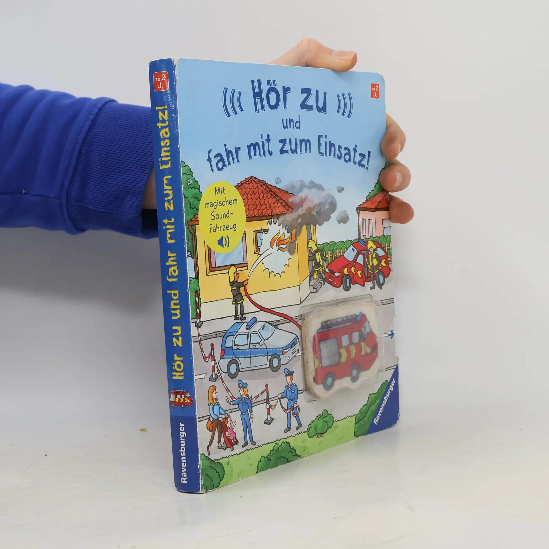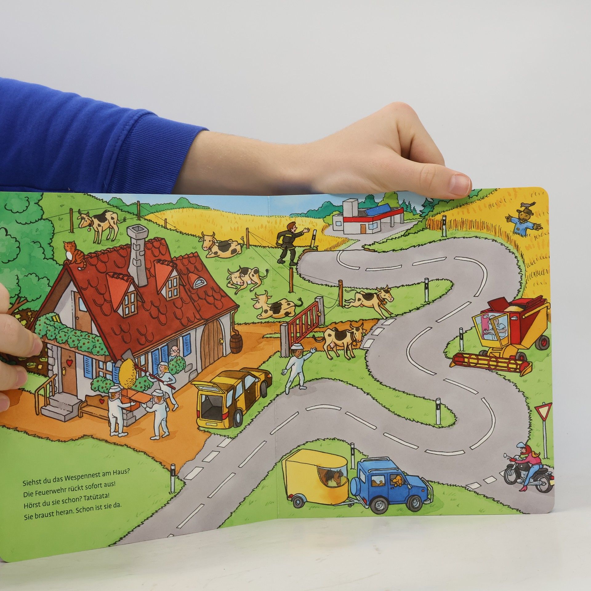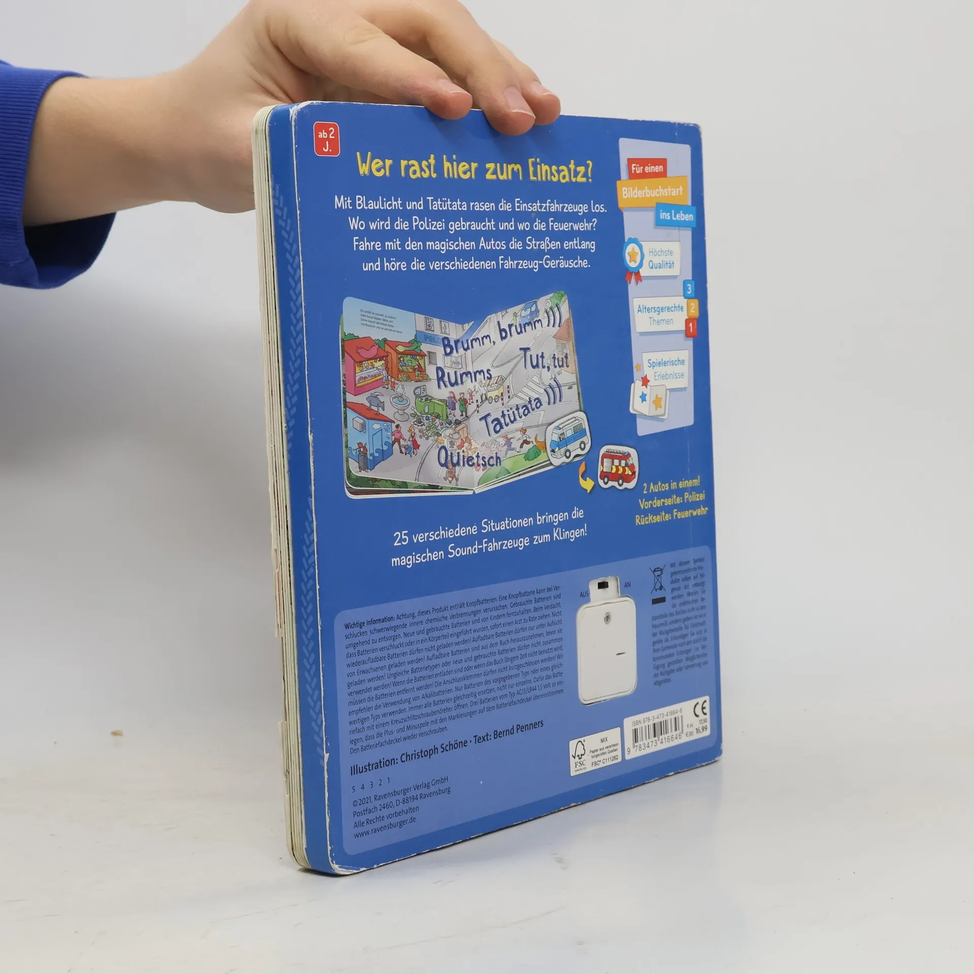 Welche Fahrzeuge rasen hier zum Einsatz? Ob beim Großbrand, beim Einbruch im Kiosk oder wenn die Straße versperrt ist – in diesem Buch entscheidest du, ob die Feuerwehr oder die Polizei zur Hilfe eilen. Fahre mit dem magischen Sound-Fahrzeug über die Seiten und finde heraus, wo die Bremsen quietschen, der Motor aufheult oder das Tatütata erklingt. Auf jeder Seite gibt es 5 spannende Geräusche zu entdecken. Rase mit Feuerwehr oder Polizei zum Einsatz! In der Stadt brennt ein großes Haus, im Kiosk am Waldsee wurde eingebrochen und auf der Marktstraße ist ein Unfall passiert. Wer soll jetzt zur Hilfe kommen? Das entscheidest du! Das magische Sound-Fahrzeug ist von vorne eine Feuerwehr und auf der Rückseite ein Polizeiauto. Kinder ab 2 Jahren fahren einfach mit dem Fahrzeug über die Straße und entdecken auf jeder Seite 5 spannende Geräusche. Mal muss gehupt werden, weil eine Kuh auf die Straße gelaufen ist. Mal muss das Auto an einer scharfen Kurve bremsen. Mal ertönt laut das Tatütata der Sirene. Kannst du alle Geräusche auf den Seiten finden?