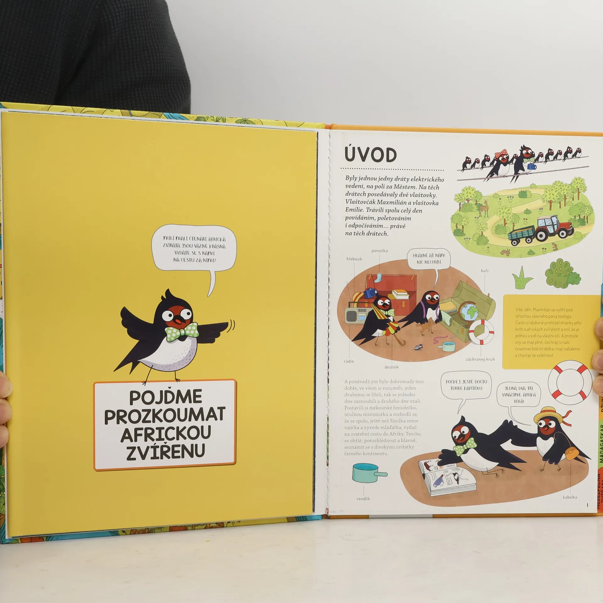 Emilka je mladá vlaštovčí dáma a Maxmilián její vyvolený. Nedávno se vzali a teď letí na svatební cestu. Kam? Jasně že do Afriky! Malinko se ohřát a hlavně poznat své zvířecí kolegy. Chcete se k zamilovanému párečku přidat? Nic vám v tom nebrání. Díky třem rozkládacím mapám uvnitř knihy se v Africe dokonale zorientujete, a pak už jenom můžete číst, poznávat život divokých zvířat a těšit se ze spousty barevných obrázků.