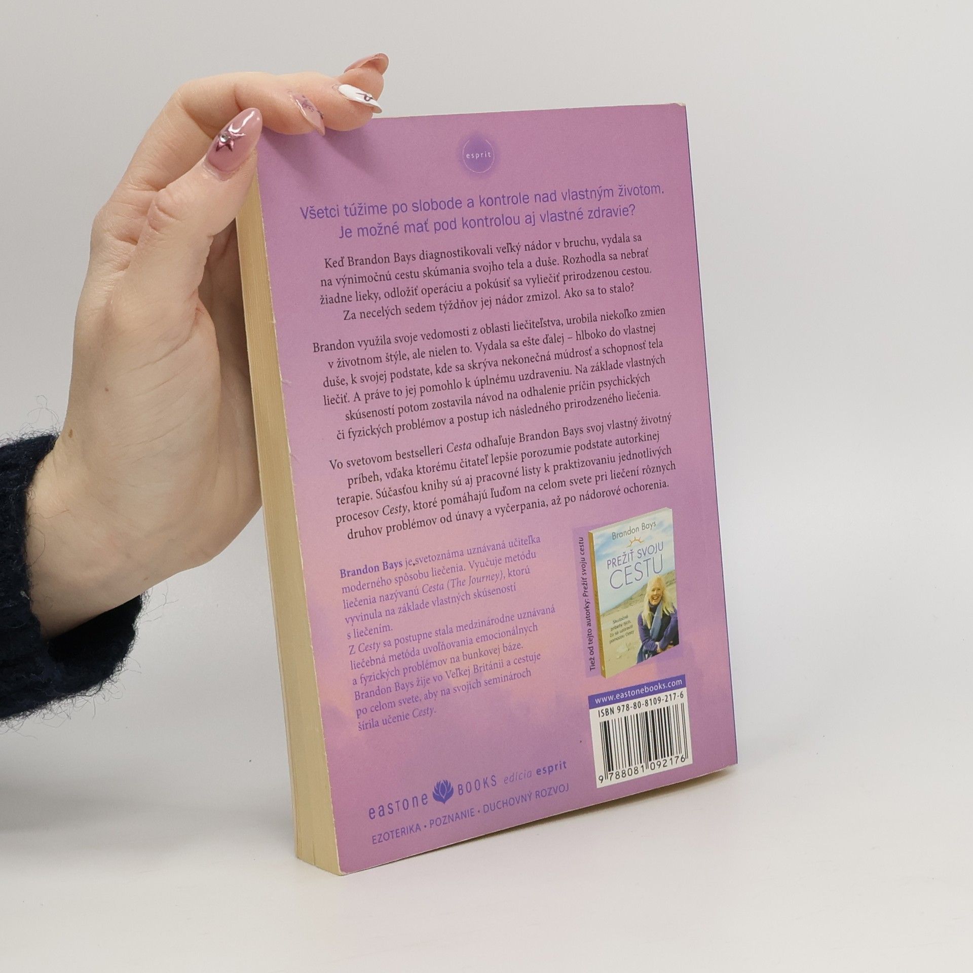 Praktický návod na ozdravenie a oslobodenie sa Keď Brandon Bays našli veľký nádor, vydala sa na výnimočnú cestu skúmania svojho tela a duše. Rozhodla sa odložiť operáciu a pokúsiť sa vyliečiť prirodzenou cestou. Do siedmich týždňov jej nádor zmizol. Brandon využila svoje vedomosti z oblasti liečiteľstva a vydala sa ešte ďalej – hlboko do vlastnej duše, k svojej podstate, kde sa skrýva nekonečná múdrosť a schopnosť tela liečiť. Na základe vlastných skúseností potom zostavila návod na zistenie príčin psychických či fyzických problémov a postup ich následného prirodzeného liečenia. Vo svetovom bestselleri Cesta odhaľuje Brandon celý tento príbeh, vďaka čomu čitateľ lepšie porozumie podstate jej terapie. Súčasťou knihy sú aj pracovné listy k praktizovaniu jednotlivých procesov Cesty, ktoré pomáhajú ľuďom na celom svete pri liečení rôznych druhov problémov.
