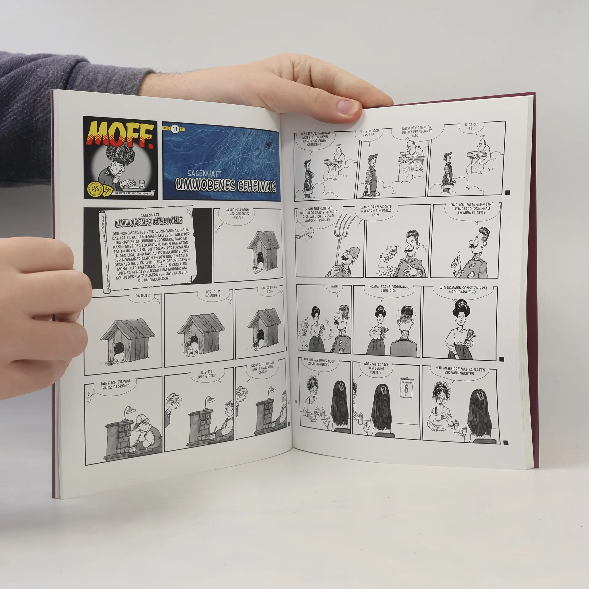 Einer Karotte hinterher zu laufen ist eine bewährte Technik um sich fit zu halten. Das zeigt augenzwinkernd die schöne winterliche Zeichnung am Cover des neuen Haderer Jahrbuchs. Auf achtzig Seiten findet man einen humorvollen Überblick des Jahres 2021, mit all seinen Höhen und Tiefen. Mit erstklassigen Karikaturen von Gerhard Haderer zu aktuellen politischen und gesellschaftlichen Themen und eine Auswahl der besten Geschichten aus seinem Comic „MOFF."