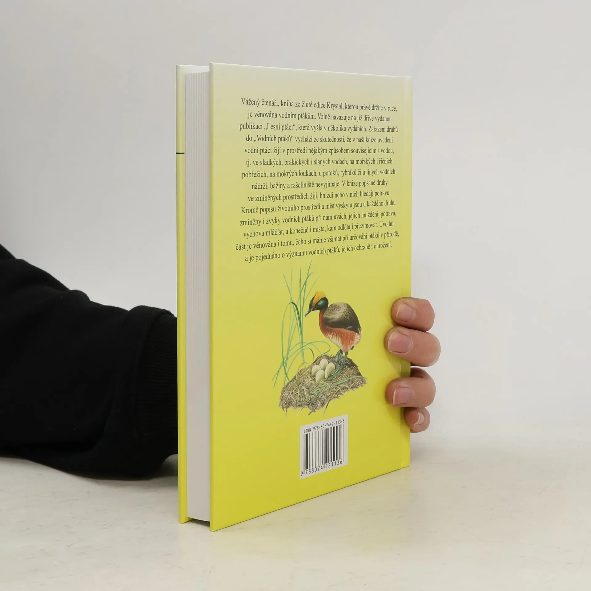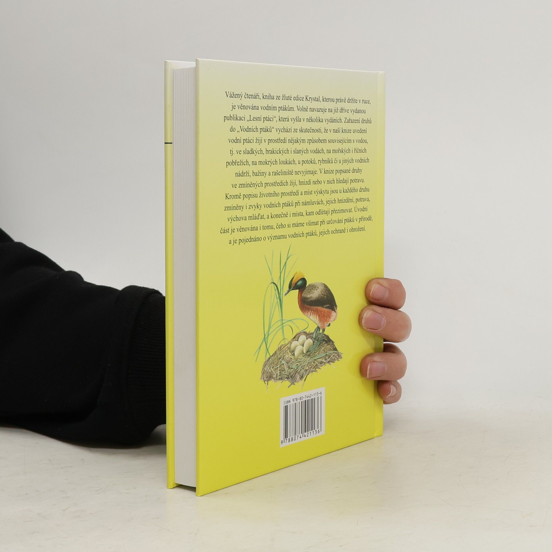 Kniha ze žluté série Krystal je věnována vodním ptákům. Volně navazuje na již dříve vydanou publikaci "Lesní ptáci", která vyšla v několika vydáních. Zařazení druhů do "Vodních ptáků" vychází ze skutečnosti, že v naší knize uvedení vodní ptáci žijí v prostředí nějakým způsobem souvisejícím s vodou, tj. ve sladkých, brakických i slaných vodách, na mořských i říčních pobřežích, na mokrých loukách, u potoků, rybníků či u jiných vodních nádrží, bažiny a rašeliniště nevyjímaje. V knize popsané druhy ve zmíněných prostředích žijí, hnízdí nebo v nich hledají potravu. Kromě popisu životního prostředí a míst výskytu jsou u každého druhu zmíněny i zvyky vodních ptáků při námluvách, jejich hnízdění, potrava, výchova mláďat, a konečně i místa, kam odlétají přezimovat. Úvodní část je věnována i tomu, čeho si máme všímat při určování ptáků v přírodě, a je pojednáno o významu vodních ptáků, jejich ochraně i ohrožení.