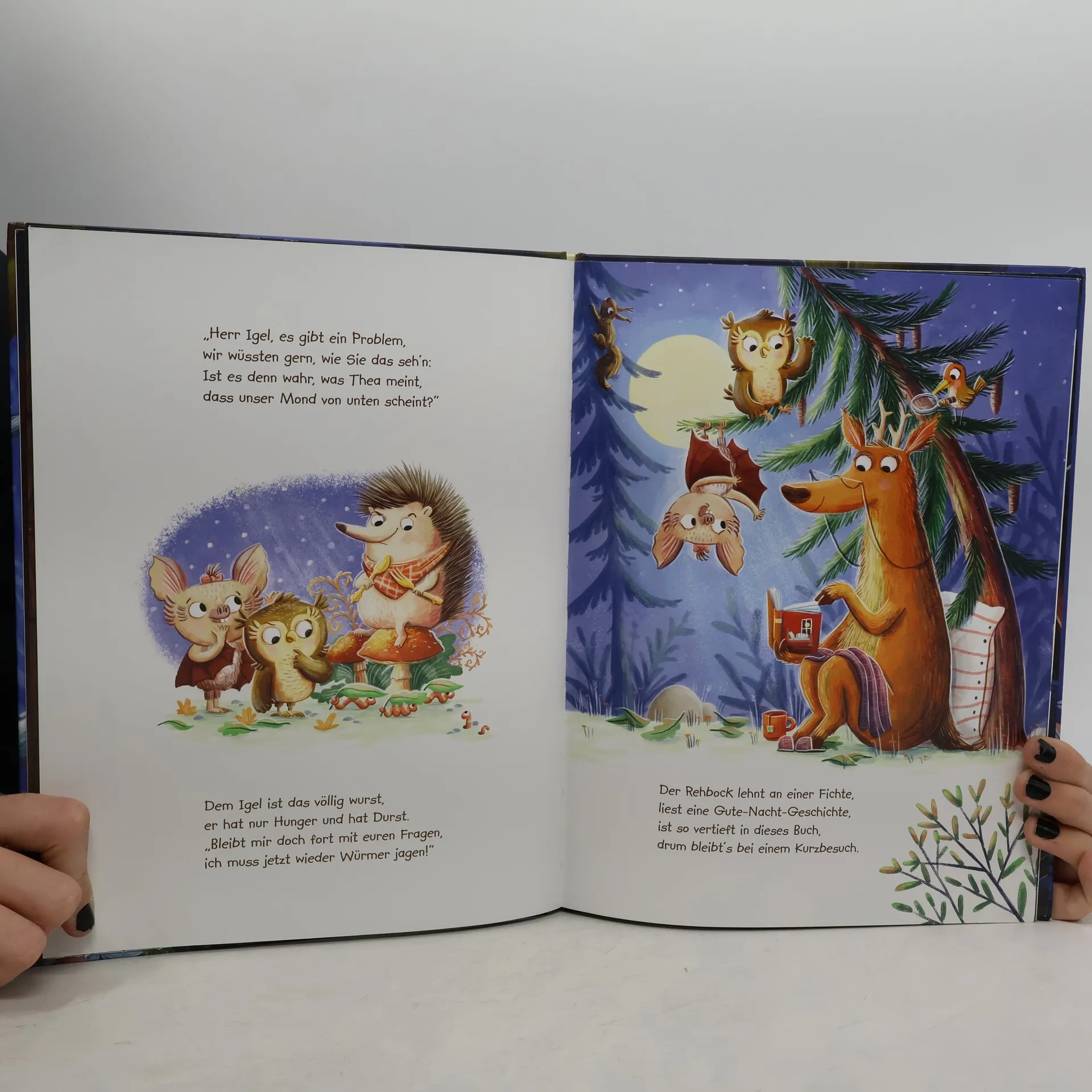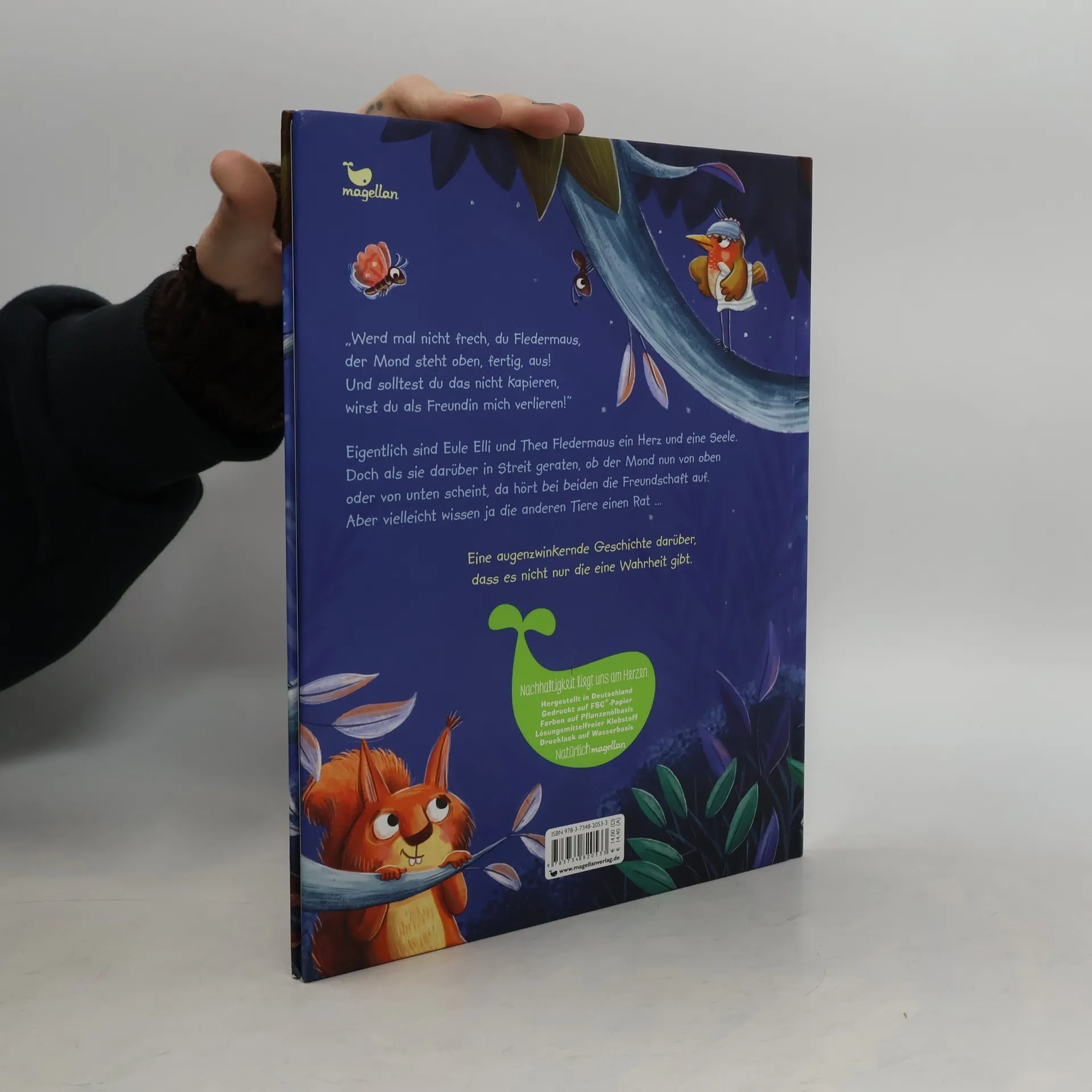 Humorvolle Gutenachtgeschichten zum Vorlesen dürfen beim Einschlafen nicht fehlen. Mit dieser Geschichte über die Freundschaft ganz besonderer Tiere sind schöne Träume garantiert. Eigentlich sind Eule Elli und Thea Fledermaus ein Herz und eine Seele. Doch als sie darüber in Streit geraten, ob der Mond nun von oben oder von unten scheint, da hört bei beiden die Freundschaft auf. Aber vielleicht wissen ja die anderen Tiere einen Rat … Eine kluge Geschichte, die auf sehr humorvolle und kindgerechte Weise vermittelt, worauf es in einer Freundschaft ankommt: Dass man sich bemüht, den anderen zu verstehen und versucht die Dinge auch einmal aus seiner Perspektive zu betrachten.