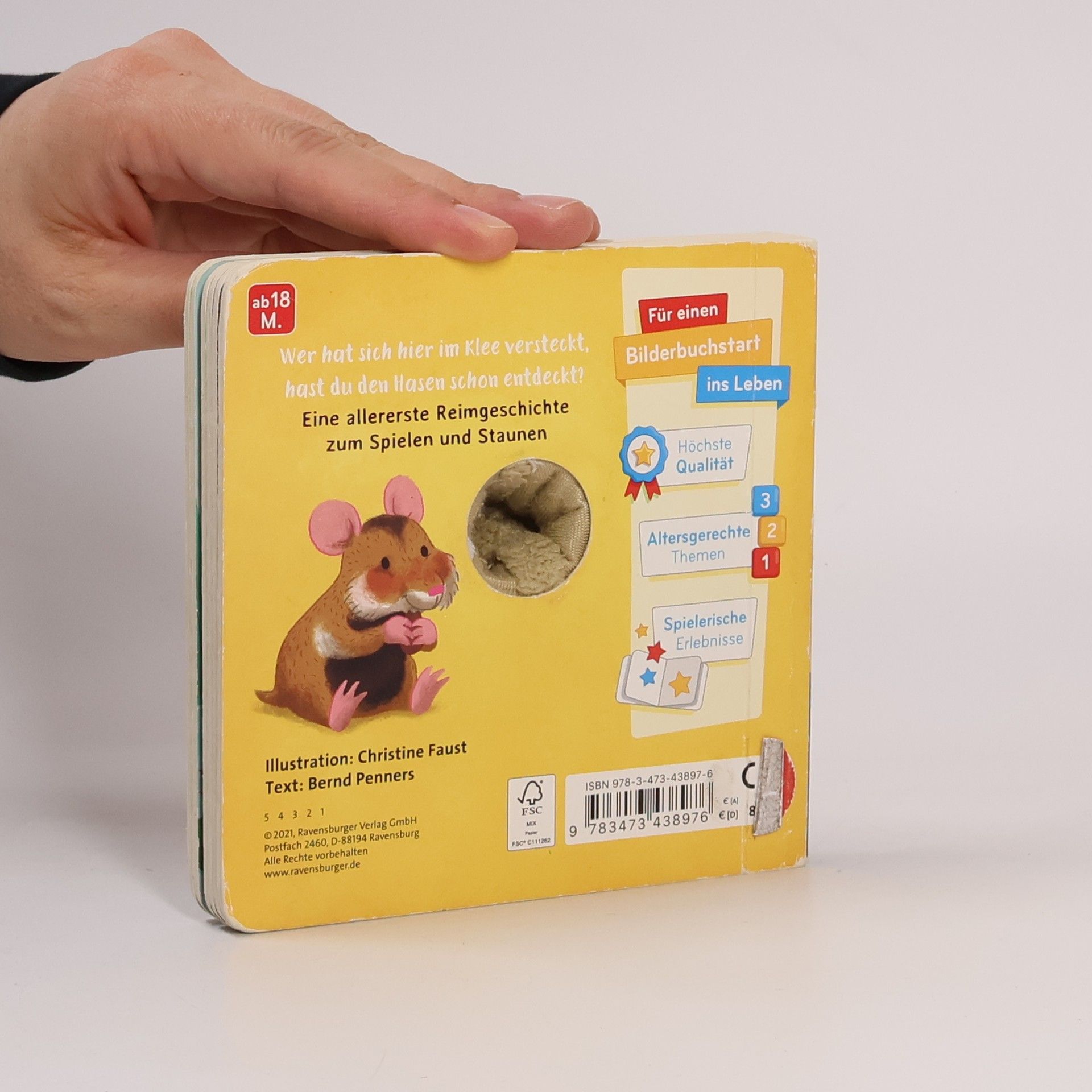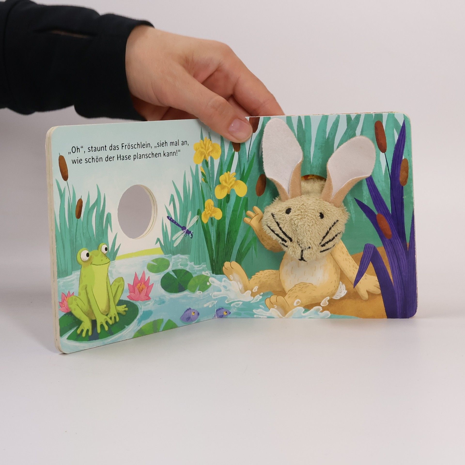 Juhu! Der kleine Hase hüpft von einem lustigen Abenteuer ins nächste, und mit der kuschelweichen Fingerpuppe bist du immer dabei.Kurze Reime erzählen eine allererste Geschichte für Kinder ab 18 Monaten und fördern spielerisch ihre Sprachentwicklung.Eine allererste Geschichte mit Fingerpuppe zum Spielen und Kuscheln.Kurze Reime erweitern spielerisch den Wortschatz und erzählen auf fünf Doppelseiten von den abwechslungsreichen Erlebnissen des kleinen Hasen: Gemeinsam mit seinen Freunden spielt er im Klee Verstecken, besucht den Frosch am großen Teich und den Hamster im Getreidefeld. Mit Maus und Biene erntet er ein besonders großes Möhrchen und fällt abends müde in sein weiches Bett aus Stroh. Träum schön, kleiner Hase!Dieses erste Mitmachbuch animieren zum Tasten, Fühlen und Begreifen und fördern so die Feinmotorik der Kleinsten.In der letzten Seite des Buchs ist eine stabile Fingerpuppe befestigt. Durch Gucklöcher auf jeder Seite lässt sich der Kopf des kleinen Hasen in jedem Bild bewegen. Probieren Sie es aus: Stecken Sie einen Finger hinein und erwecken Sie den Hasen zum Leben!Auch praktisch: Die Fingerpuppe kann im Buch versteckt werden. So lässt sich das Buch trotz besonderer Ausstattung wunderbar ins Regal stellen und platzsparend aufräumen.Ein schönes Geschenk – auch passend fürs Osternest.