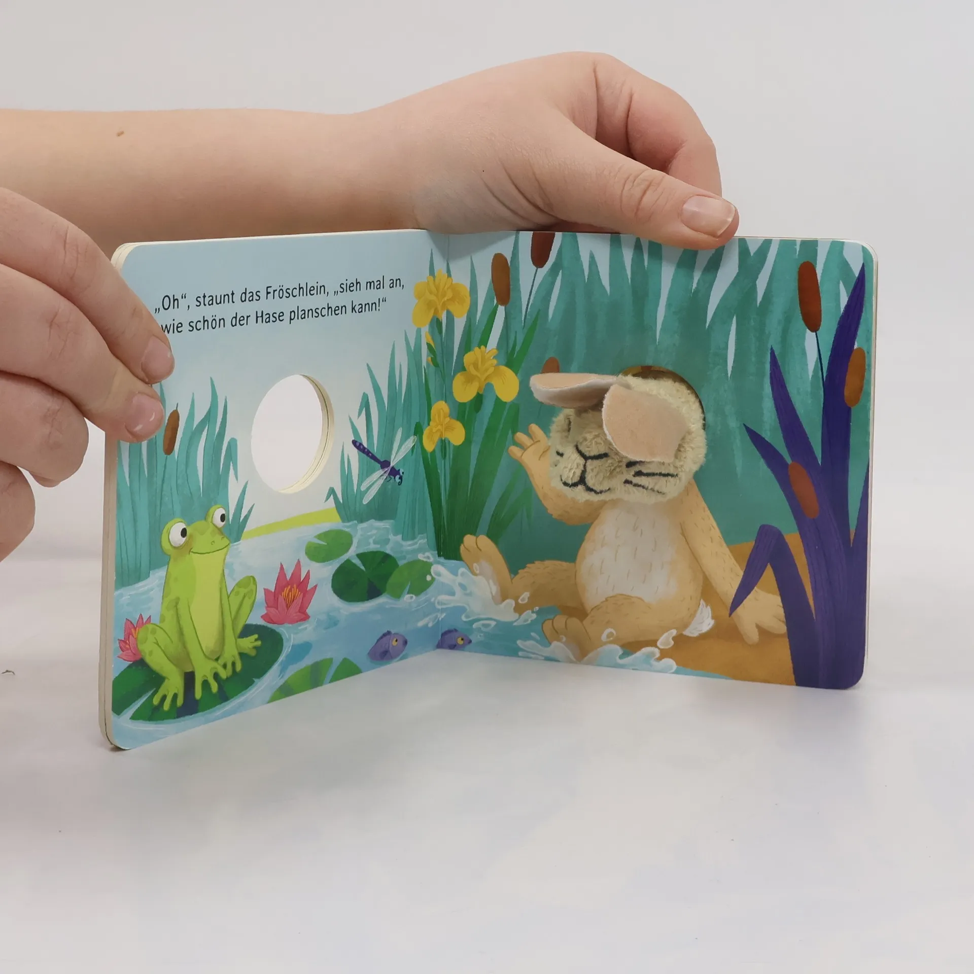 Juhu! Der kleine Hase hüpft von einem lustigen Abenteuer ins nächste, und mit der kuschelweichen Fingerpuppe bist du immer dabei.Kurze Reime erzählen eine allererste Geschichte für Kinder ab 18 Monaten und fördern spielerisch ihre Sprachentwicklung.Eine allererste Geschichte mit Fingerpuppe zum Spielen und Kuscheln.Kurze Reime erweitern spielerisch den Wortschatz und erzählen auf fünf Doppelseiten von den abwechslungsreichen Erlebnissen des kleinen Hasen: Gemeinsam mit seinen Freunden spielt er im Klee Verstecken, besucht den Frosch am großen Teich und den Hamster im Getreidefeld. Mit Maus und Biene erntet er ein besonders großes Möhrchen und fällt abends müde in sein weiches Bett aus Stroh. Träum schön, kleiner Hase!Dieses erste Mitmachbuch animieren zum Tasten, Fühlen und Begreifen und fördern so die Feinmotorik der Kleinsten.In der letzten Seite des Buchs ist eine stabile Fingerpuppe befestigt. Durch Gucklöcher auf jeder Seite lässt sich der Kopf des kleinen Hasen in jedem Bild bewegen. Probieren Sie es aus: Stecken Sie einen Finger hinein und erwecken Sie den Hasen zum Leben!Auch praktisch: Die Fingerpuppe kann im Buch versteckt werden. So lässt sich das Buch trotz besonderer Ausstattung wunderbar ins Regal stellen und platzsparend aufräumen.Ein schönes Geschenk – auch passend fürs Osternest.