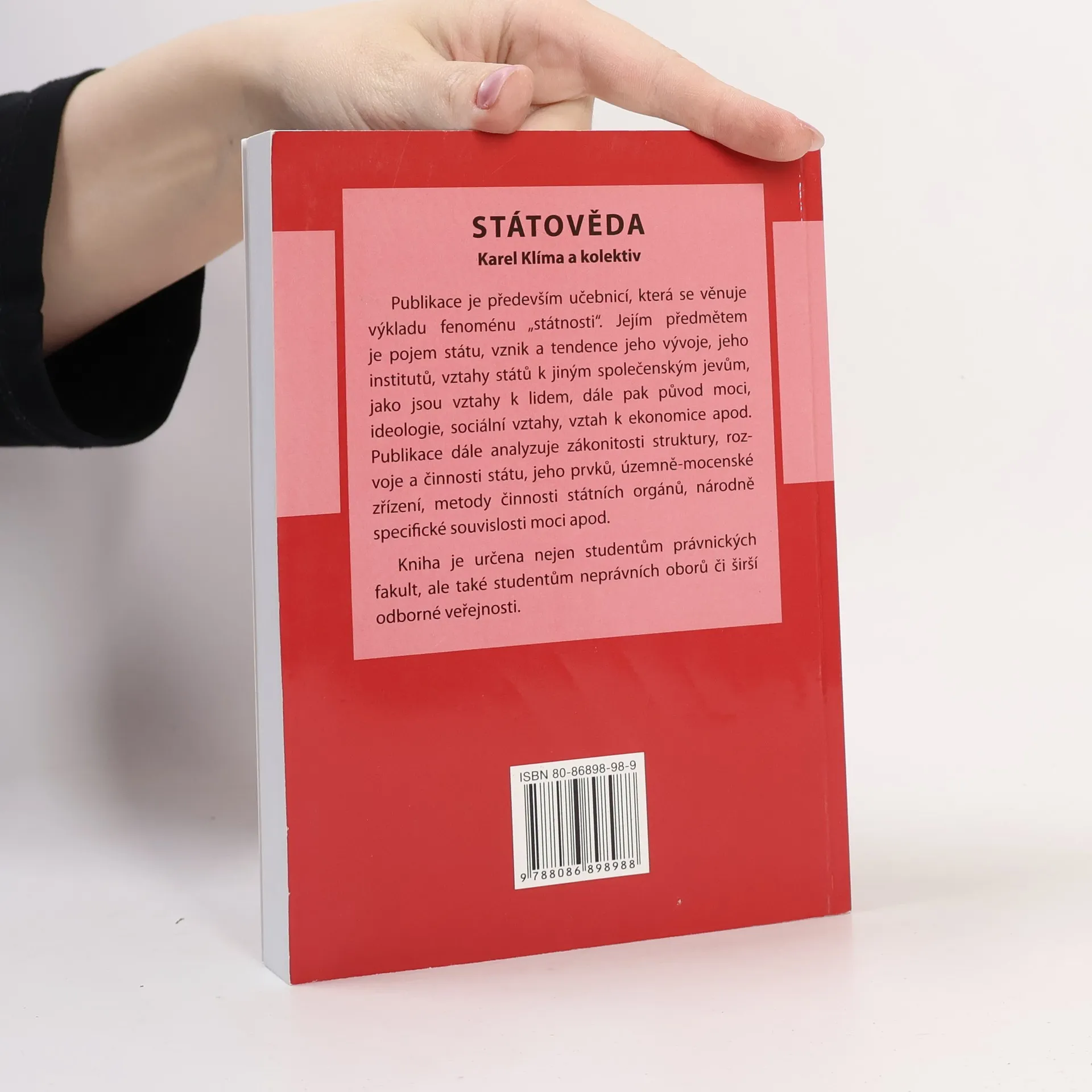 Publikace se věnuje výkladu fenoménu „státnosti“. Jejím předmětem je pojem státu, vznik a tendence jeho vývoje, jeho institutů, vztahy států k jiným společenským jevům, jako jsou vztahy k lidem, dále pak původ moci, ideologie, sociální vztahy, vztah k ekonomice apod. Publikace dále analyzuje zákonitosti struktury, rozvoje a činnosti státu, jeho prvků, územně mocenské zřízení, metody činnosti státních orgánů, národně specifické souvislosti moci apod. Oproti prvnímu vydání propracovává ty partie, kde je nutné zobrazit charakter suverenitní státnosti (pojmové znaky státu, stát jako mezinárodněprávní kategorie, území a hranice státu a suverenita státu). Prohlubuje rovněž tematiku institucí týkajících se lidských práv a jejich garančního mechanismu (pojem právní stát, principy katalogů lidských práv a veřejná funkce právní pomoci a obhajoby). Kniha tvoří základ pro studium oboru státověda pro studenty bakalářských a magisterských studijních programů právnických i neprávnických vysokých škol, stejně tak však může být cenným zdrojem informací pro představitele laické i odborné veřejnosti.