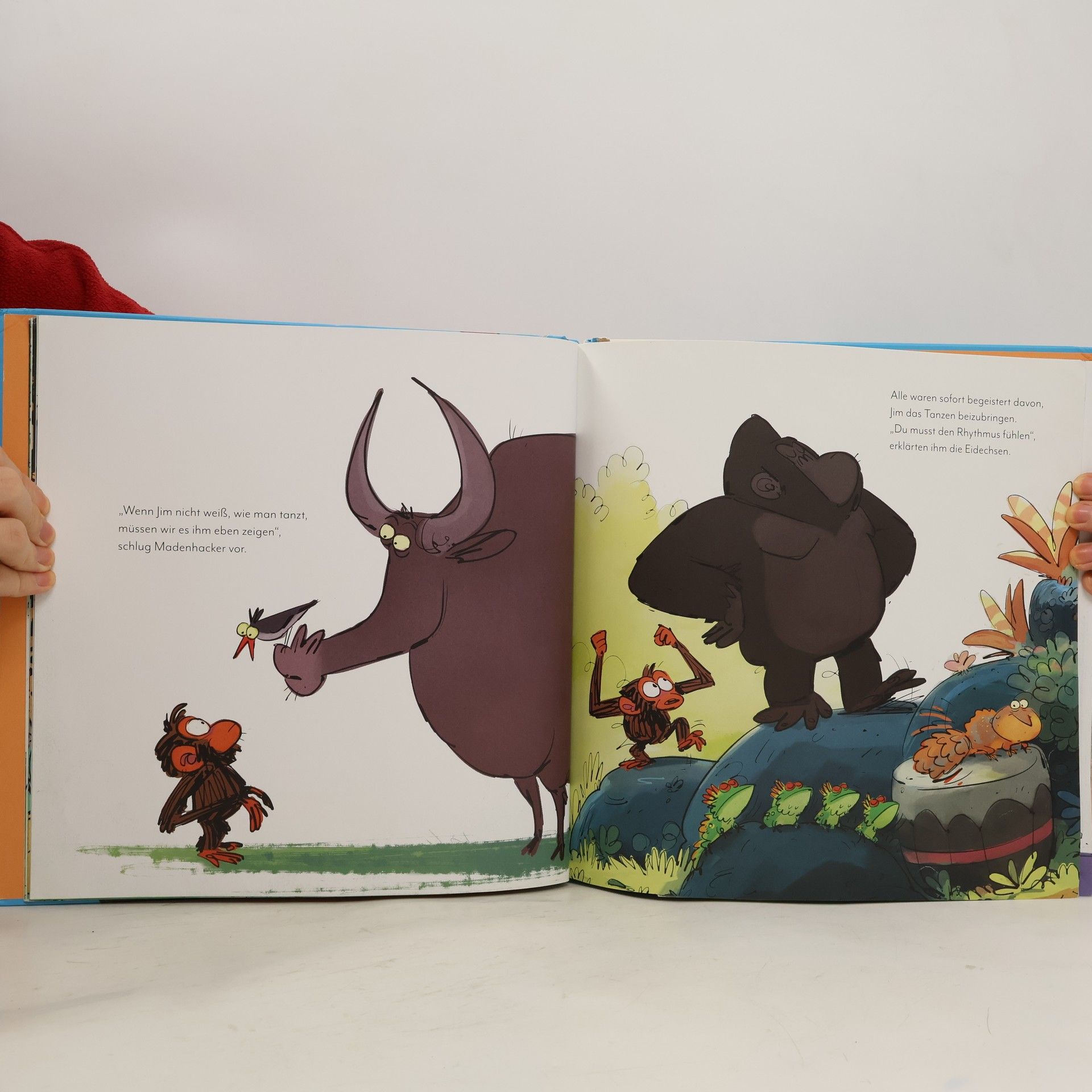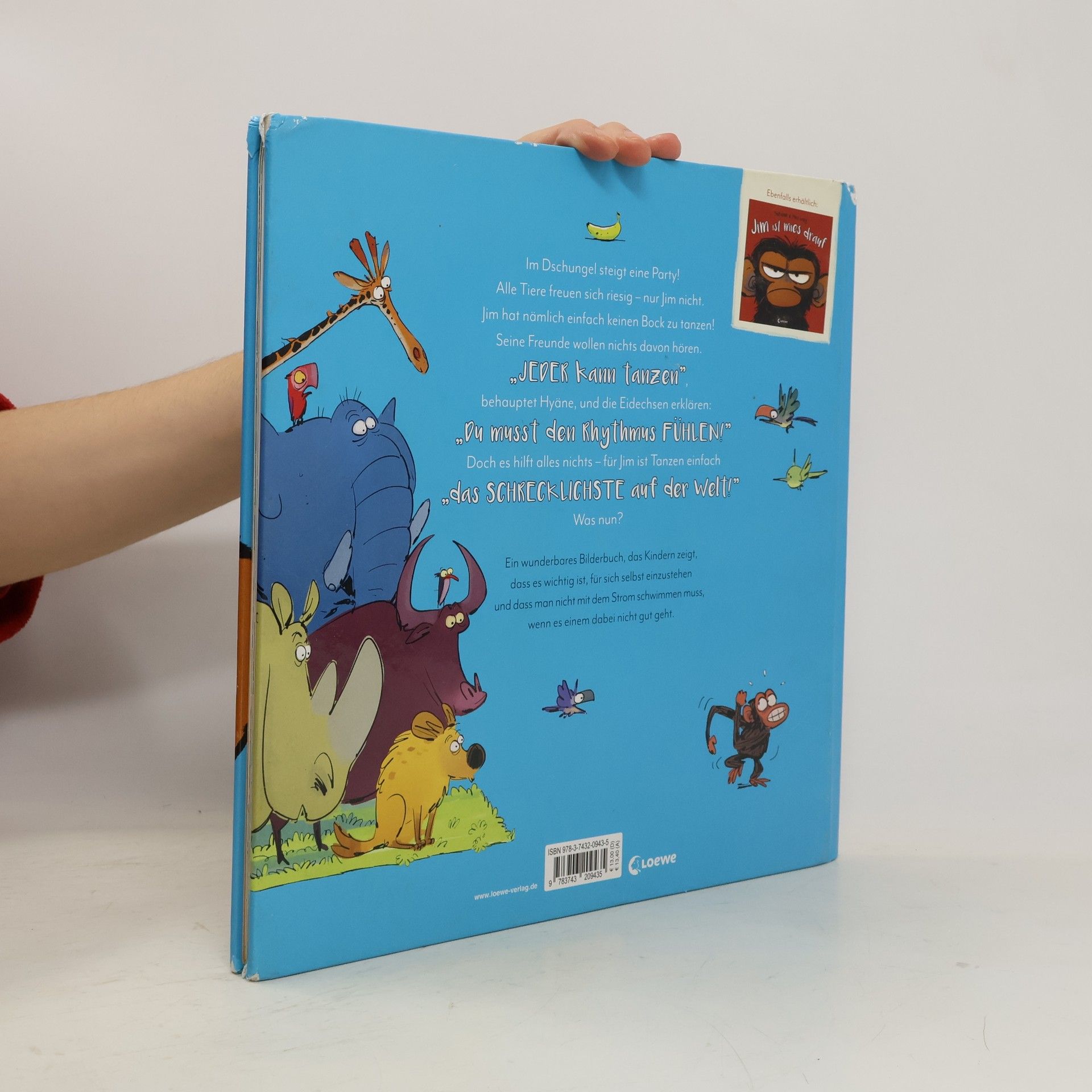 Das Buch ist bei deiner Buchhandlung vor Ort und bei vielen Online-Buchshops erhältlich! Im Dschungel steigt eine Party! Alle Tiere freuen sich riesig – nur Jim nicht. Jim hat nämlich einfach keinen Bock zu tanzen! Seine Freunde wollen nichts davon hören. „Jeder kann tanzen“, behauptet Hyäne, und die Eidechsen erklären: „Du musst den Rhythmus fühlen!“ Doch es hilft alles nichts – für Jim ist Tanzen einfach „das Schrecklichste auf der Welt!“ Was nun? Ein wunderbares Bilderbuch, das Kindern zeigt, dass es wichtig ist, für sich selbst einzustehen und dass man nicht mit dem Strom schwimmen muss, wenn es einem dabei nicht gut geht. Es ist nicht immer einfach, zu seinen Gefühlen zu stehen – besonders, wenn scheinbar alle Freunde etwas besonders toll finden, nur man selbst nicht. Doch das bedeutet nicht, dass man automatisch nicht mitmachen kann, oder dass man deshalb anderen den Spaß verdirbt. Das lernt auch Affe Jim in diesem witzigen und einfühlsamen Bilderbuch. Kindgerecht und lustig wird der Umgang mit schwer erklärbaren Gefühlen thematisiert und gezeigt, dass Nein sagen völlig in Ordnung ist. Der Nachfolgeband zum erfolgreichen Bilderbuch Jim ist mies drauf .