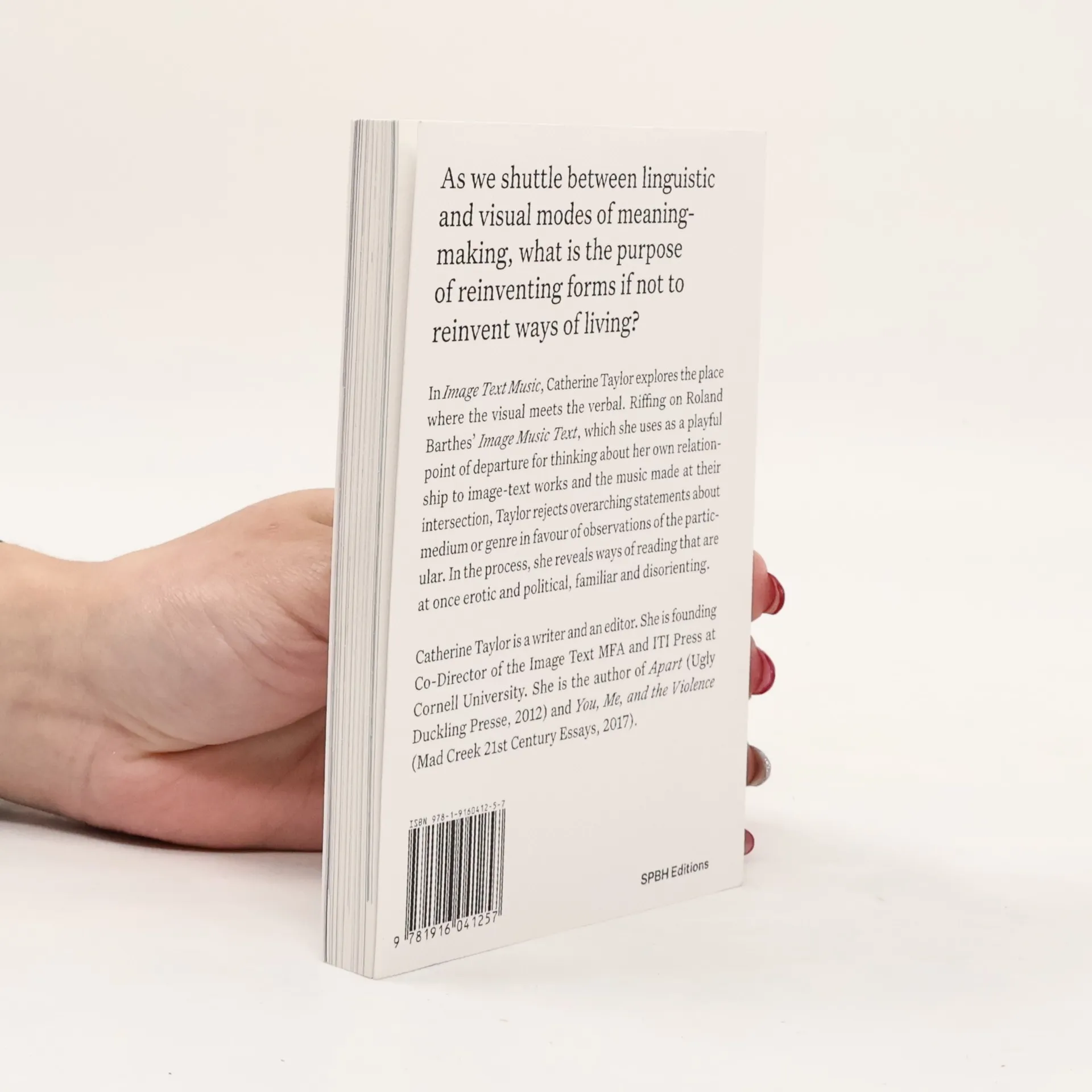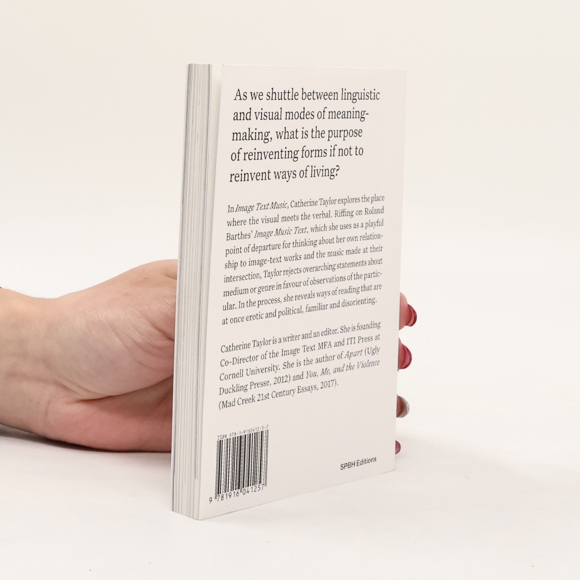 On the unique meaning-making of image-text art In a series of textual and photographic essays, writer and editor Catherine Taylor explores our encounters with the intersection of the visual and the verbal. Taylor riffs on and subverts Roland Barthes' classic 1977 essay collection, Image Music Text, using his title as a playful point of departure for her thinking about the nature of image-text works and the music being made at their intersection. Taylor rejects overarching statements about medium or genre in favor of observing the particular to reveal broader ways of reading that are both familiar and disorientating. These reflections are at once critical and celebratory, dystopian and utopian, investigative and contemplative, didactic and dreamlike. They are imaginings of the world which ask: as we shuttle between linguistic and visual modes of meaning-making, what is the purpose of reinventing forms if not to reinvent ways of living? The author of You, Me, and the Violence, Apart and Giving Birth, Catherine Taylor (born 1964) is a founding editor of Essay Press, and an associate professor in writing at Ithaca College, where she codirects the Image Text MFA. She is also a codirector of ITI Press.