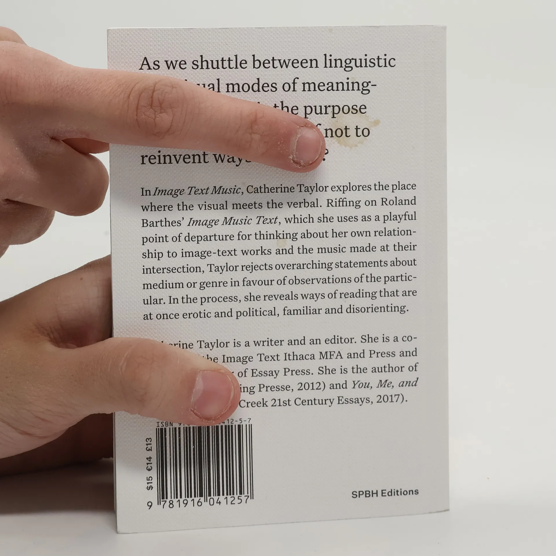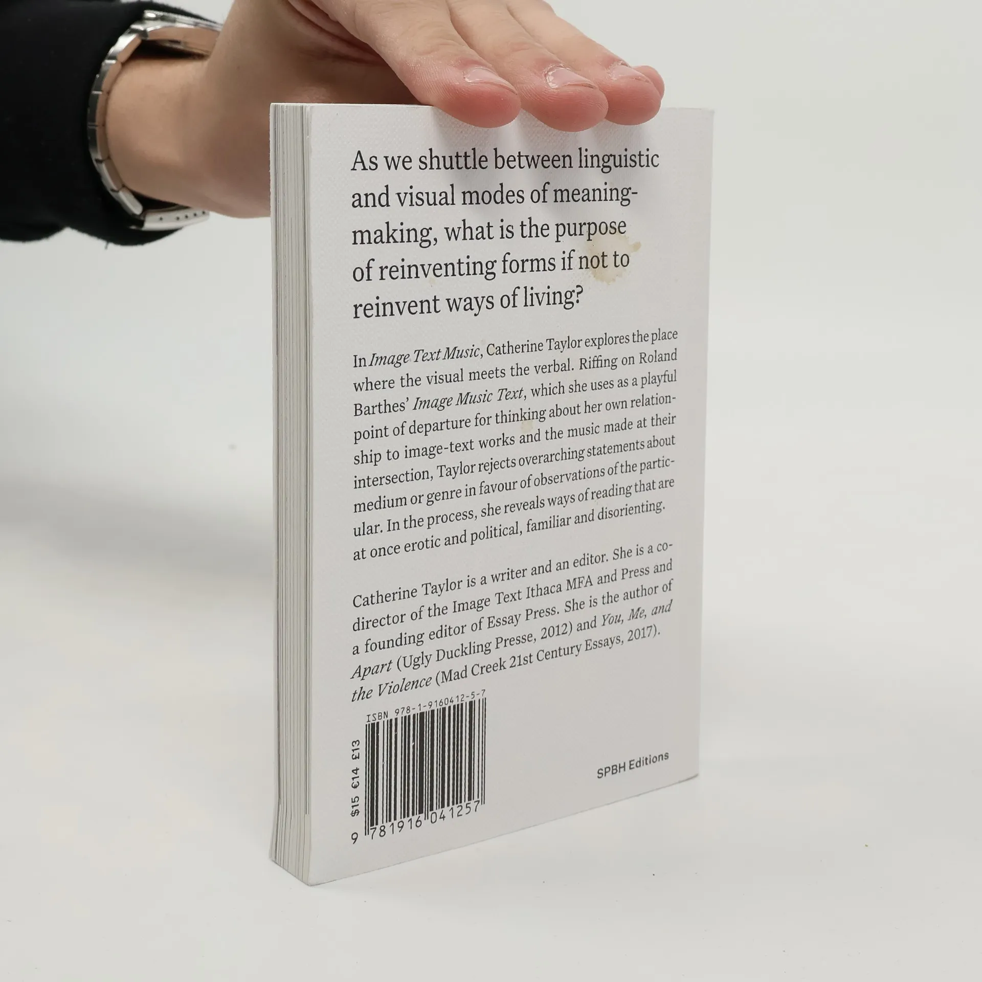 On the unique meaning-making of image-text art In a series of textual and photographic essays, writer and editor Catherine Taylor explores our encounters with the intersection of the visual and the verbal. Taylor riffs on and subverts Roland Barthes' classic 1977 essay collection, Image Music Text, using his title as a playful point of departure for her thinking about the nature of image-text works and the music being made at their intersection. Taylor rejects overarching statements about medium or genre in favor of observing the particular to reveal broader ways of reading that are both familiar and disorientating. These reflections are at once critical and celebratory, dystopian and utopian, investigative and contemplative, didactic and dreamlike. They are imaginings of the world which ask: as we shuttle between linguistic and visual modes of meaning-making, what is the purpose of reinventing forms if not to reinvent ways of living? The author of You, Me, and the Violence, Apart and Giving Birth, Catherine Taylor (born 1964) is a founding editor of Essay Press, and an associate professor in writing at Ithaca College, where she codirects the Image Text MFA. She is also a codirector of ITI Press.