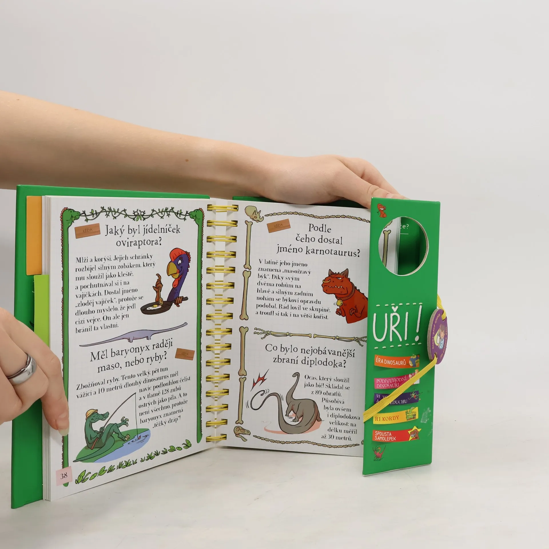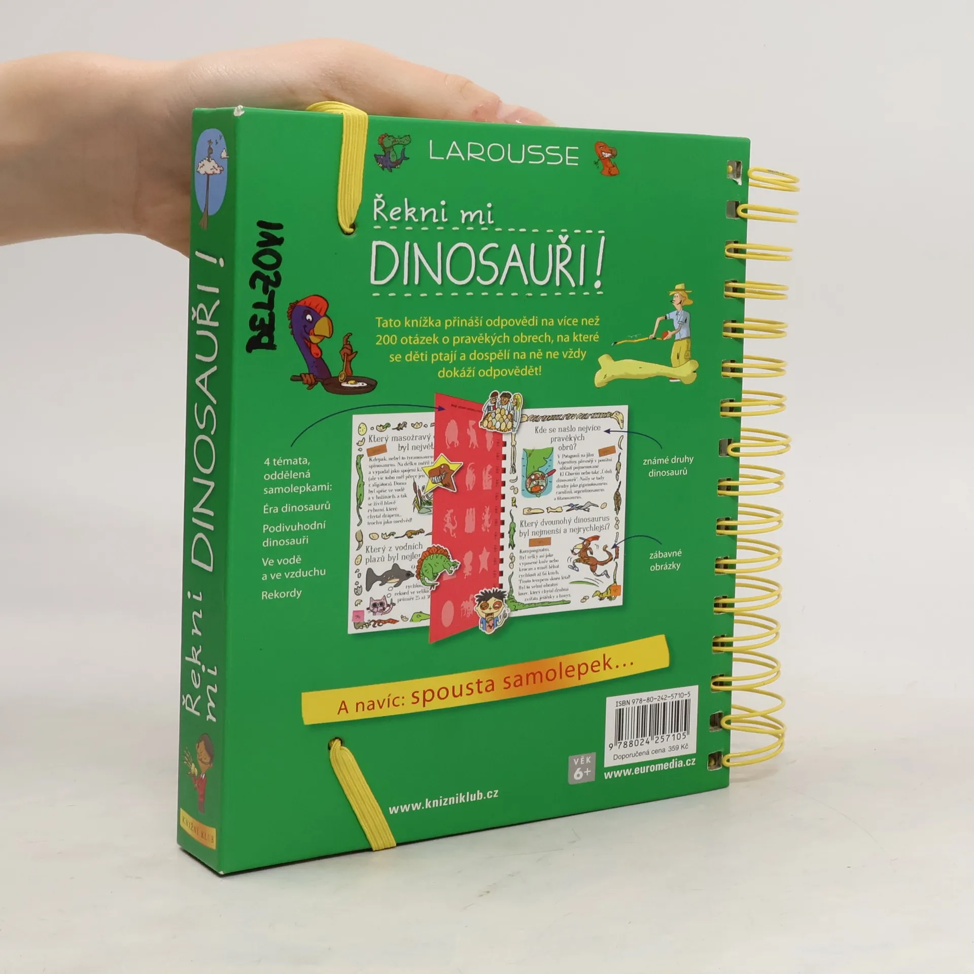 Další z oblíbených encyklopedií pro zvídavé děti z edice „Řekni mi“ se věnuje éře dinosaurů. Z odpovědí na více než 200 přemýšlivých otázek se děti dozvídají spoustu zajímavostí o období druhohor, kdy naši planetu pravěcí obři obývali, o životě na souši, ve vodě i ve vzduchu, o rekordech ze světa dinosaurů, o jejich druhové rozmanitosti, vzhledu, způsobu života, a konečně i o důvodech jejich vyhynutí. Knížka s praktickou spirálovou vazbou jako obvykle nabízí půvabné a vtipné ilustrace a nechybí ani tři listy se samolepkami.