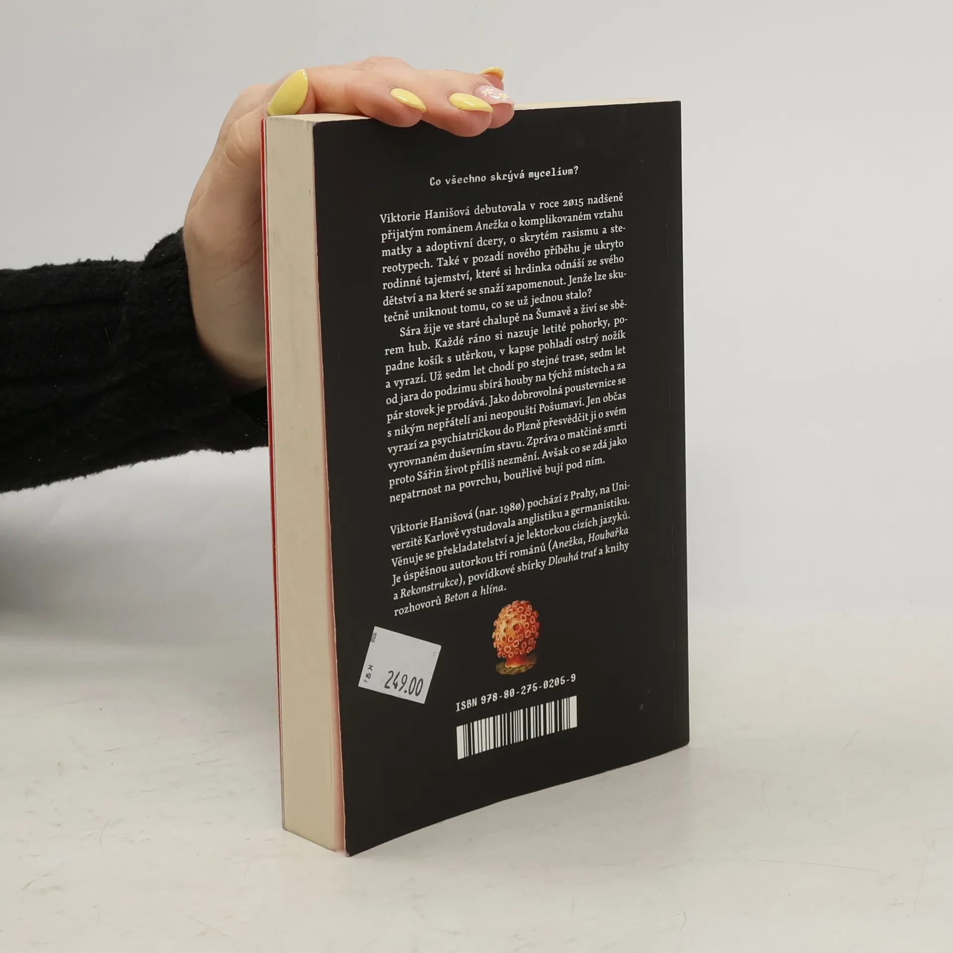 Co všechno skrývá mycelium? Viktorie Hanišová debutovala v roce 2015 nadšeně přijatým románem Anežka o komplikovaném vztahu matky a adoptivní dcery, o skrytém rasismu a stereotypech. Také v pozadí nového příběhu je ukryto rodinné tajemství, které si hrdinka odnáší ze svého dětství a na které se snaží zapomenout. Jenže lze skutečně uniknout tomu, co se už jednou stalo? Sára žije ve staré chalupě na Šumavě a živí se sběrem hub. Každé ráno si nazuje letité pohorky, popadne košík s utěrkou, v kapse pohladí ostrý nožík a vyrazí. Už sedm let chodí po stejné trase, sedm let od jara do podzimu sbírá houby na týchž místech a za pár stovek je prodává. Jako dobrovolná poustevnice se s nikým nepřátelí ani neopouští Pošumaví. Jen občas vyrazí za psychiatričkou do Plzně přesvědčit ji o svém vyrovnaném duševním stavu. Zpráva o matčině smrti proto Sářin život příliš nezmění. Avšak co se zdá jako nepatrnost na povrchu, bouřlivě bují pod ním.
