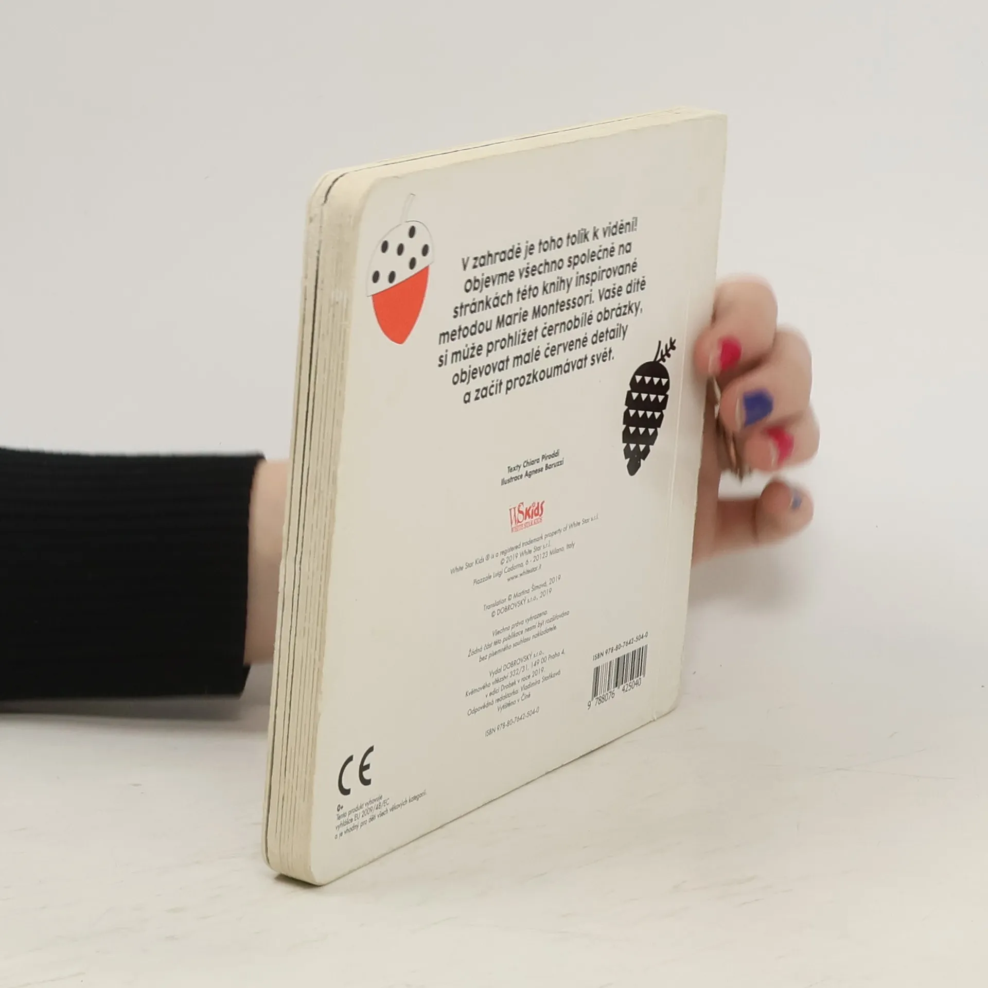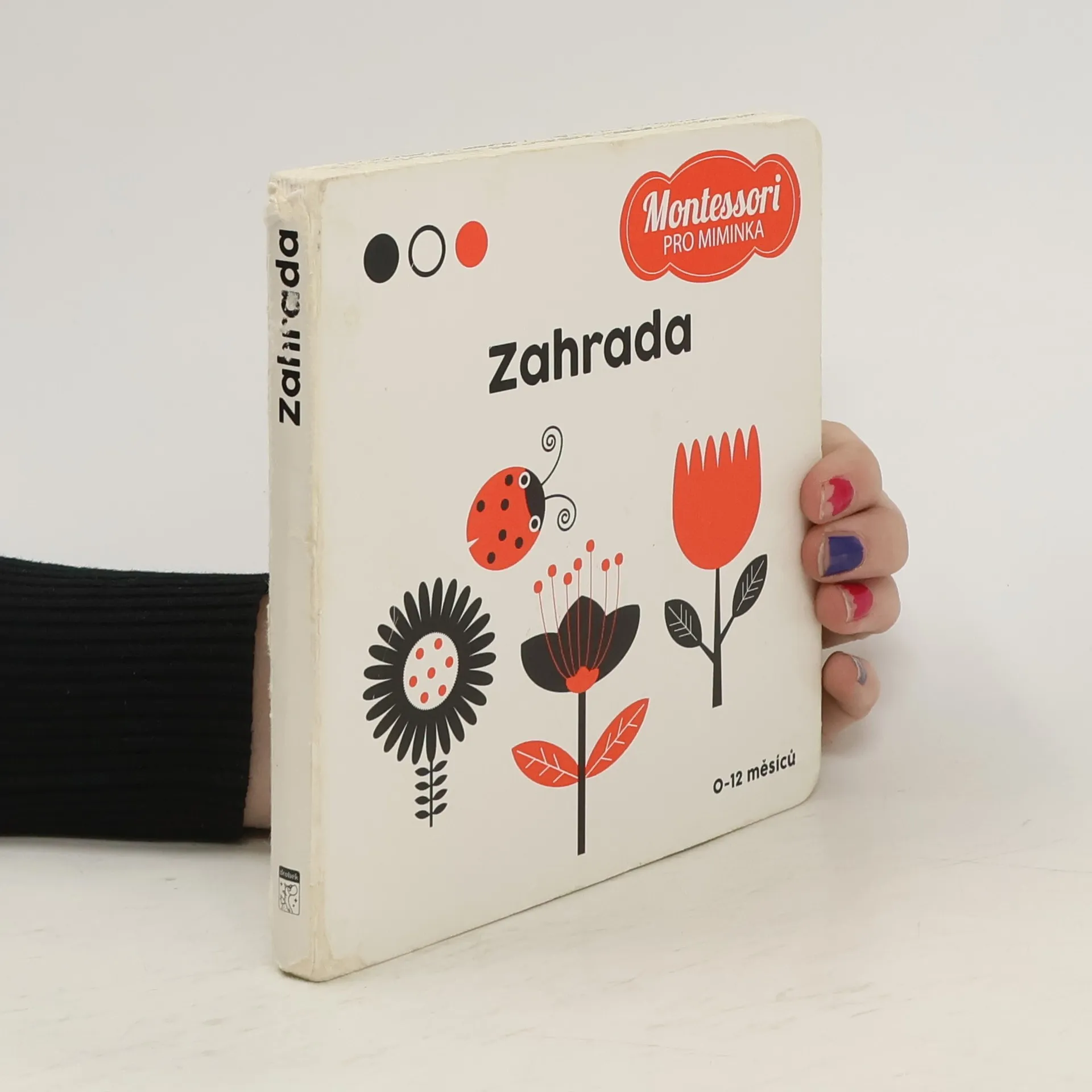 V zahradě je toho tolik k vidění! Objevme všechno společně na stránkách této knihy inspirované metodou Marie Montessori. Vaše dítě si může prohlížet černobílé obrázky, objevovat malé červené detaily a začít prozkoumávat svět. Vhodné pro děti ve věku 0 až 12 měsíců.