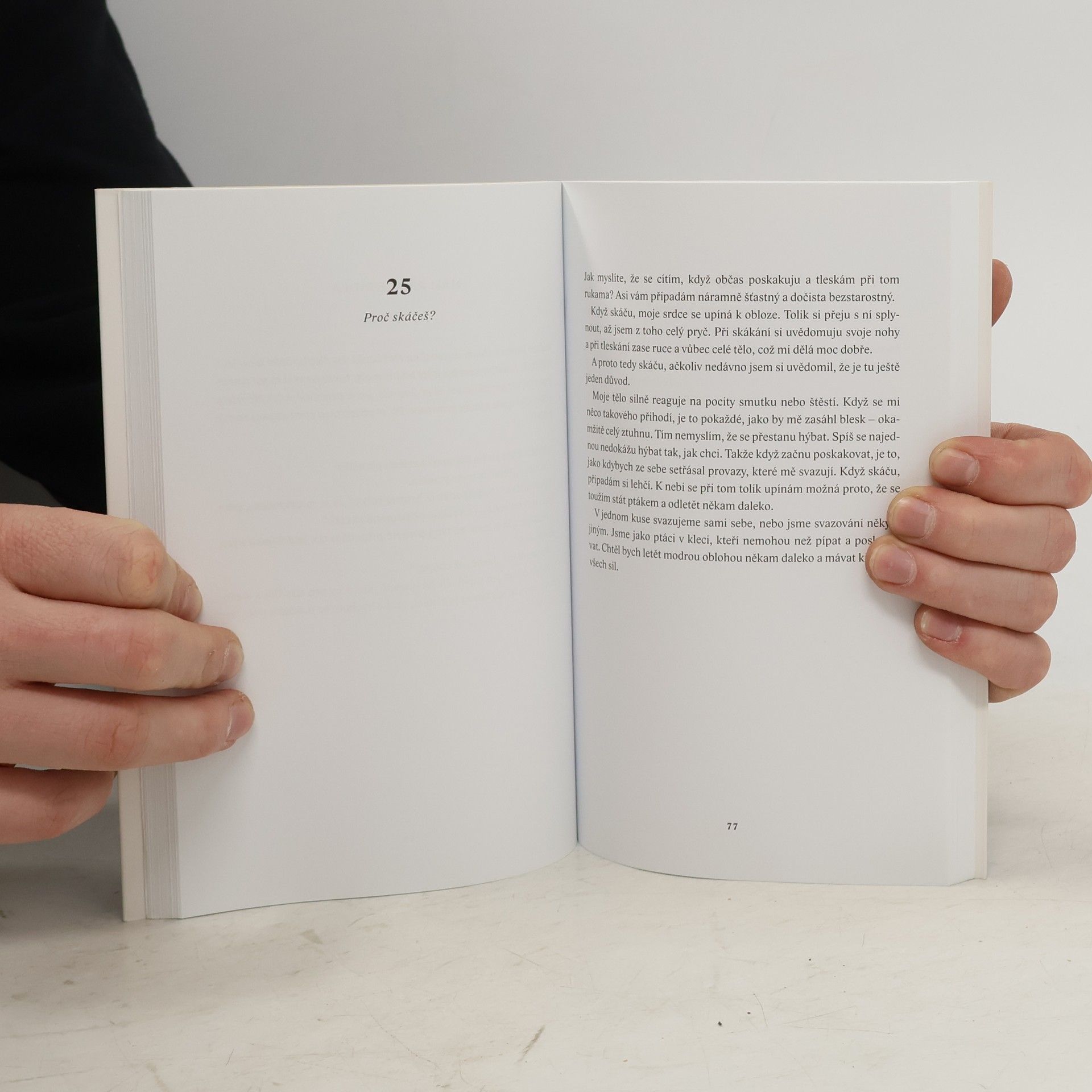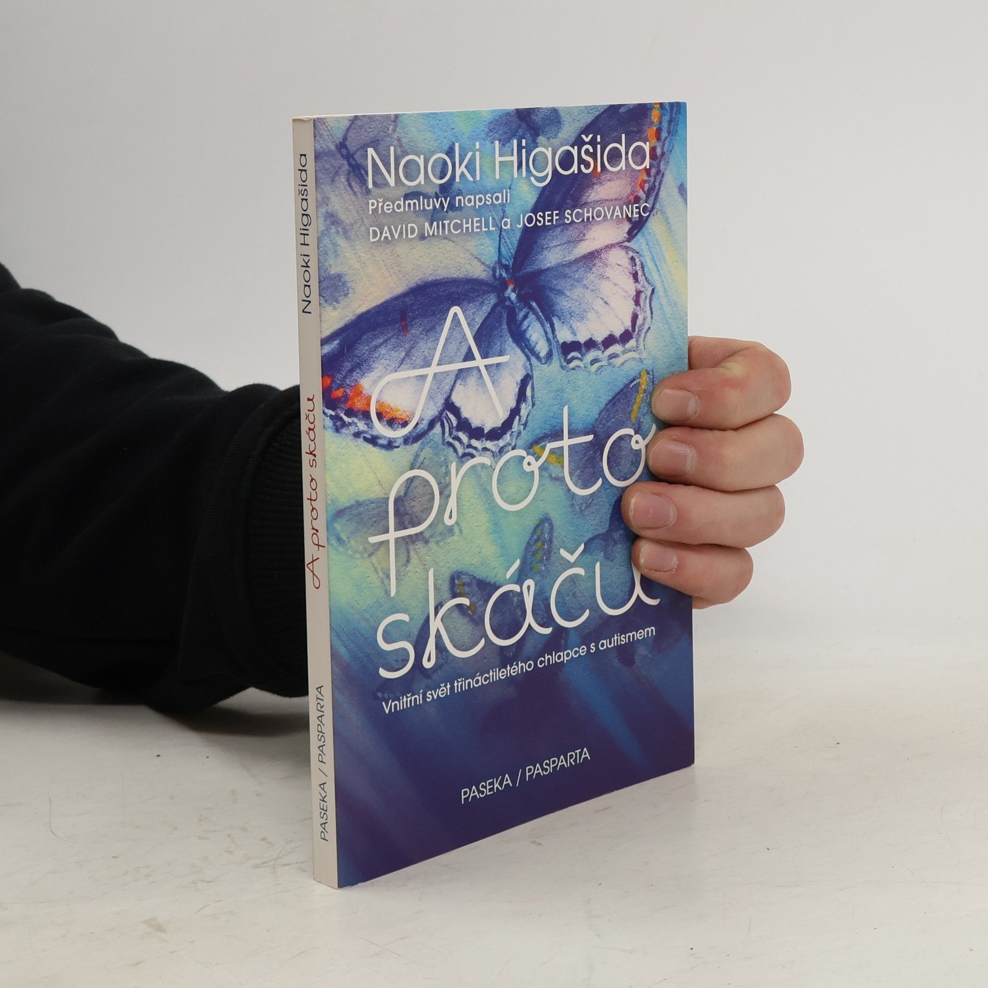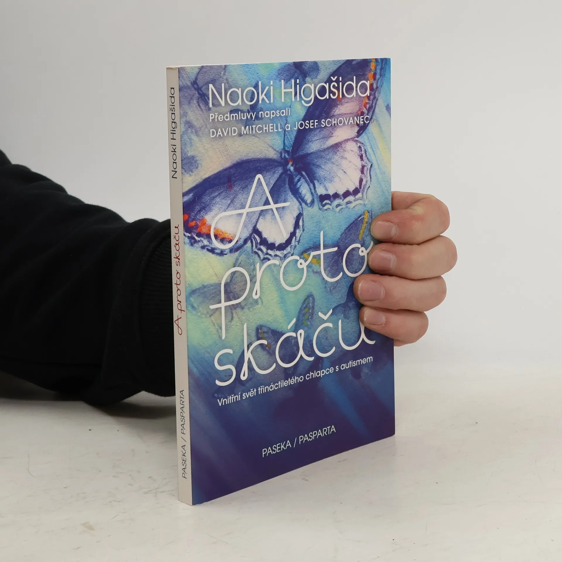 Vnitřní svět třináctiletého chlapce s autismem. Mladý spisovatel, básník a bloger z Japonska trpí tak silnou formou autismu, že nedokáže mluvit. Jeho vidění světa je však neuvěřitelně bohaté, citlivé a inteligentní. Dokázal to v bestselleru A proto skáču, který ve svých třinácti „sepsal“ za zcela mimořádných okolností. Metodou ukazování znaků na papírové matrici odpověděl na osmapadesát otázek, jež mu ostatní často kladou: Proč nemůžeš být chvíli v klidu? Proč se učíš nazpaměť jízdní řády? Co je nejhorší, když má člověk autismus? Unikátní knihu v Japonsku objevil britský spisovatel David Mitchell, sám otec autistického syna, společně s manželkou ji přeložil do angličtiny a Higašidu a jeho niterné svědectví proslavil po celém západním světě. „Představte si, že se nacházíte v místnosti s dvaceti radiopřijímači. Všechny hrají a naplno se z nich linou hlasy a hudba. Nejde je vypnout ani ztlumit a místnost nemá okna ani dveře, takže jedinou úlevu vám přinese až naprosté vyčerpání,“ přibližuje v sugestivní předmluvě Mitchell pocity lidí s autismem. Přeloženo z japonského originálu s přihlédnutím k anglickému překladu The Reason I Jump (2014), který pořídili David Mitchell a K.A. Yoshida.