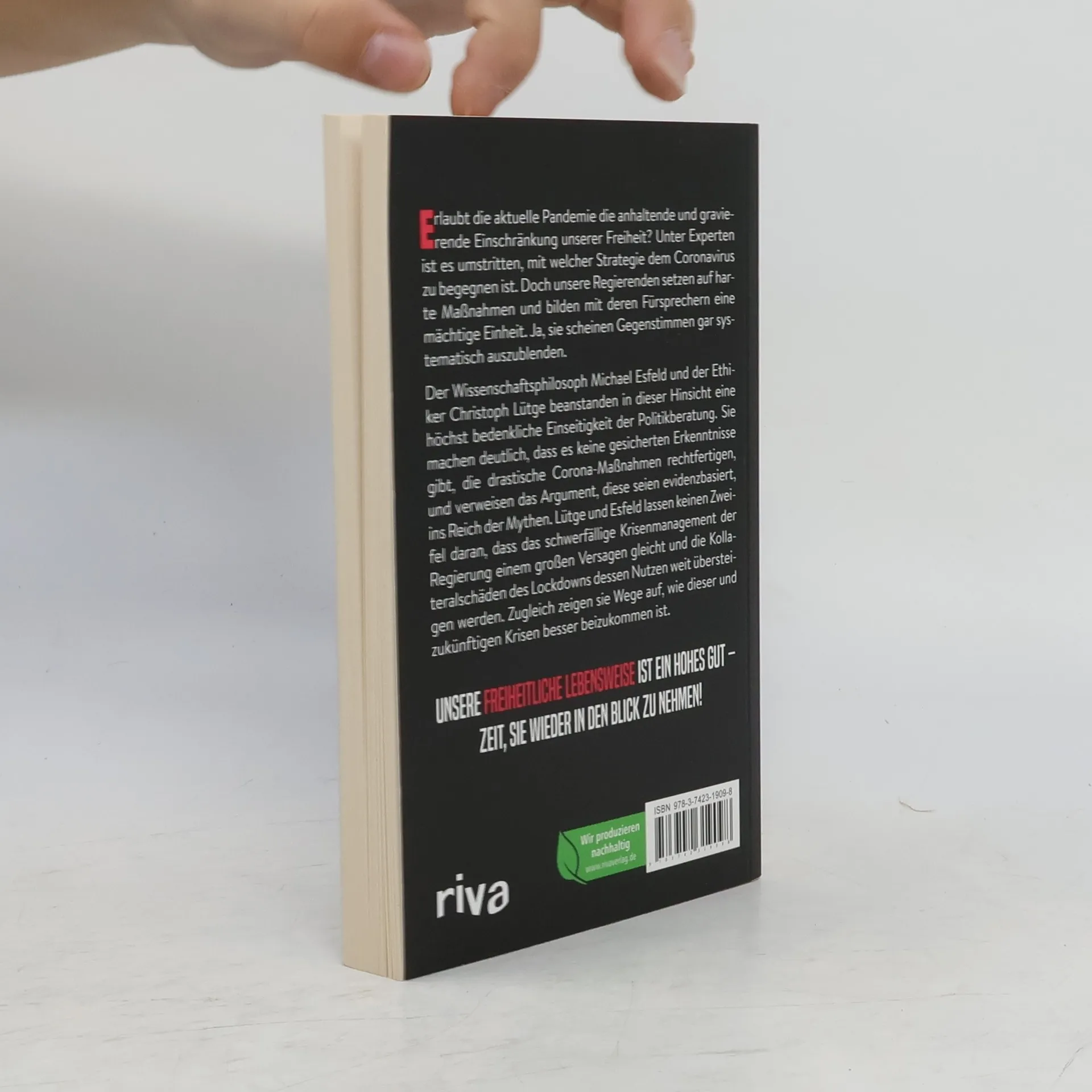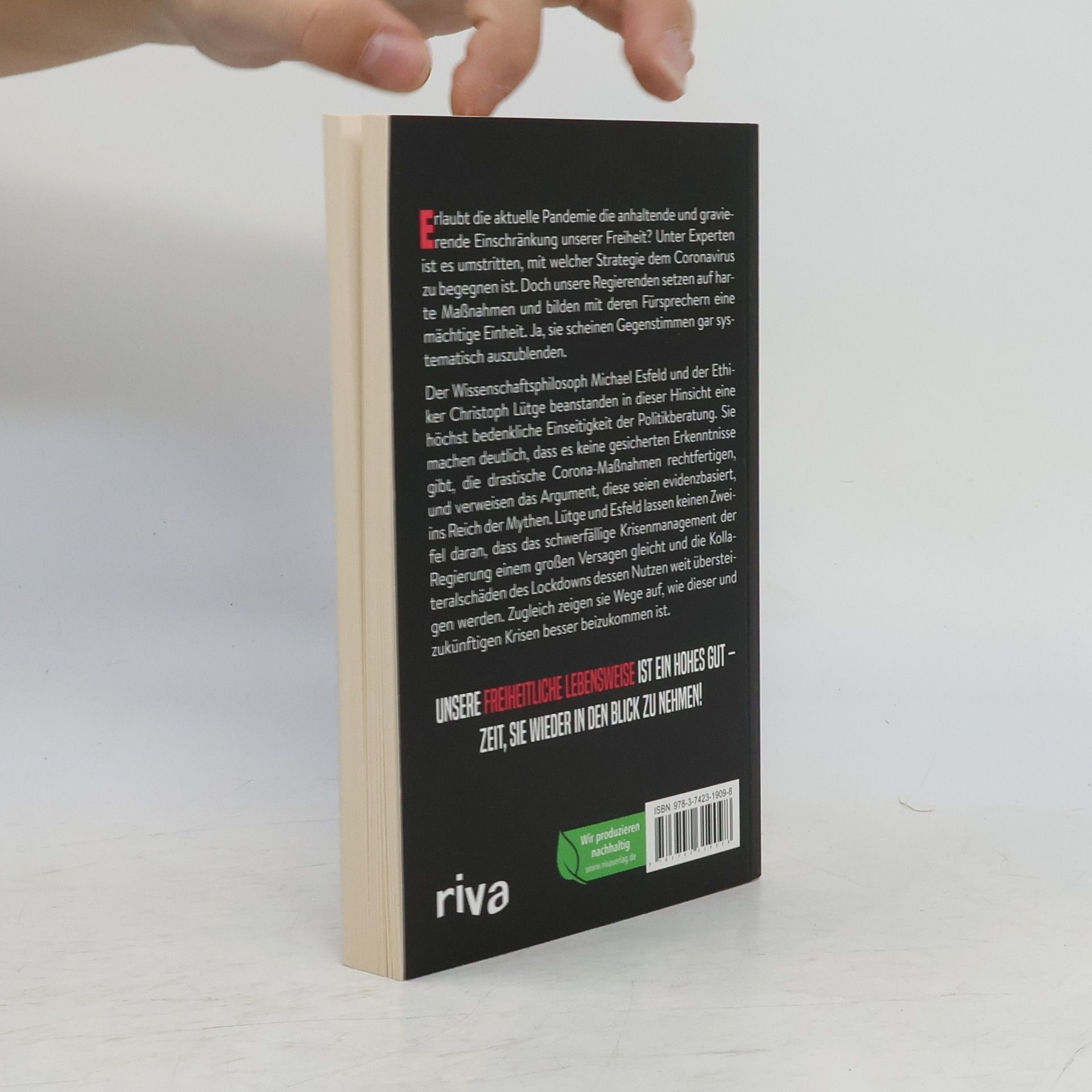 Erlaubt die aktuelle Pandemie die anhaltende und gravierende Einschränkung unserer Freiheit? Unter Experten ist es umstritten, mit welcher Strategie dem Coronavirus zu begegnen ist. Doch unsere Regierenden setzen auf harte Maßnahmen und bilden mit deren Fürsprechern eine mächtige Einheit. Ja, sie scheinen Gegenstimmen gar systematisch auszublenden. Der Wissenschaftsphilosoph Michael Esfeld und der Ethiker Christoph Lütge beanstanden in dieser Hinsicht eine höchst bedenkliche Einseitigkeit der Politikberatung. Sie machen deutlich, dass es keine gesicherten Erkenntnisse gibt, die drastische Corona-Maßnahmen rechtfertigen, und verweisen das Argument, diese seien evidenzbasiert, ins Reich der Mythen. Lütge und Esfeld lassen keinen Zweifel daran, dass das schwerfällige Krisenmanagement der Regierung einem großen Versagen gleicht und die Kollateralschäden des Lockdowns dessen Nutzen weit übersteigen werden. Zugleich zeigen sie Wege auf, wie dieser und zukünftigen Krisen besser beizukommen ist. Unsere freiheitliche Lebensweise ist ein hohes Gut – Zeit, sie wieder in den Blick zu nehmen!