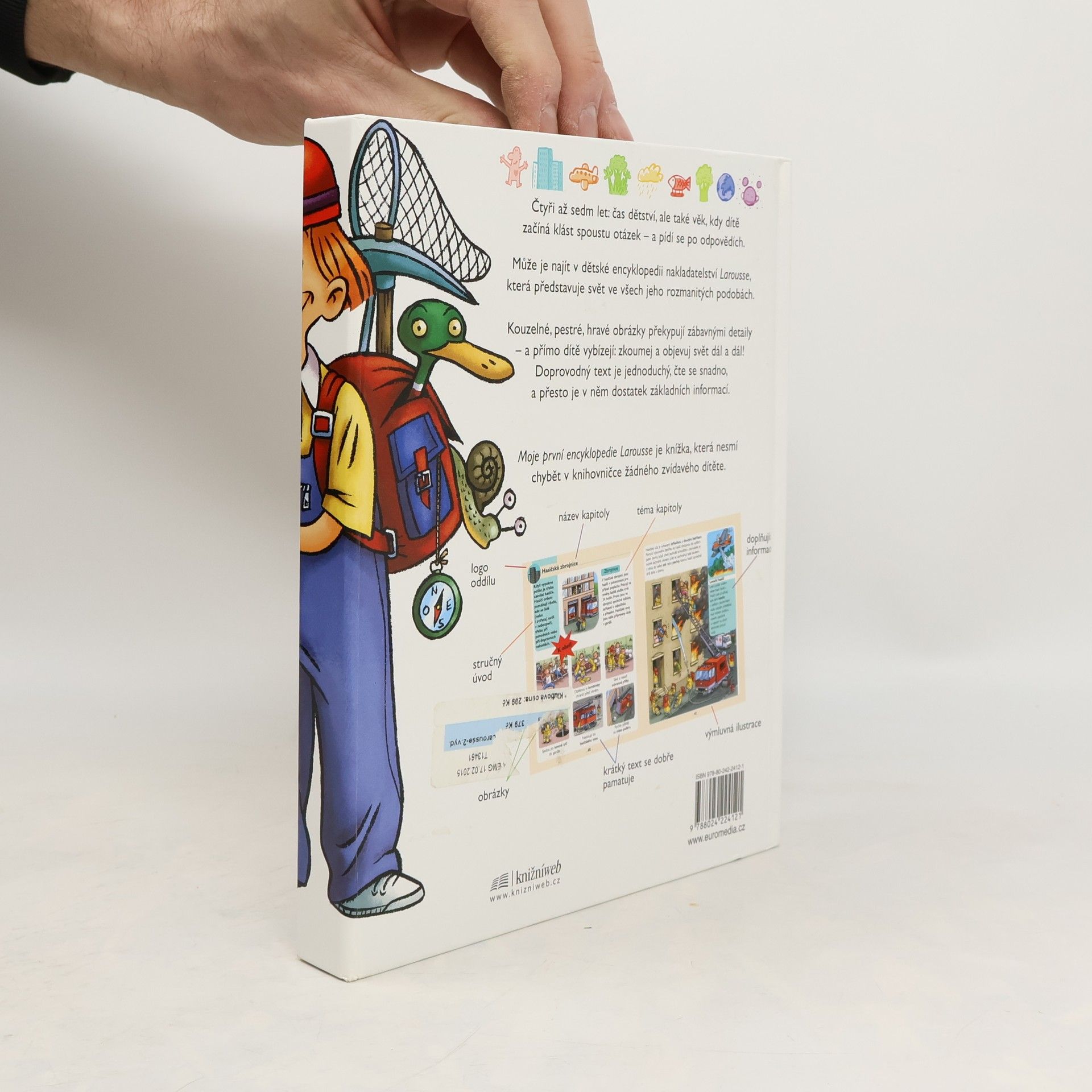 Čtyři až sedm let: čas dětství, ale také věk, kdy dítě začíná klást spoustu otázek - a pídí se po odpovědích. Může je najít v dětské encyklopedii prestižního francouzského nakladatelství Larousse, která představuje svět ve všech jeho rozmanitých podobách. Kouzelné, pestré, hravé obrázky knihy překypují zábavnými detaily - a přímo dítě vybízejí: zkoumej a objevuj svět dál a dál! Doprovodný text je jednoduchý, čte se snadno, a přesto je v něm dostatek základních informací. Moje první encyklopedie Larousse je knížka, která nesmí chybět v knihovničce žádného zvídavého dítěte.