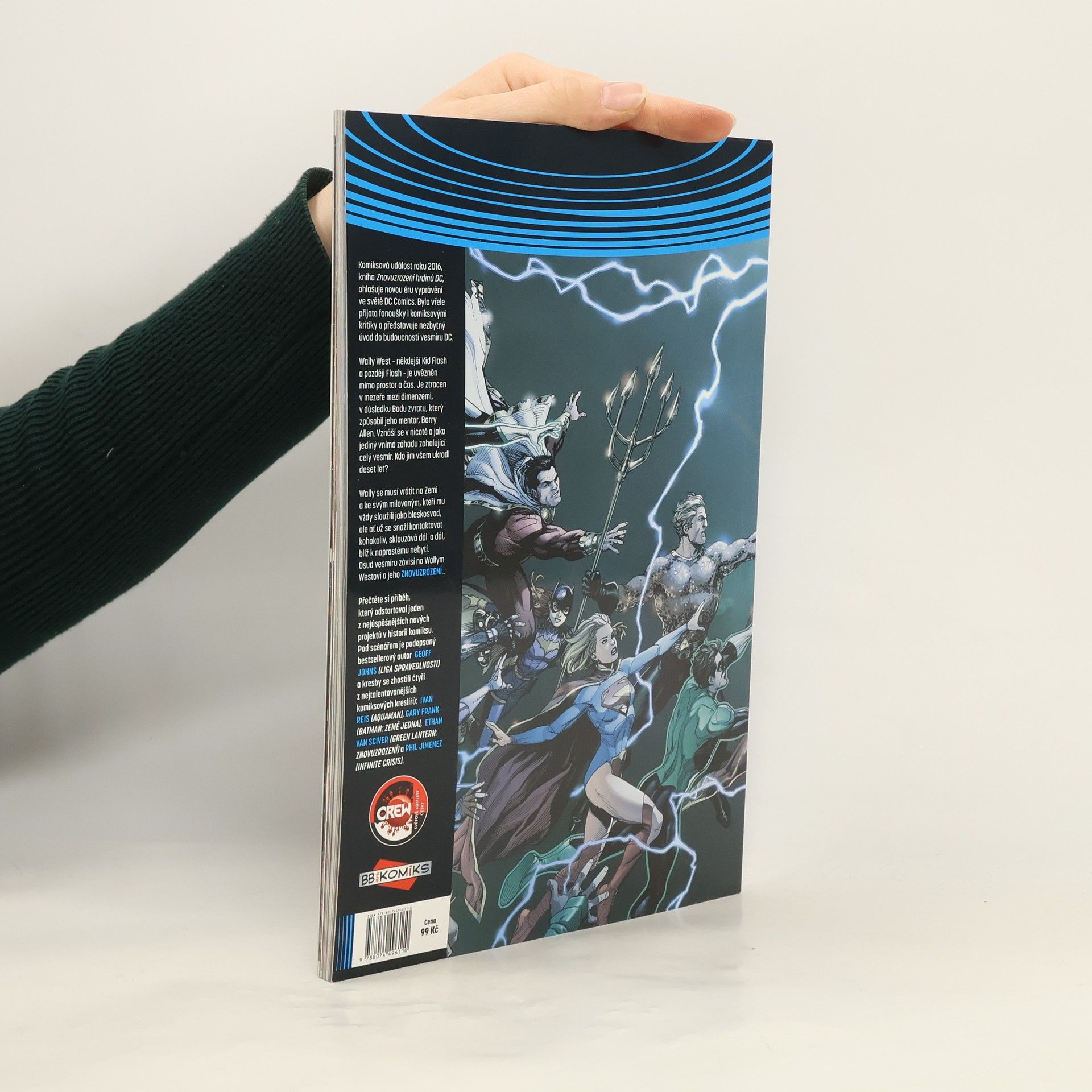 Komiksová událost roku 2016, kniha Znovuzrození hrdinů DC, ohlašuje novou éru vyprávění ve světě DC Comics. Byla vřele přijata fanoušky i komiksovými kritiky a představuje nezbytný úvod do budoucnosti vesmíru DC. Wally West – někdejší Kid Flash a později Flash – je uvězněn mimo prostor a čas. Je ztracen v mezeře mezi dimenzemi, v důsledku Bodu zvratu, který způsobil jeho mentor, Barry Allen. Vznáší se v nicotě a jako jediný vnímá záhadu zasahující celý vesmír. Kdo jim všem ukradl deset let? Wally se musí vrátit na Zemi a ke svým milovaným, kteří mu vždy sloužili jako bleskosvod, ale ať už se snaží kontaktovat kohokoliv, sklouzává dál a dál, blíž k naprostému nebytí. Osud vesmíru závisí na Wallym Westovi a jeho Znovuzrození... Přečtěte si příběh, který odstartoval jeden z nejúspěšnějších nových projektů v historii komiksu. Pod scénářem je podepsaný bestsellerový autor Geoff Johns (Liga spravedlnosti) a kresby se zhostili čtyři z nejtalentovanějších komiksových kreslířů: Ivan Reis (Aquaman), Gary Frank (Batman: Země jedna), Ethan Van Sciver (Green Lantern: Znovuzrození) a Phil Jimenez (Infinite Crisis).