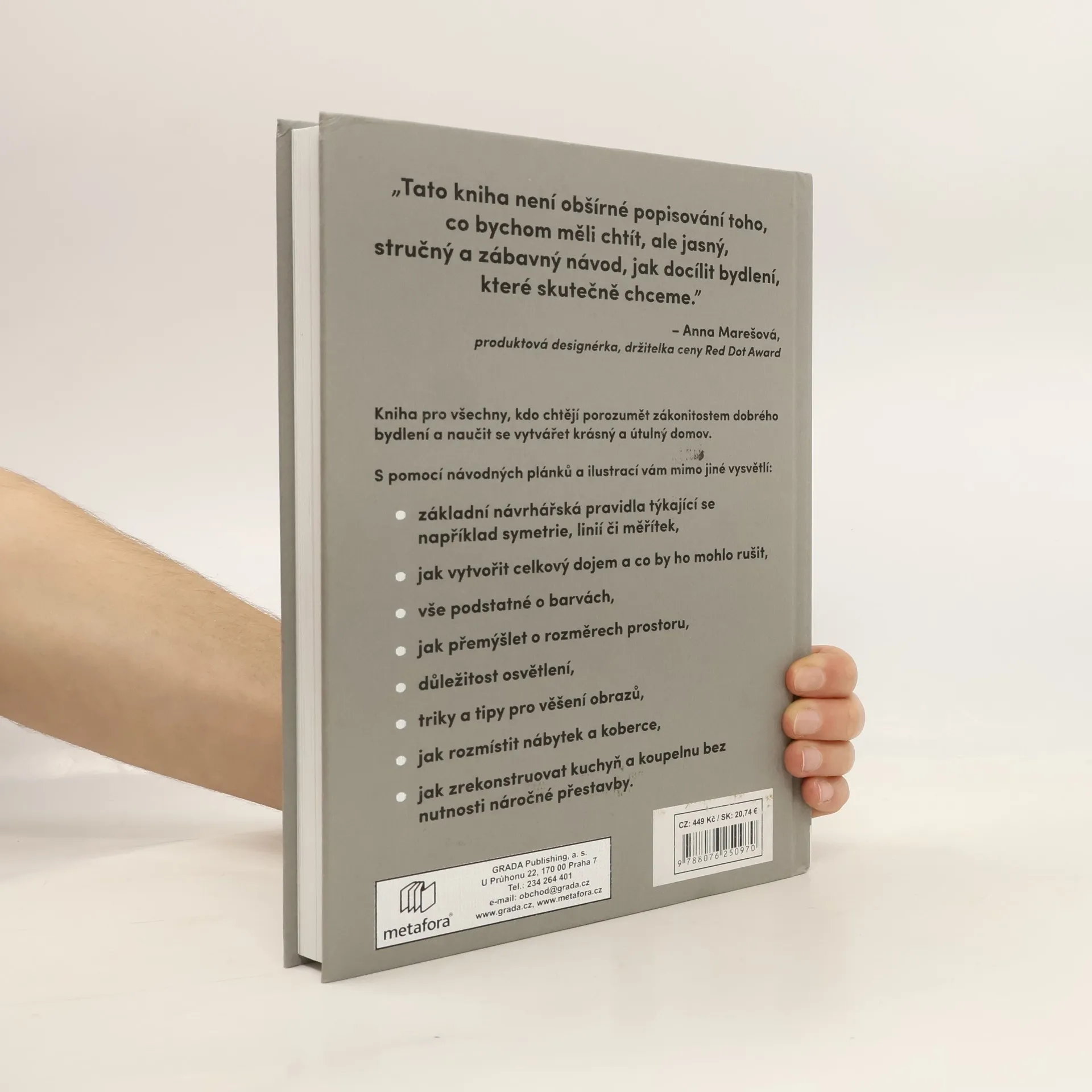 Jak vytvořit funkční a příjemný domov? Dnes víme více o dekoracích a trendech, ale základní návrhářské principy nám unikají. Přestože investujeme do rekonstrukcí a doplňků, mnoho lidí není se svým domovem spokojeno. Interiérová návrhářka Frida Ramstedtová sestavila praktickou příručku pro ty, kteří chtějí mít osobitý a hezký domov. Kniha shrnuje know-how designérů a osvědčená pravidla pro zařizování interiérů, včetně triků a tipů, jak se vyhnout chybám a uniformitě. Návodné plánky a ilustrace jasně vysvětlují základní návrhářská pravidla, jako jsou symetrie, linie a měřítka. Učí, jak aplikovat designérskou matematiku, například „zlatý řez“, a jak vytvořit celkový dojem prostoru. Dále se zaměřuje na barvy, rozměry, proporce, osvětlení a tipy pro věšení obrazů. Zahrnuje také rady na vytváření příjemných zátiší, práci s akustikou, rozmístění nábytku a koberce, a jak zrekonstruovat kuchyň a koupelnu bez náročné přestavby. Tato kniha je určena všem, kdo chtějí porozumět zákonitostem dobrého bydlení a naučit se, jak vytvořit krásný a útulný domov.