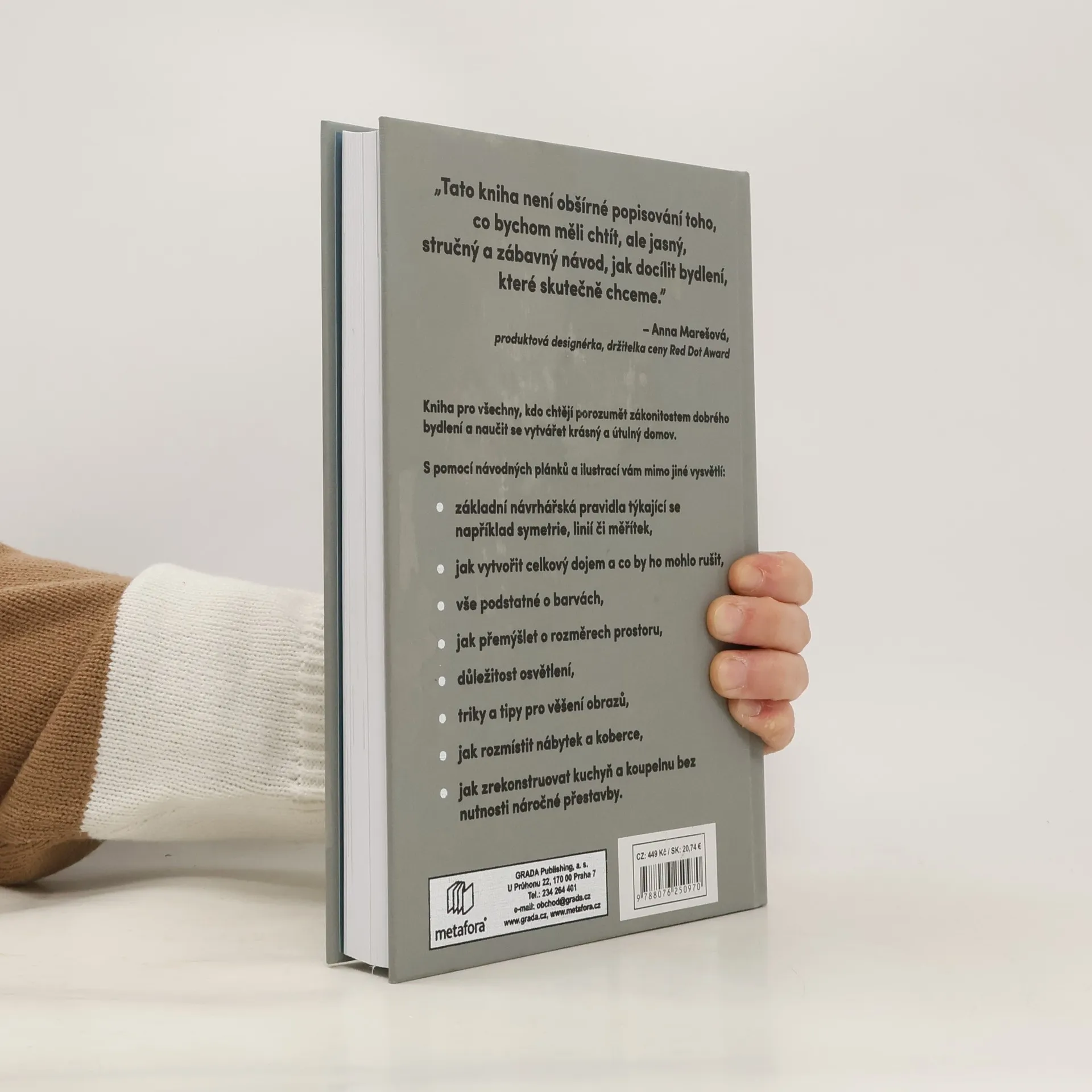 Jak vytvořit funkční a příjemný domov? Dnes víme více o dekoracích a trendech, ale základní návrhářské principy nám unikají. Přestože investujeme do rekonstrukcí a doplňků, mnoho lidí není se svým domovem spokojeno. Interiérová návrhářka Frida Ramstedtová sestavila praktickou příručku pro ty, kteří chtějí mít osobitý a hezký domov. Kniha shrnuje know-how designérů a osvědčená pravidla pro zařizování interiérů, včetně triků a tipů, jak se vyhnout chybám a uniformitě. Návodné plánky a ilustrace jasně vysvětlují základní návrhářská pravidla, jako jsou symetrie, linie a měřítka. Učí, jak aplikovat designérskou matematiku, například „zlatý řez“, a jak vytvořit celkový dojem prostoru. Dále se zaměřuje na barvy, rozměry, proporce, osvětlení a tipy pro věšení obrazů. Zahrnuje také rady na vytváření příjemných zátiší, práci s akustikou, rozmístění nábytku a koberce, a jak zrekonstruovat kuchyň a koupelnu bez náročné přestavby. Tato kniha je určena všem, kdo chtějí porozumět zákonitostem dobrého bydlení a naučit se, jak vytvořit krásný a útulný domov.