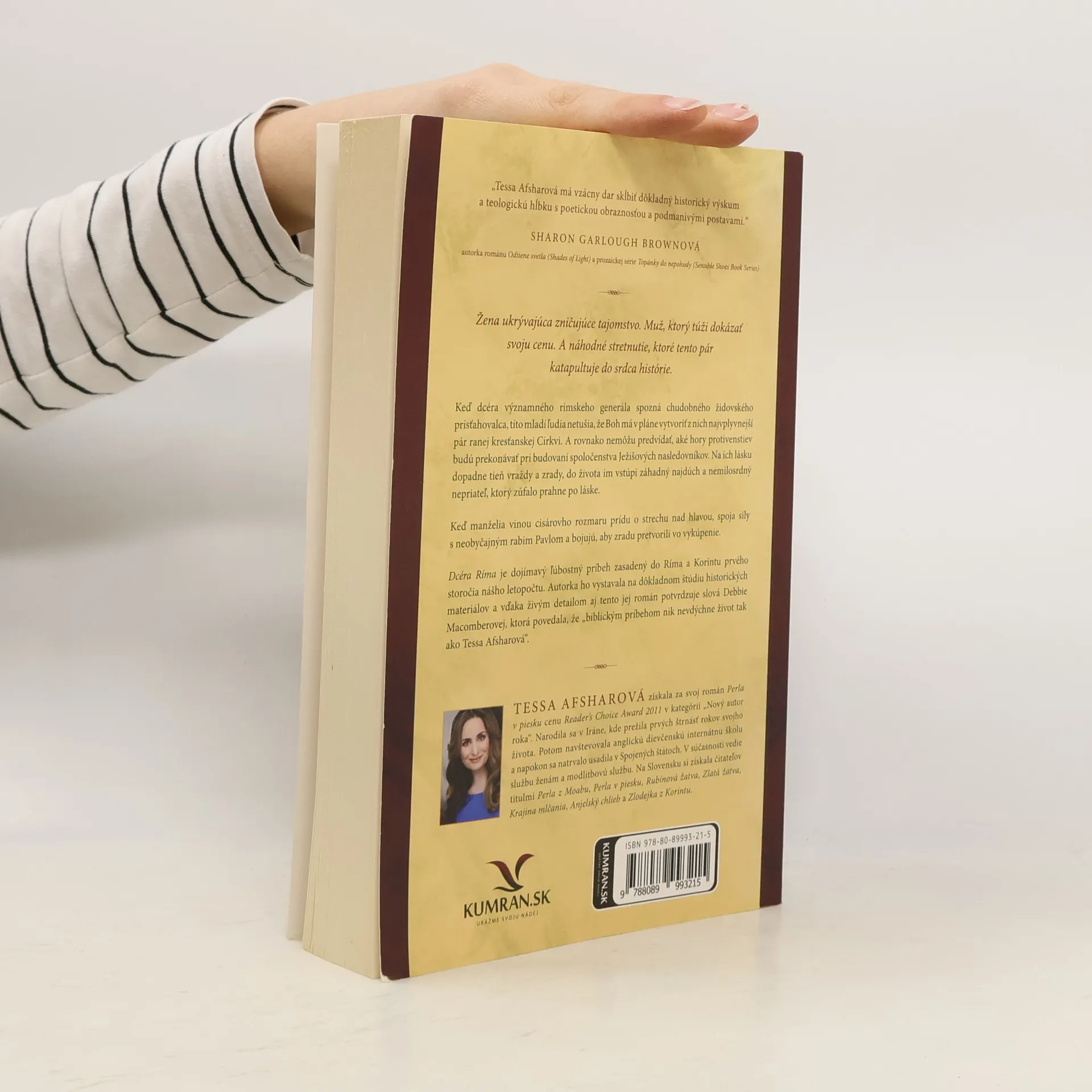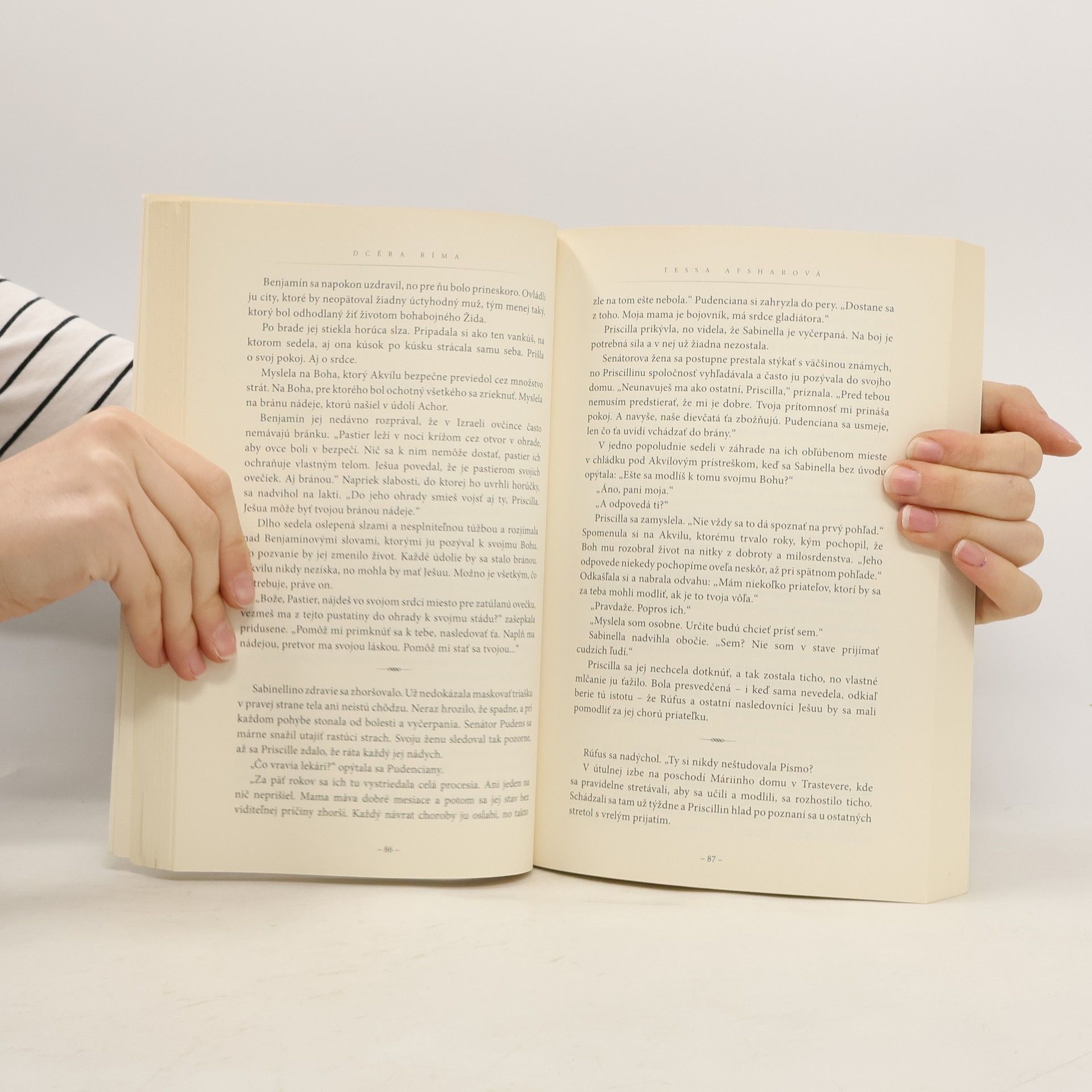 Žena ukrývajúca zničujúce tajomstvo. Muž, ktorý túži dokázať svoju cenu. A náhodné stretnutie, ktoré tento pár katapultuje do srdca histórie. Keď dcéra významného rímskeho generála spozná chudobného židovského prisťahovalca, títo mladí ľudia netušia, že Boh má v pláne vytvoriť z nich najvplyvnejší pár ranej kresťanskej Cirkvi. A rovnako nemôžu predvídať, aké hory protivenstiev budú prekonávať pri budovaní spoločenstva Ježišových nasledovníkov. Na ich lásku dopadne tieň vraždy a zrady, do života im vstúpi záhadný najdúch a nemilosrdný nepriateľ, ktorý zúfalo prahne po láske. Keď manželia vinou cisárovho rozmaru prídu o strechu nad hlavou, spoja sily s neobyčajným rabim Pavlom a bojujú, aby zradu pretvorili vo vykúpenie. Dcéra Ríma je dojímavý ľúbostný príbeh zasadený do Ríma a Korintu prvého storočia nášho letopočtu. Autorka ho vystavala na dôkladnom štúdiu historických materiálov a vďaka živým detailom aj tento jej román potvrdzuje slová Debbie Macomberovej, ktorá povedala, že „biblickým príbehom nik nevdýchne život tak ako Tessa Afsharová“.