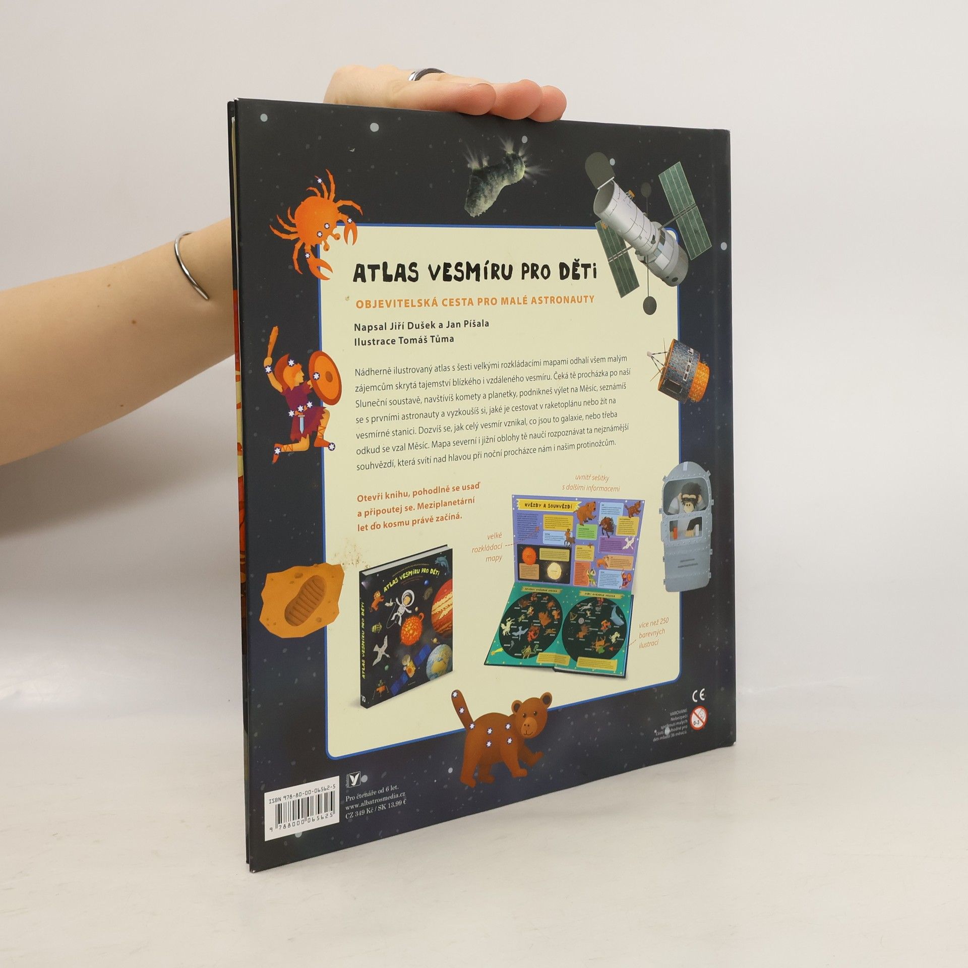 Nádherně ilustrovaný atlas s šesti velkými rozkládacími mapami odhalí všem malým zájemcům skrytá tajemství blízkého i vzdáleného vesmíru. Čeká tě procházka po naší Sluneční soustavě, navštívíš komety a planetky, podnikneš výlet na Měsíc, seznámíš se s prvními astronauty a vyzkoušíš si, jaké je cestovat v raketoplánu nebo žít na vesmírné stanici. Mapa severní i jižní oblohy tě naučí rozpoznávat ta nejznámější souhvězdí.