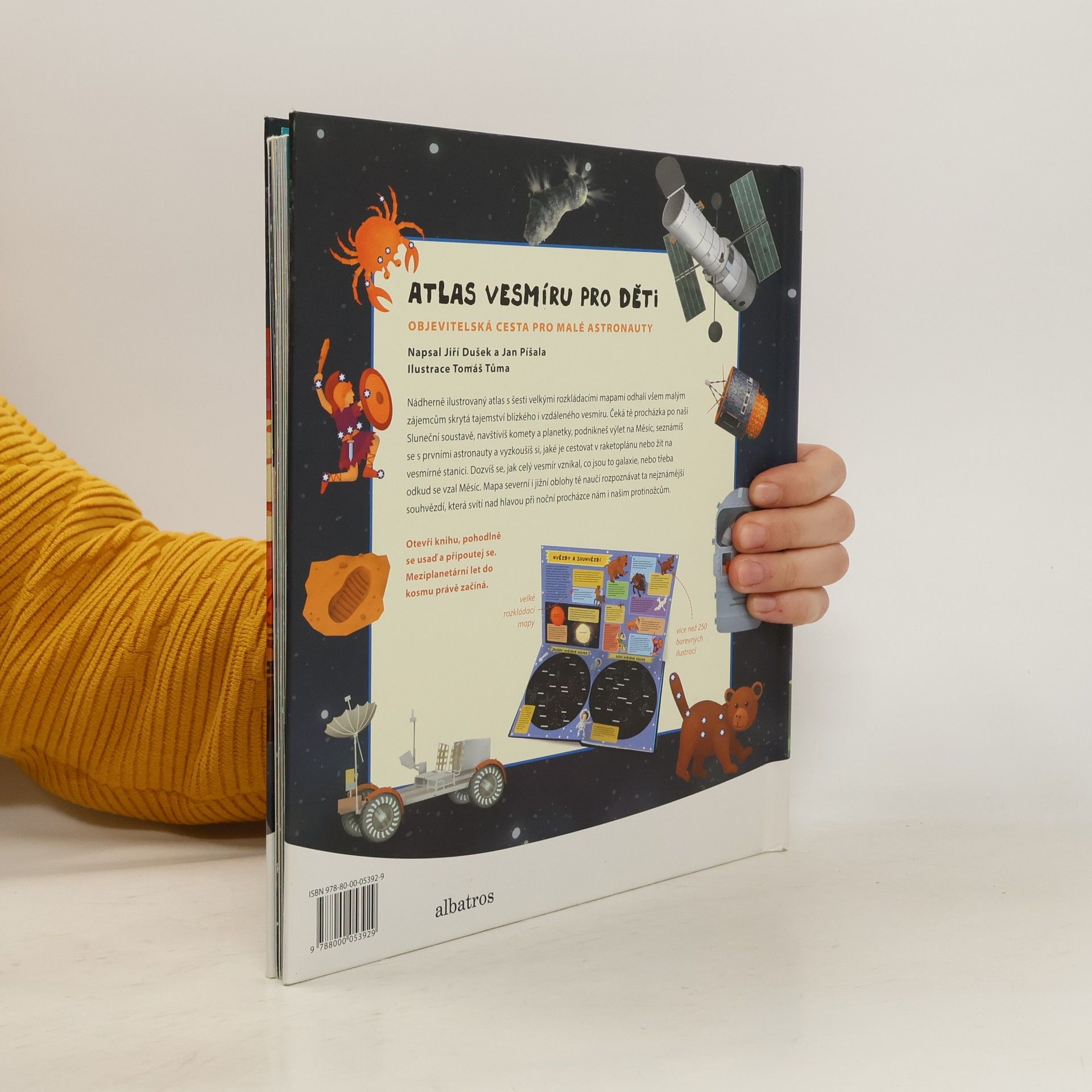 Nádherně ilustrovaný atlas s šesti velkými rozkládacími mapami odhalí všem malým zájemcům skrytá tajemství blízkého i vzdáleného vesmíru. Čeká tě procházka po naší Sluneční soustavě, navštívíš komety a planetky, podnikneš výlet na Měsíc, seznámíš se s prvními astronauty a vyzkoušíš si, jaké je cestovat v raketoplánu nebo žít na vesmírné stanici. Mapa severní i jižní oblohy tě naučí rozpoznávat ta nejznámější souhvězdí.