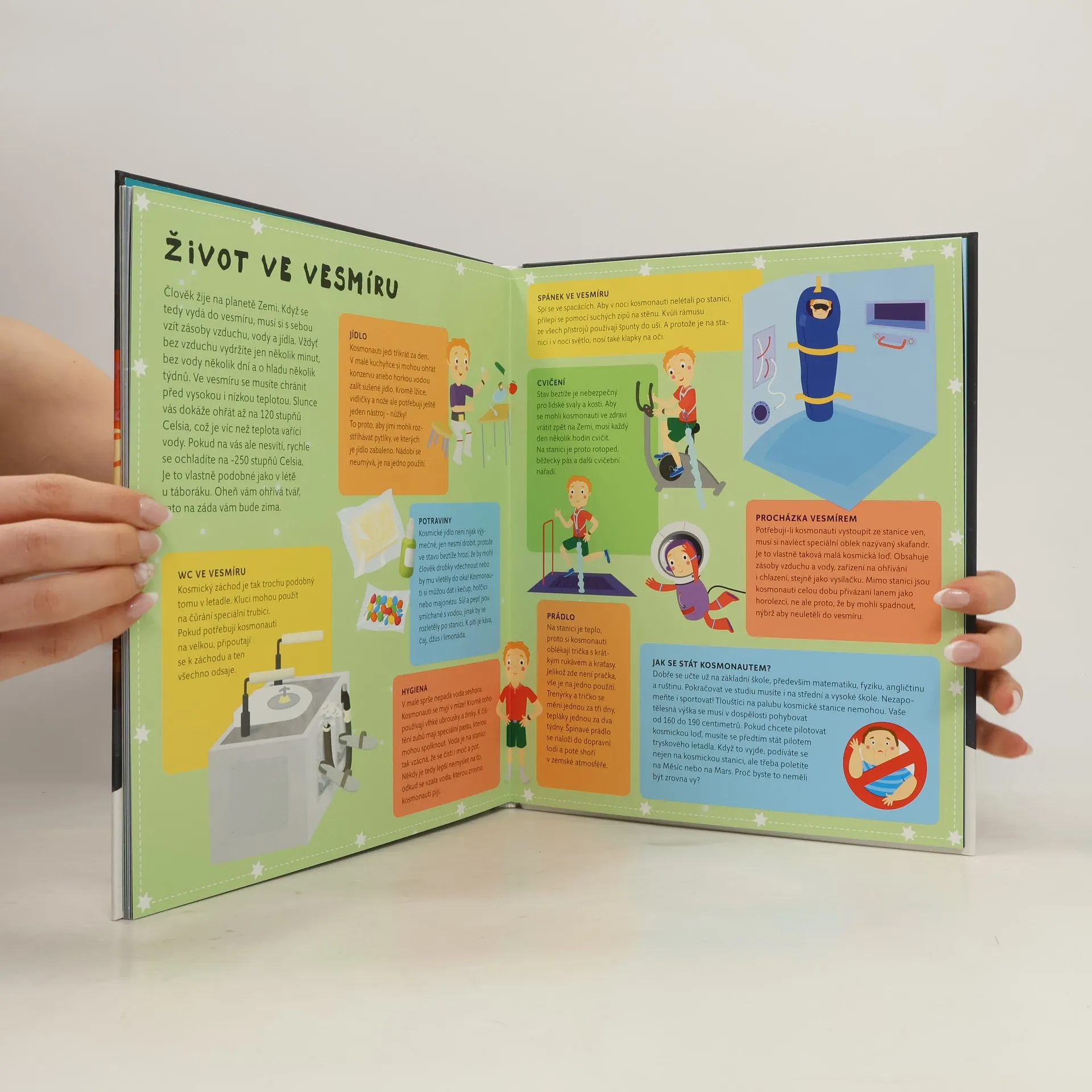 Nádherně ilustrovaný atlas s šesti velkými rozkládacími mapami odhalí všem malým zájemcům skrytá tajemství blízkého i vzdáleného vesmíru. Čeká tě procházka po naší Sluneční soustavě, navštívíš komety a planetky, podnikneš výlet na Měsíc, seznámíš se s prvními astronauty a vyzkoušíš si, jaké je cestovat v raketoplánu nebo žít na vesmírné stanici. Mapa severní i jižní oblohy tě naučí rozpoznávat ta nejznámější souhvězdí.