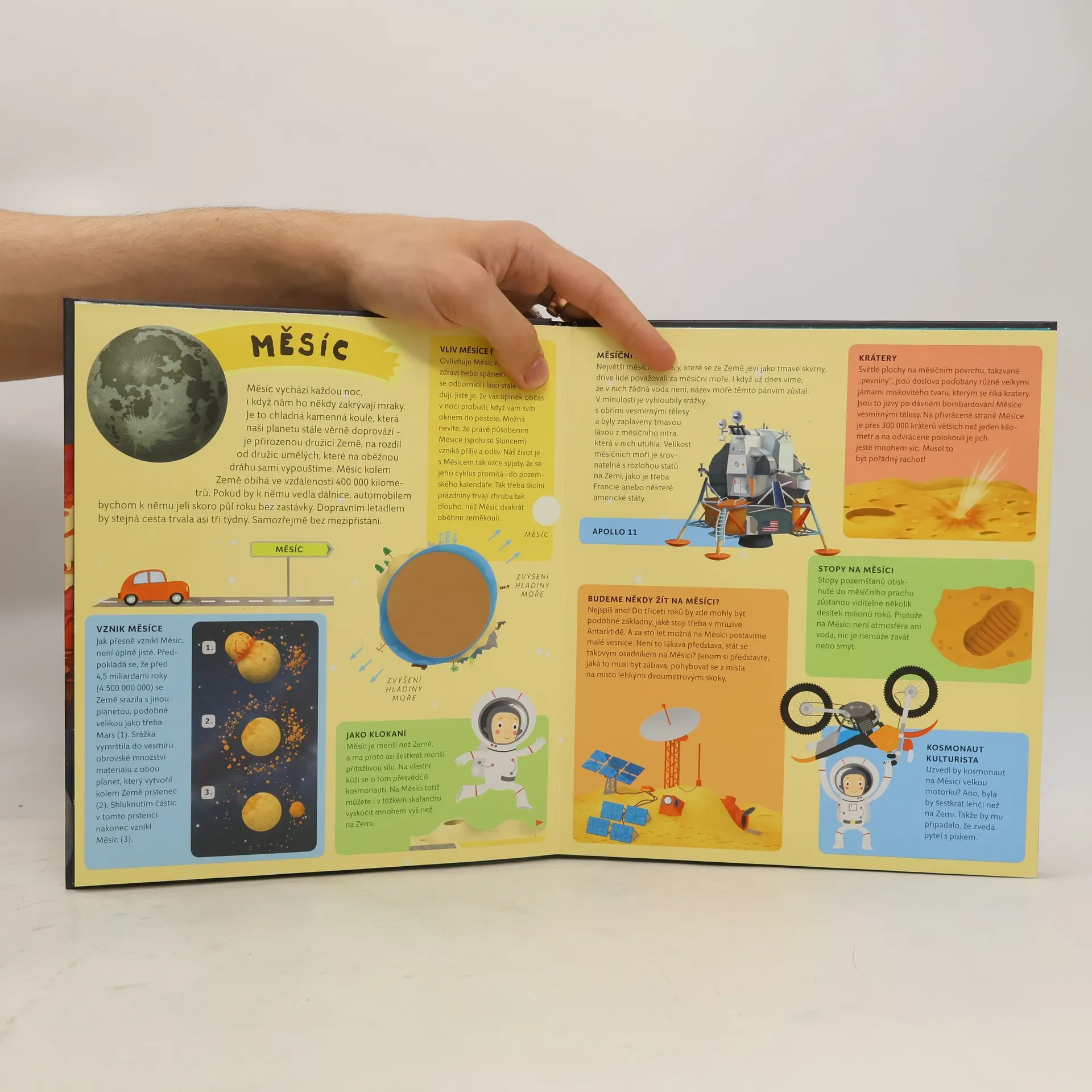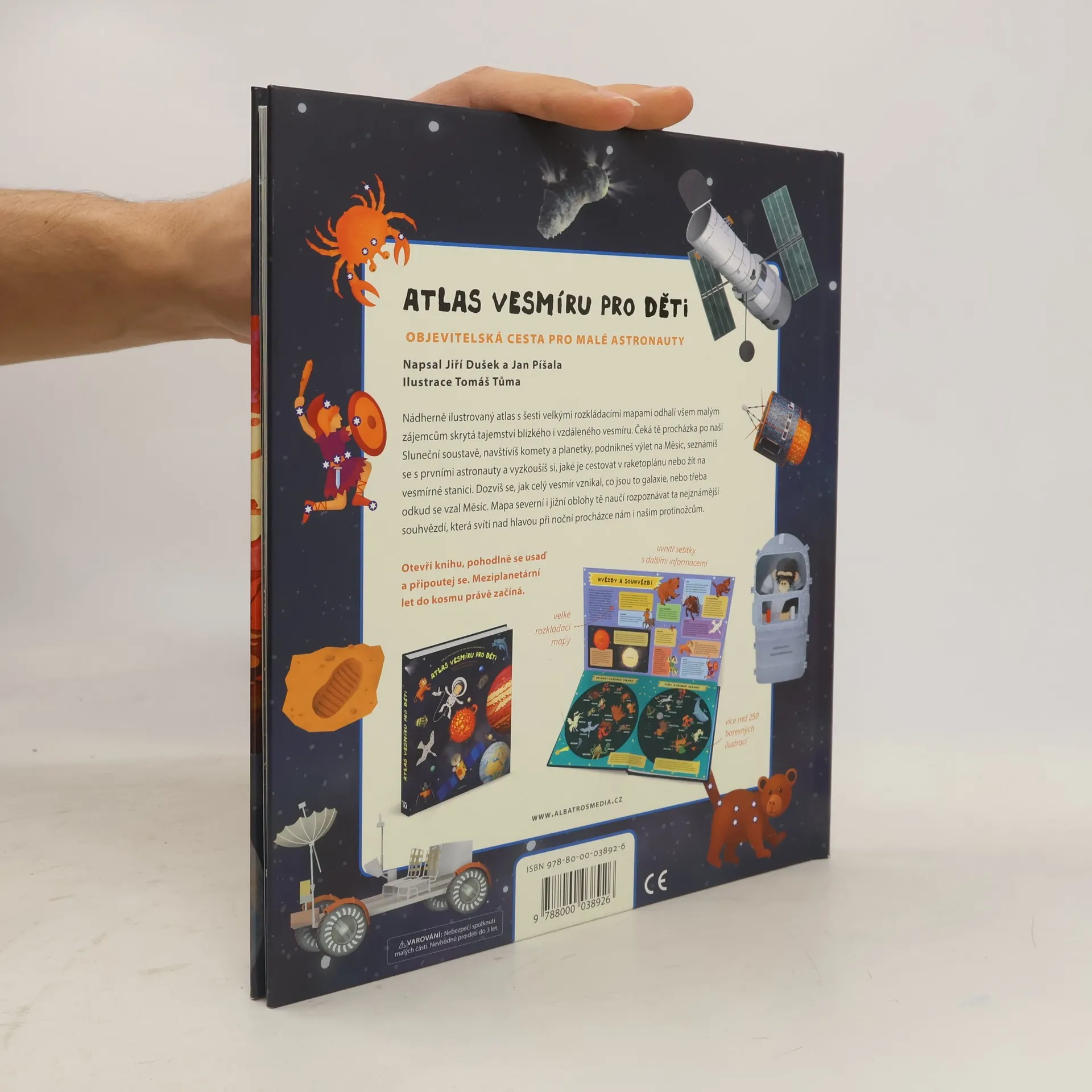 Nádherně ilustrovaný atlas s šesti velkými rozkládacími mapami odhalí všem malým zájemcům skrytá tajemství blízkého i vzdáleného vesmíru. Čeká tě procházka po naší Sluneční soustavě, navštívíš komety a planetky, podnikneš výlet na Měsíc, seznámíš se s prvními astronauty a vyzkoušíš si, jaké je cestovat v raketoplánu nebo žít na vesmírné stanici. Mapa severní i jižní oblohy tě naučí rozpoznávat ta nejznámější souhvězdí.
