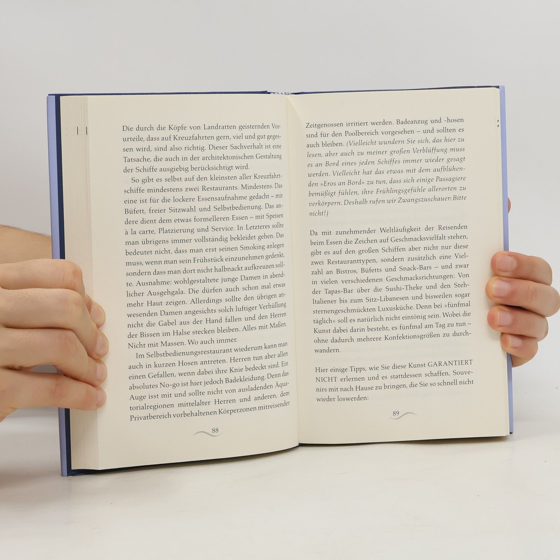Ein Buch für erfahrene Seebären und unbedarfte Landratten Mehr als eine Million Deutsche verbringen »die kostbarsten Wochen des Jahres« auf See. Mit steigender Tendenz – und zwar im zweistelligen Bereich. Warum? Weil es amüsant ist. Und aufregend. Und einfach schön. Genießen Sie unterhaltsame und informative Geschichten von Bord größerer und weniger großer Pötte. Kleinere Malheure und größere Fauxpas. Wohlportioniert und alphabetisch geordnet. Nicht jedem Frischling auf See sind die mehr oder weniger geheimen Regeln und Gesetze an Bord eines Schiffes geläufig. Oft sind es Kleinigkeiten, die den Aufenthalt sehr viel schöner und angenehmer machen. Die einen plötzlich Dinge sehen und genießen lassen, die man leicht übersehen kann. Ein Buch für erfahrene Seebären und unbedarfte Landratten. Die einen kommen hier ins Träumen oder da ins Schmunzeln, und für die anderen ist es ein angenehmer Trockenkurs. Hören Sie das laute »Tuuuut« des Schiffstyphons? Also in Gedanken auf die Planken. »Leinen los!« Wir legen ab. Man glaubt es nicht, aber es ist wirklich eine der meistgestellten Fragen an Bord. Darauf wird gerne von Seekundigen geantwortet: »Wo denken Sie hin! Die werden jeden Abend per Hubschrauber an Land ausgeflogen. Achten Sie mal abends auf die Helikoptergeräusche!«