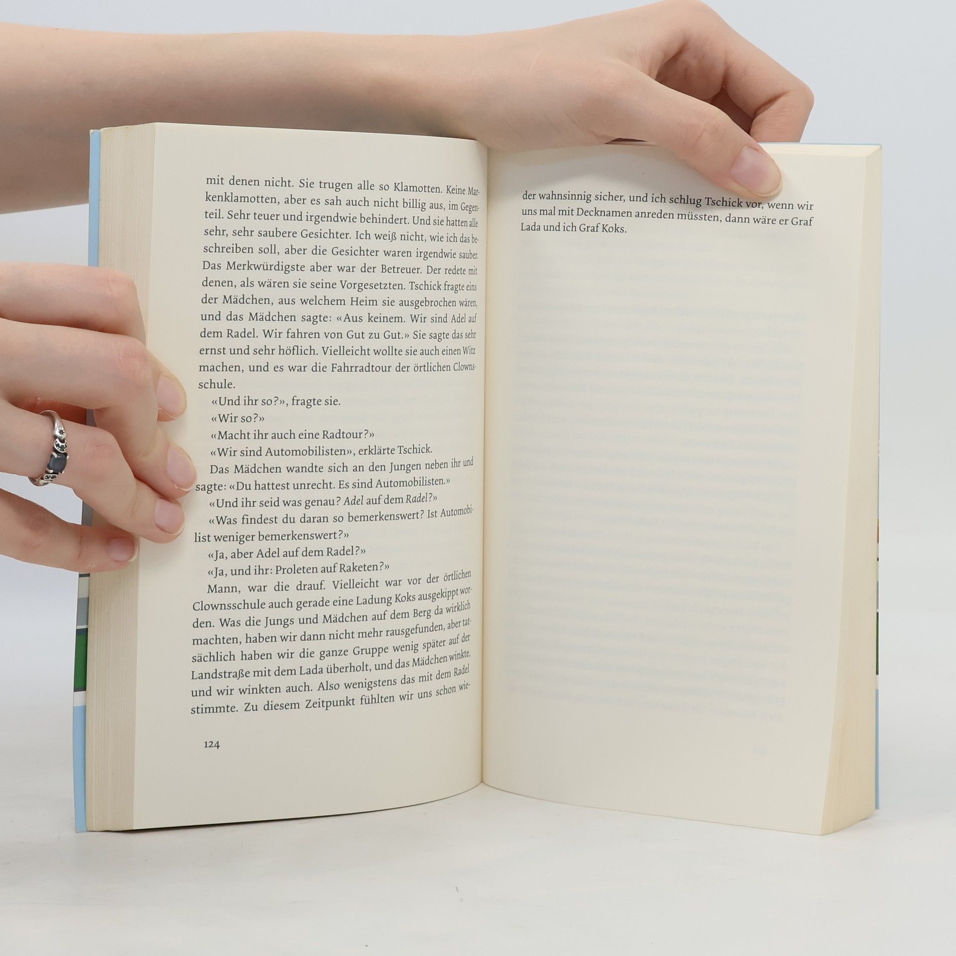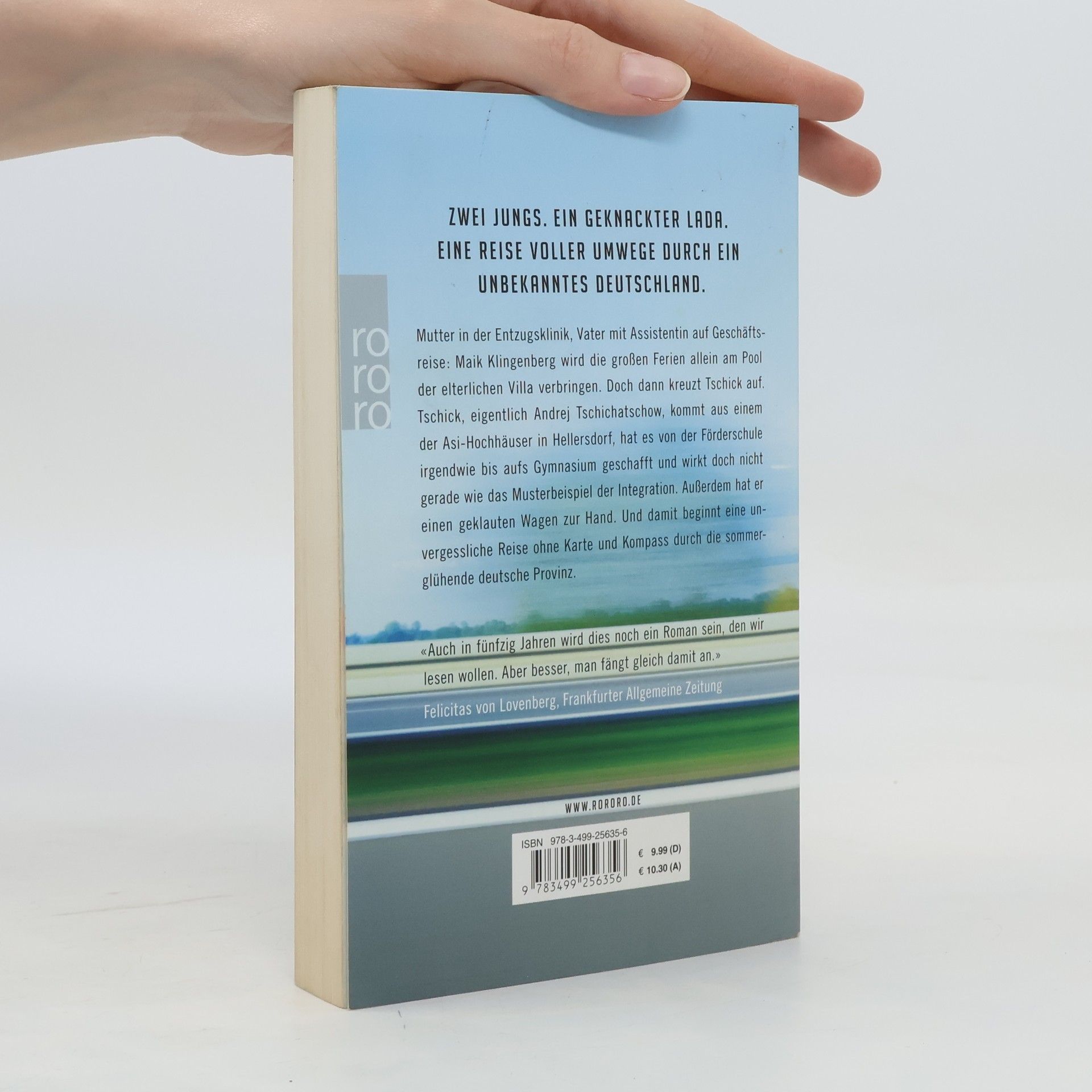 «Ein klappriges Auto kam die Straße runtergefahren. Es fuhr langsam auf unser Haus zu und bog in die Garagenauffahrt ein. Eine Minute stand der hellblaue Lada Niva mit laufendem Motor vor unserer Garage, dann wurde der Motor abgestellt. Die Fahrertür ging auf, Tschick stieg aus. Er legte beide Ellenbogen aufs Autodach und sah zu, wie ich den Rasen sprengte. ‹Ah›, sagte er, und dann sagte er lange nichts mehr. ‹Macht das Spaß?›» Mutter in der Entzugsklinik, Vater mit Assistentin auf Geschäftsreise: Maik Klingenberg wird die großen Ferien allein am Pool der elterlichen Villa verbringen. Doch dann kreuzt Tschick auf. Tschick, eigentlich Andrej Tschichatschow, kommt aus einem der Asi-Hochhäuser in Hellersdorf, hat es von der Förderschule irgendwie bis aufs Gymnasium geschafft und wirkt doch nicht gerade wie das Musterbeispiel der Integration. Außerdem hat er einen geklauten Wagen zur Hand. Und damit beginnt eine Reise ohne Karte und Kompass durch die sommerglühende deutsche Provinz, unvergesslich wie die Flussfahrt von Tom Sawyer und Huck Finn.