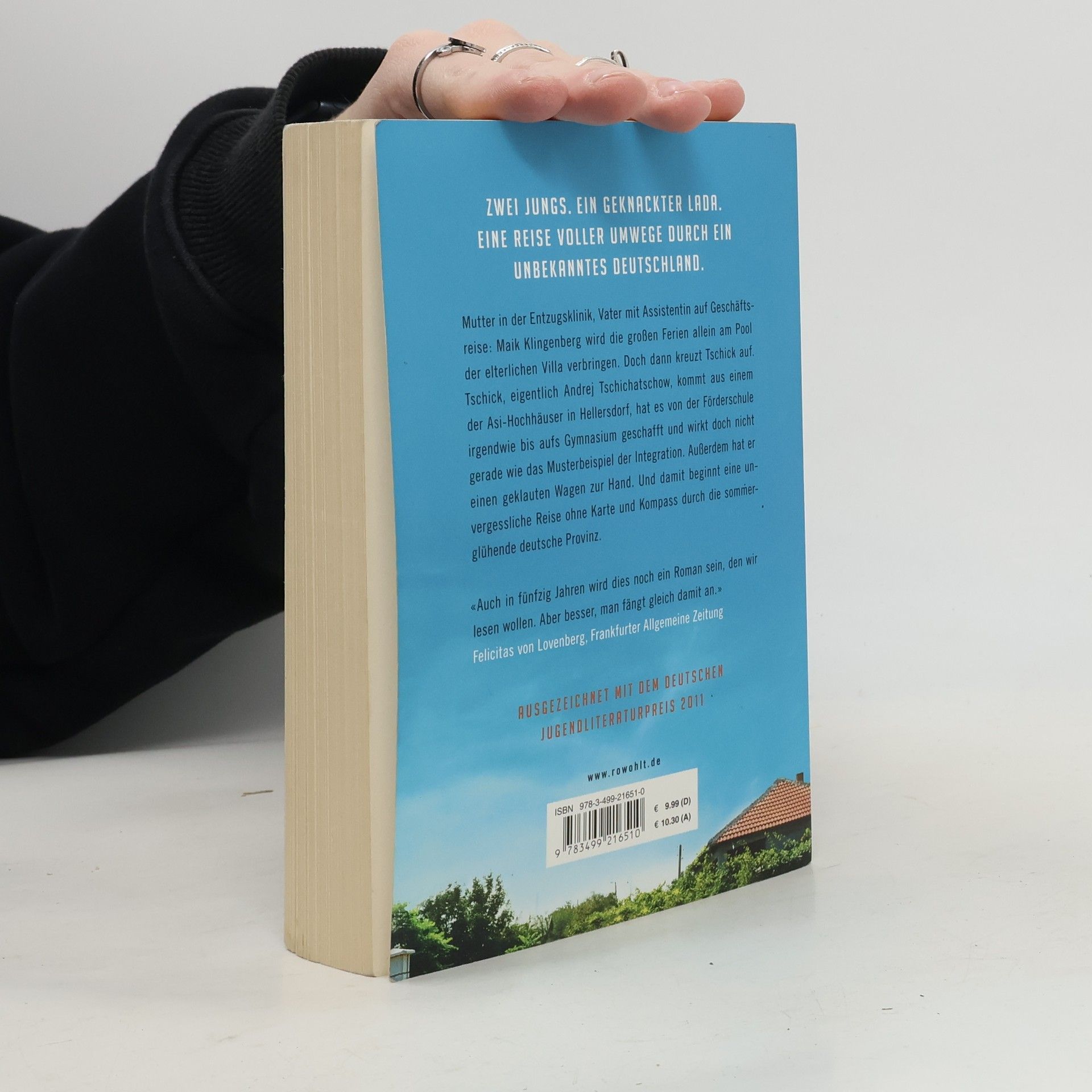 Zwei Jungs. Ein geknackter Lada. Eine Reise voller Umwege durch ein unbekanntes Deutschland.Mutter in der Entzugsklinik, Vater mit Assistentin auf Geschäftsreise: Maik Klingenberg wird die großen Ferien allein am Pool der elterlichen Villa verbringen. Doch dann kreuzt Tschick auf. Tschick, eigentlich Andrej Tschichatschow, kommt aus einem der Asi-Hochhäuser in Hellersdorf, hat es von der Förderschule irgendwie bis aufs Gymnasium geschafft und wirkt doch nicht gerade wie das Musterbeispiel der Integration. Außerdem hat er einen geklauten Wagen zur Hand. Und damit beginnt eine unvergessliche Reise ohne Karte und Kompass durch die sommerglühende deutsche Provinz.«Auch in fünfzig Jahren wird dies noch ein Roman sein, den wir lesen wollen. Aber besser, man fängt gleich damit an.» Felicitas von Lovenberg, Frankfurter Allgemeine ZeitungAusgezeichnet mit dem Deutschen Jugendliteraturpreis 2011