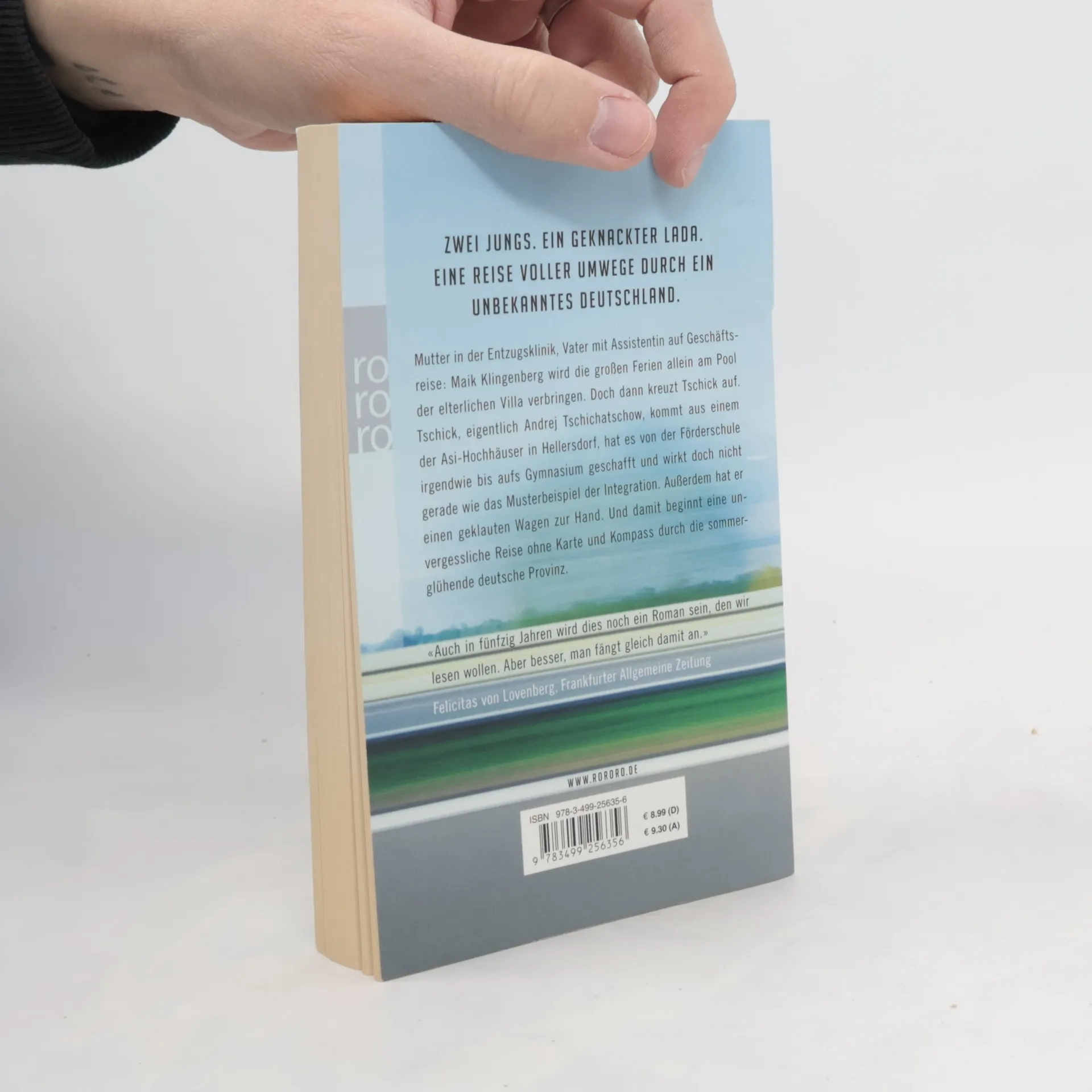 «Ein klappriges Auto kam die Straße runtergefahren. Es fuhr langsam auf unser Haus zu und bog in die Garagenauffahrt ein. Eine Minute stand der hellblaue Lada Niva mit laufendem Motor vor unserer Garage, dann wurde der Motor abgestellt. Die Fahrertür ging auf, Tschick stieg aus. Er legte beide Ellenbogen aufs Autodach und sah zu, wie ich den Rasen sprengte. ‹Ah›, sagte er, und dann sagte er lange nichts mehr. ‹Macht das Spaß?›» Mutter in der Entzugsklinik, Vater mit Assistentin auf Geschäftsreise: Maik Klingenberg wird die großen Ferien allein am Pool der elterlichen Villa verbringen. Doch dann kreuzt Tschick auf. Tschick, eigentlich Andrej Tschichatschow, kommt aus einem der Asi-Hochhäuser in Hellersdorf, hat es von der Förderschule irgendwie bis aufs Gymnasium geschafft und wirkt doch nicht gerade wie das Musterbeispiel der Integration. Außerdem hat er einen geklauten Wagen zur Hand. Und damit beginnt eine Reise ohne Karte und Kompass durch die sommerglühende deutsche Provinz, unvergesslich wie die Flussfahrt von Tom Sawyer und Huck Finn.