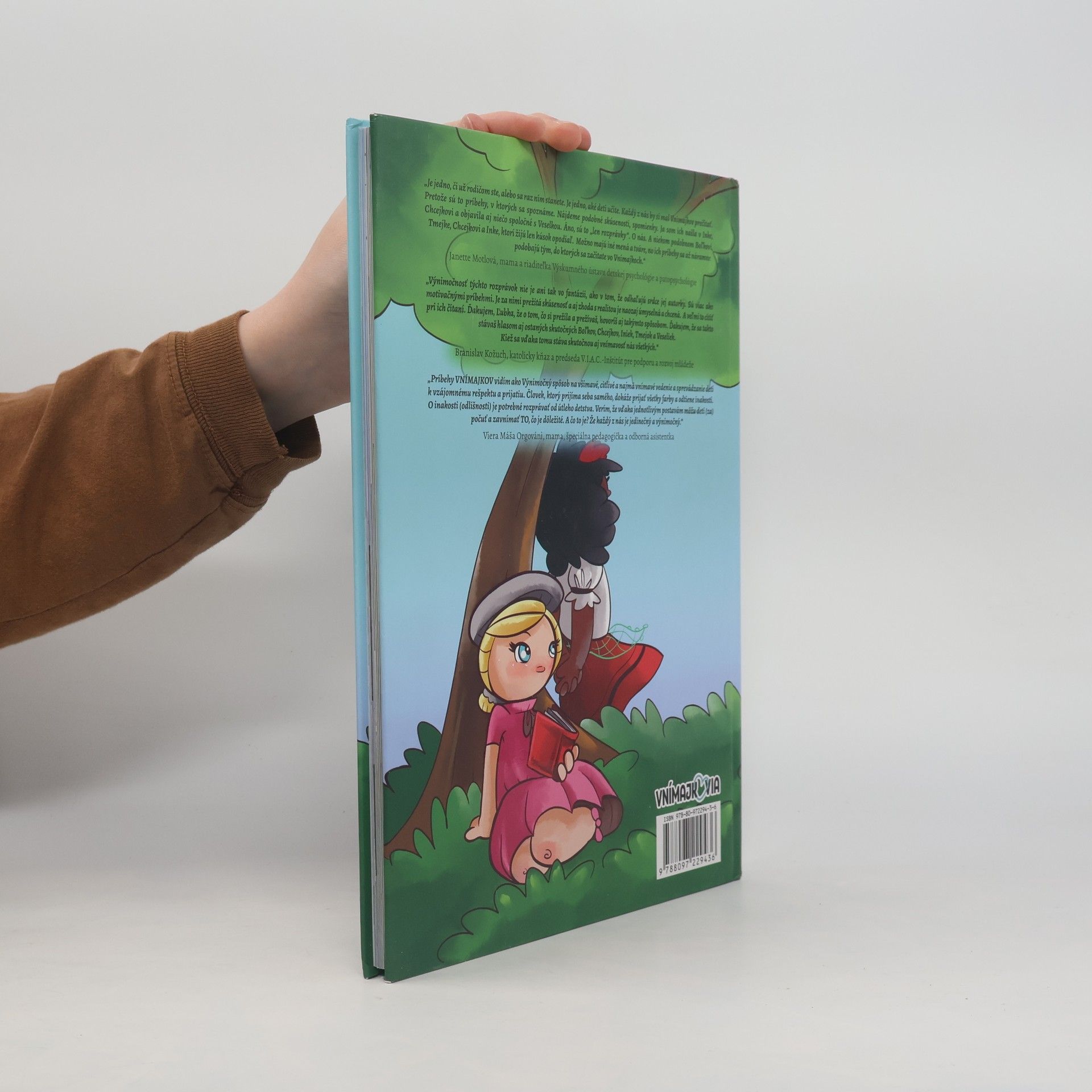 Vnímajkovia sú hrdinovia rozprávok, ktorí sa odlišujú od bežných postáv, no sú si podobní s deťmi. Ich príbehy sa zaoberajú citlivými témami odlišnosti, o ktorých sa zriedka hovorí. Tmejka, dievčatko, ktoré nevidí, vníma svet hlbšie ako iní. Spolu so psíkom Chrumkom zažíva veselé aj zamyslenia vyvolávajúce chvíle o svete nevidiacich. Chcejko je chudobný chlapec, ktorý žije na okraji lesa so svojou mamou a objavuje nový svet v škôlke, kde sa stretáva s priateľmi. Boľko, chlapec s boľavými kostami, sa nevzdáva, a s pomocou rodiny a kamarátov prekonáva prekážky s úsmevom. Inka, dievčatko s inou farbou pleti, ukazuje, že jej hodnota nie je menšia ako ostatných. Veselka je šťastná a štedrá, dokazujúc, že kto veľa dostal, dokáže aj veľa dať. Vnímajkovia sa stretávajú v príbehoch, ktoré oslavujú rozmanitosť a krásu sveta. Kniha hovorí o odlišnostiach jednoduchým a milým jazykom, pričom oslovuje deti aj dospelých. Príbehy ponúkajú hodnotu a potešia srdce, zatiaľ čo ilustrácie oslovia všetkých čitateľov. Záporných hrdinov tu nenájdete, len pozitívne posolstvá.
