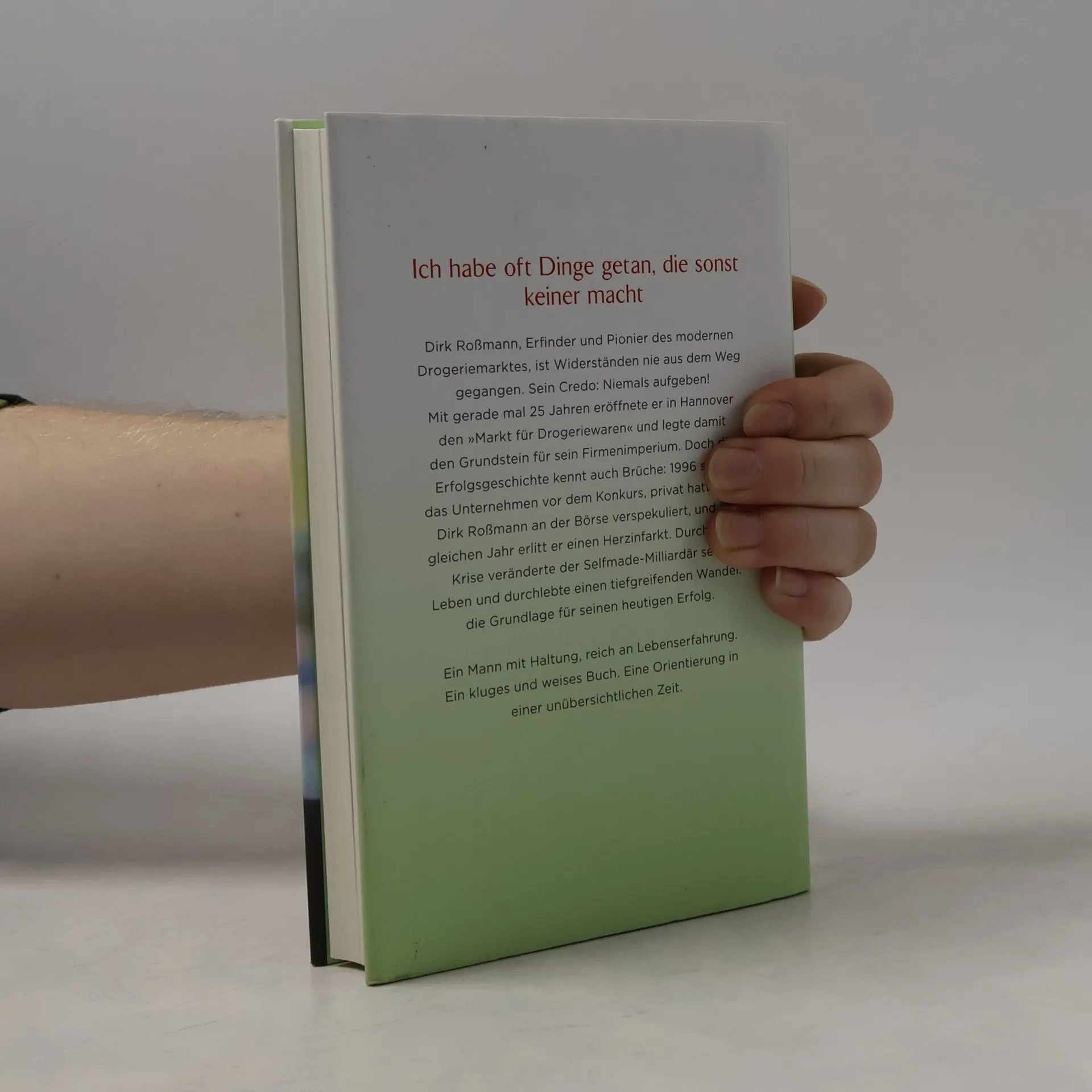 Ich habe oft Dinge getan, die sonst keiner macht Er ist ein Mann der Widersprüche. Harter Wettbewerber einerseits, sozial engagiert andererseits. Dirk Roßmann, Erfinder und Pionier des modernen Drogeriemarktes, große Unternehmerpersönlichkeit und mehrfacher Millionär. Widerständen ist er nie aus dem Weg gegangen. Sein Credo: niemals aufgeben! Bereits im Alter von 12 zeigte sich sein Unternehmergeist: Er lieferte Drogerieartikel mit dem Fahrrad aus und verkaufte sie 10 Prozent billiger. Mit gerade mal 25 Jahren eröffnete er in Hannover den „Markt für Drogeriewaren“ und legte damit den Grundstein für sein Firmenimperium. Doch die Erfolgsgeschichte kennt auch Brüche: 1996 stand das Unternehmen vor dem Konkurs, privat hatte sich Dirk Roßmann an der Börse verspekuliert, und im gleichen Jahr erlitt er einen Herzinfarkt. "Von da an habe ich alles auf Null gestellt und versucht, die Firma zu retten." Durch diese Krise veränderte Dirk Roßmann sein Leben und durchlebte einen tiefgreifenden Wandel. Das sieht er heute als Grund für seinen Erfolg an. - Ein Mann mit Haltung, reich an Lebenserfahrung, ein kluges und weises Buch, eine Orientierung in einer unübersichtlichen Zeit.