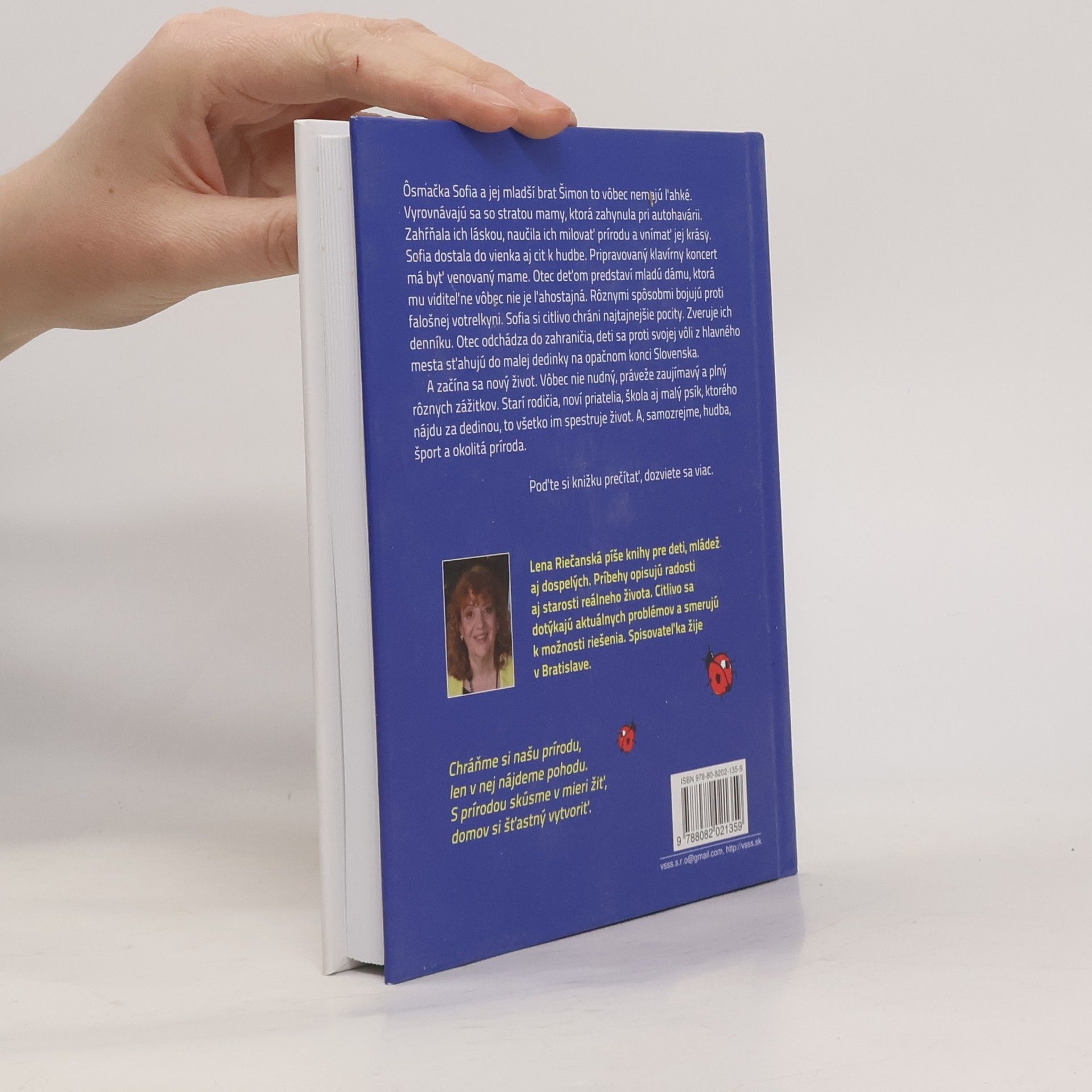 Lena Riečanská píše knihy pre deti, mládež aj dospelých. Príbehy opisujú radosti aj starosti reálneho života. Citlivo sa dotýkajú aktuálnych problémov a smerujú k možnosti riešenia. A o čom je jej nová knižka? ?smačka Sofia a jej mladší brat Šimon to vôbec nemajú ľahké. Vyrovnávajú sa so stratou mamy, ktorá zahynula pri autohavárii. Zahŕňala ich láskou, naučila ich milovať prírodu a vnímať jej krásy. Sofia dostala do vienka aj cit k hudbe. Pripravovaný klavírny koncert má byť venovaný mame. Otec deťom predstaví mladú dámu, ktorá mu viditeľne vôbec nie je ľahostajná. Rôznymi spôsobmi bojujú proti falošnej votrelkyni. Sofia si citlivo chráni najtajnejšie pocity. Zveruje ich denníku. Otec odchádza do zahraničia, deti sa proti svojej vôli z hlavného mesta sťahujú do malej dedinky na opačnom konci Slovenska. A začína sa nový život. Vôbec nie nudný, práveže zaujímavý a plný rôznych zážitkov. Starí rodičia, noví priatelia, škola aj malý psík, ktorého nájdu za dedinou, to všetko im spestruje život. A, samozrejme, hudba, šport a okolitá príroda. Poďte si knižku prečítať, dozviete sa viac...
