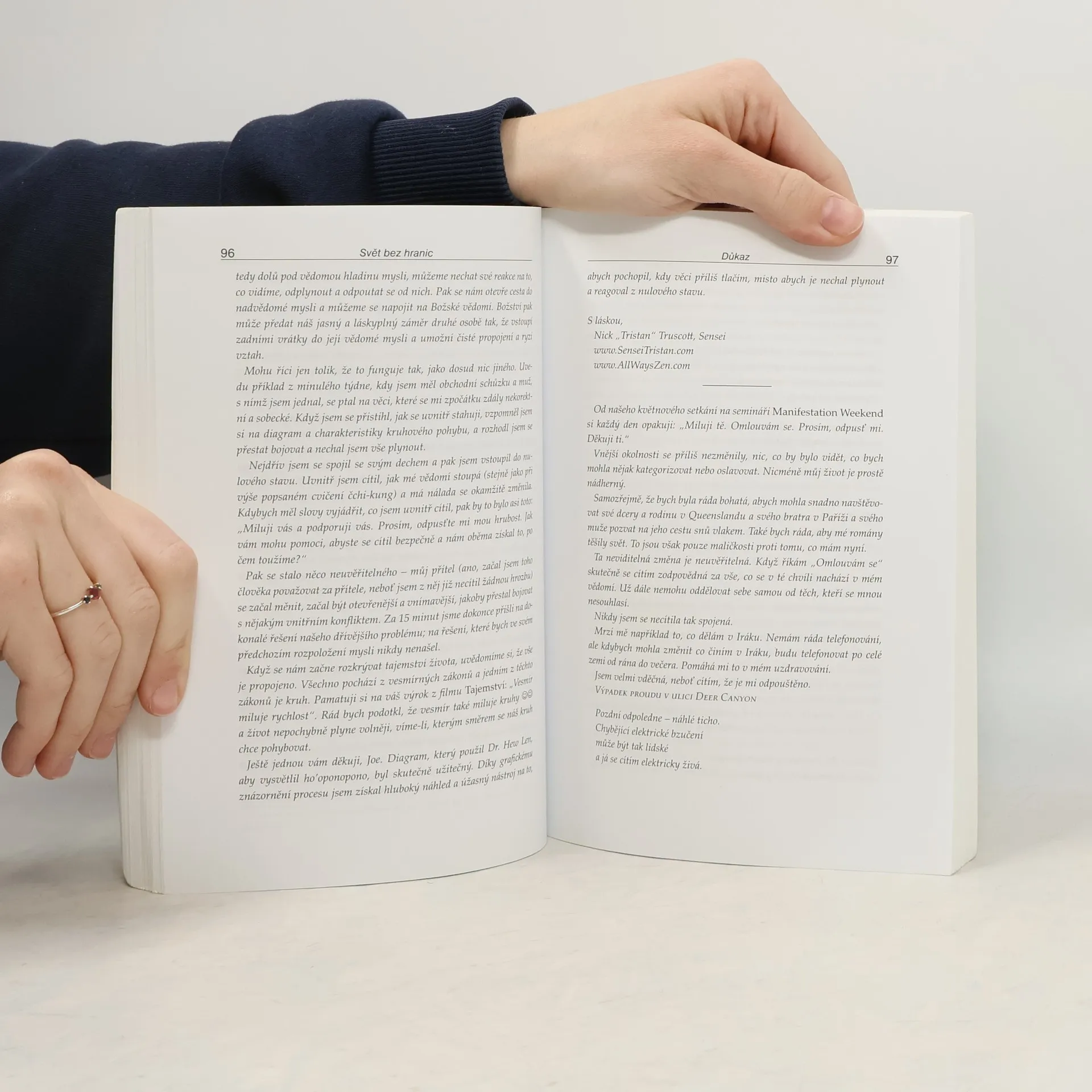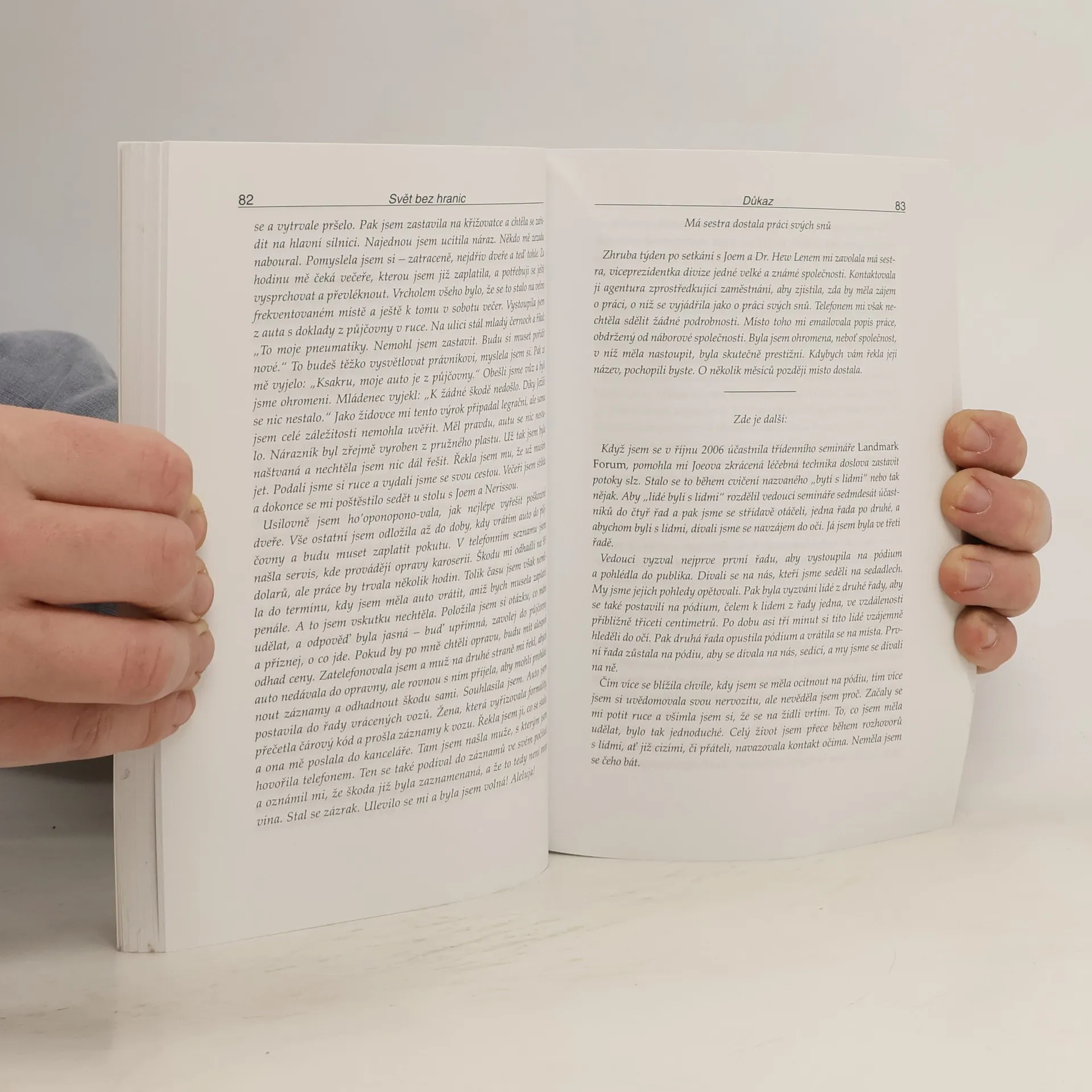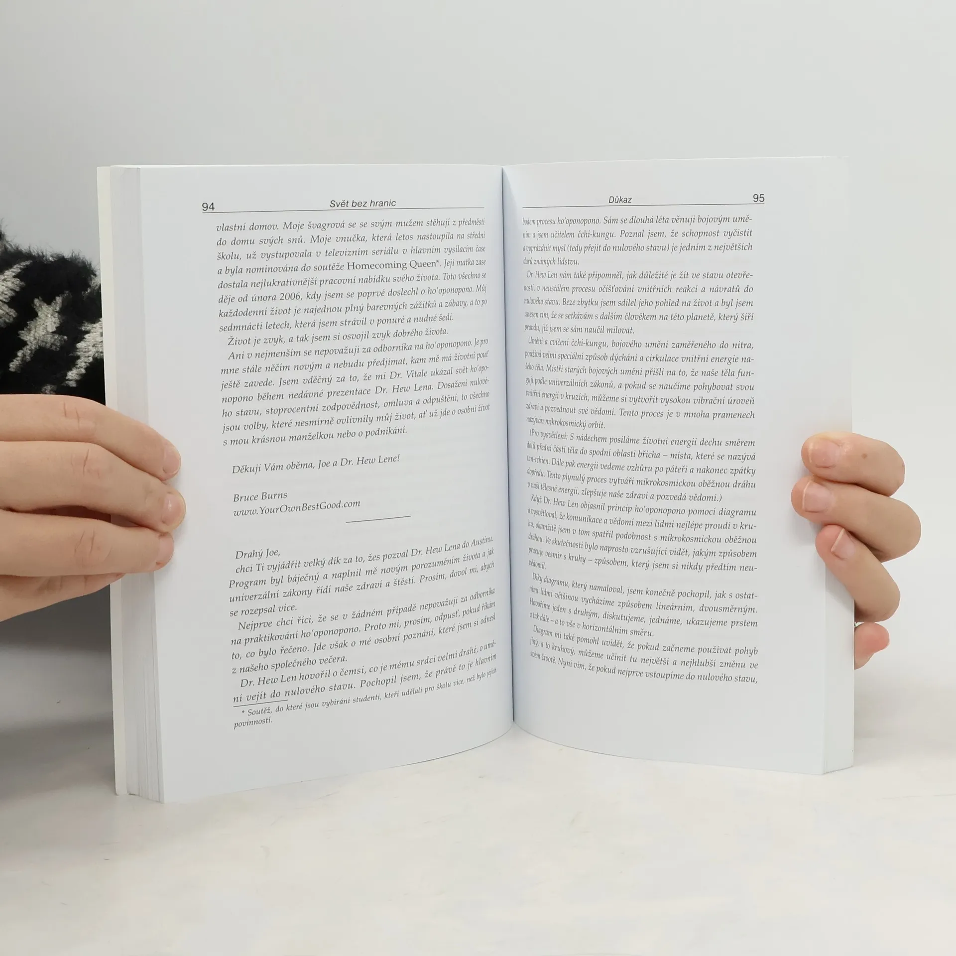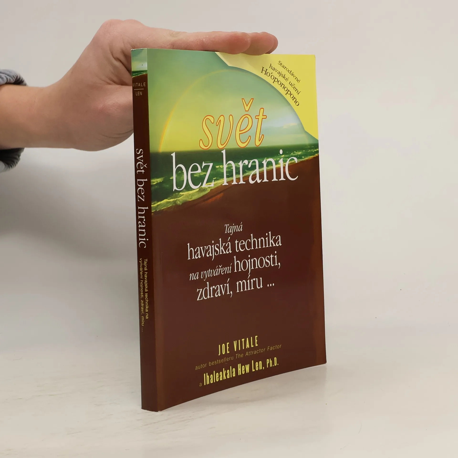 Joe Vitale, autor světového bestselleru Síla přitažlivosti, ve své další knize Svět bez hranic vypráví neobyčejný příběh Dr. Ihaleakala Hew Lena, terapeuta, který vyléčil celé oddělení mentálně postižených recidivistů, aniž by kteréhokoliv z nich viděl. Kniha popisuje jeho metodu. Popisuje skutečnou příčinu všeho, co se vám přihodí a jak "očistit" negativitu, abyste se mohli znovu spojit s Božskou podstatou. "Dr. Hew Len mi vysvětlil, že přijmout absolutní zodpovědnost za svůj život, tedy za vše, co se v mém životě objeví, znamená uznat, že vše kolem mne je mým vlastním výtvorem." Vím, že to je obtížné to pochopit, natož to přijmout nebo podle toho opravdu žít. Vinit druhé nebo své okolí je mnohem snažší, než přijmout naprostou zodpovědnost. Během rozhovoru s Hew Lenem jsem začal chápat, že léčení z jeho pohledu a v duchu ho'oponopono znamená milovat sám sebe. Chcete-li zlepšit svůj život, musíte jej vyléčit. Chcete-li někoho uzdravit, a může jít klidně o mentálně chorého vězně, musíte nejprve vyléčit sebe." Joe Vitale Kniha Svět bez hranic je jednou z nejúchvatnějších knih, která kdy vůbec byla napsána.