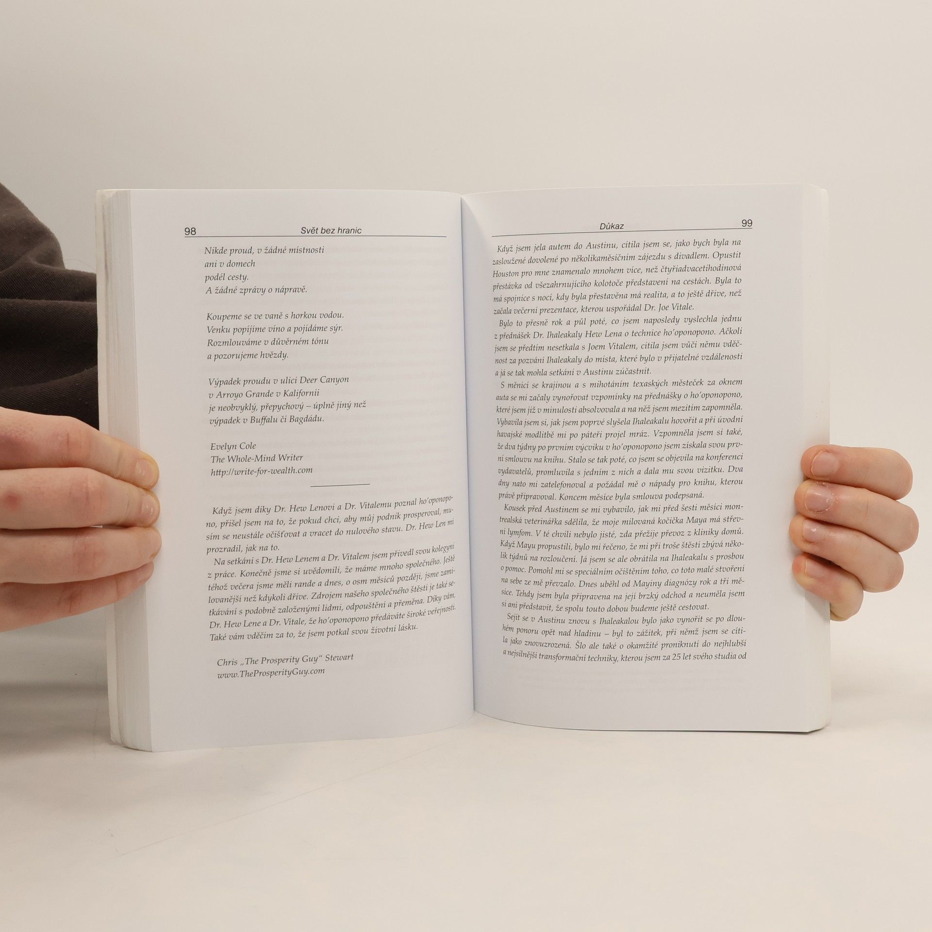 Joe Vitale, autor světového bestselleru Síla přitažlivosti, ve své další knize Svět bez hranic vypráví neobyčejný příběh Dr. Ihaleakala Hew Lena, terapeuta, který vyléčil celé oddělení mentálně postižených recidivistů, aniž by kteréhokoliv z nich viděl. Kniha popisuje jeho metodu. Popisuje skutečnou příčinu všeho, co se vám přihodí a jak "očistit" negativitu, abyste se mohli znovu spojit s Božskou podstatou. "Dr. Hew Len mi vysvětlil, že přijmout absolutní zodpovědnost za svůj život, tedy za vše, co se v mém životě objeví, znamená uznat, že vše kolem mne je mým vlastním výtvorem." Vím, že to je obtížné to pochopit, natož to přijmout nebo podle toho opravdu žít. Vinit druhé nebo své okolí je mnohem snažší, než přijmout naprostou zodpovědnost. Během rozhovoru s Hew Lenem jsem začal chápat, že léčení z jeho pohledu a v duchu ho'oponopono znamená milovat sám sebe. Chcete-li zlepšit svůj život, musíte jej vyléčit. Chcete-li někoho uzdravit, a může jít klidně o mentálně chorého vězně, musíte nejprve vyléčit sebe." Joe Vitale Kniha Svět bez hranic je jednou z nejúchvatnějších knih, která kdy vůbec byla napsána.